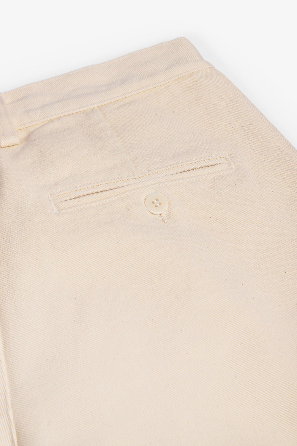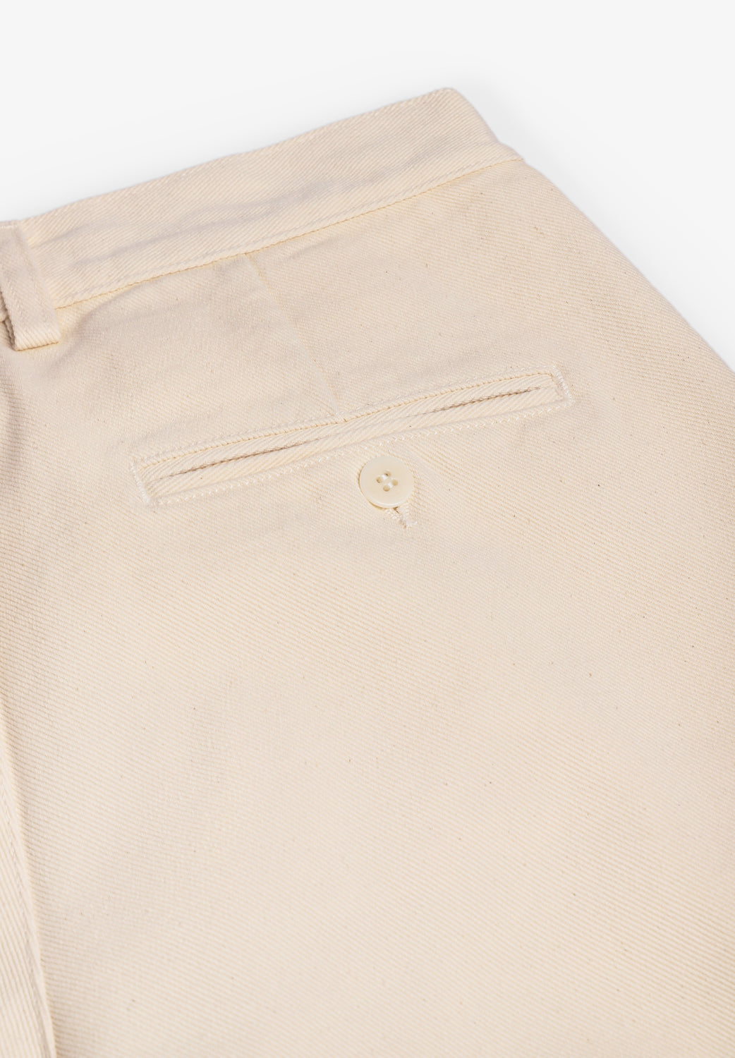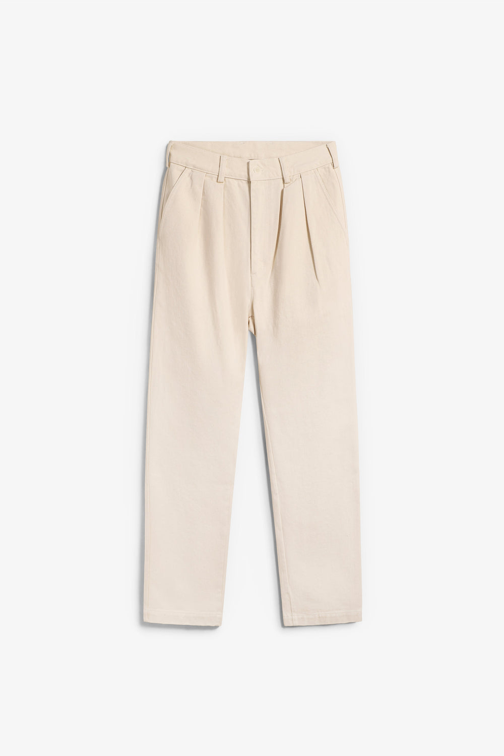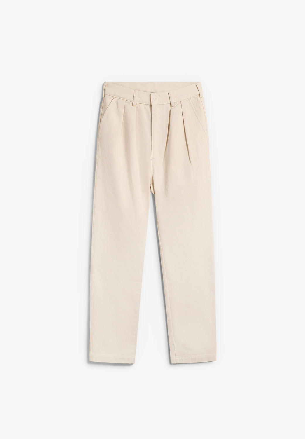 Calças La Paz confecionadas em 100% algodão orgânico e ajuste folgado. Com uma frente plissada e discretos bolsos abotoados na parte de trás, tecido grosso e botões de corozo.