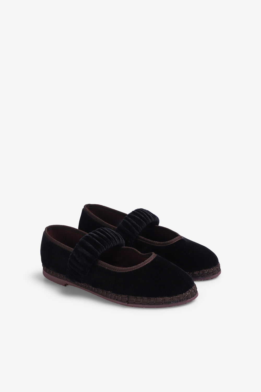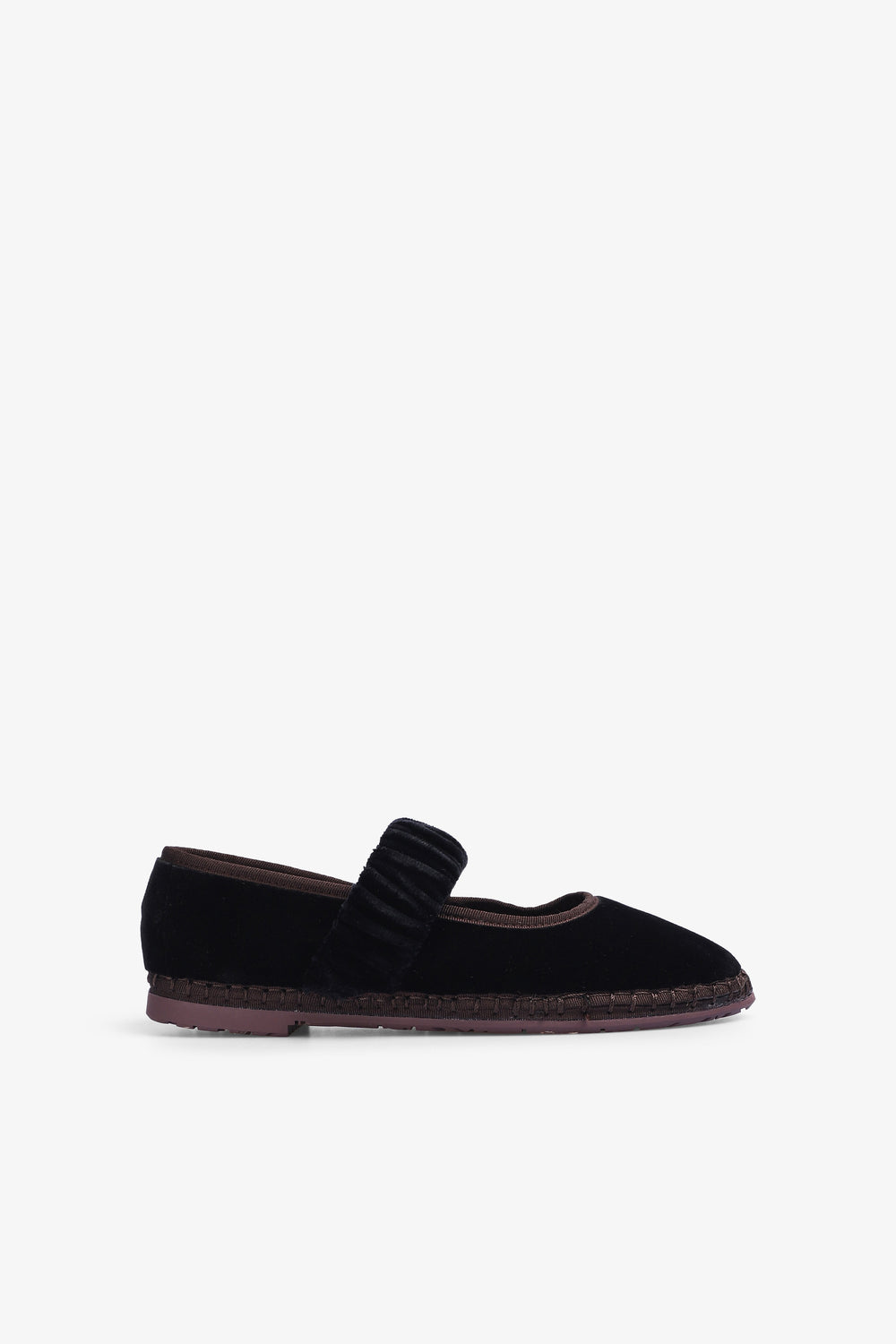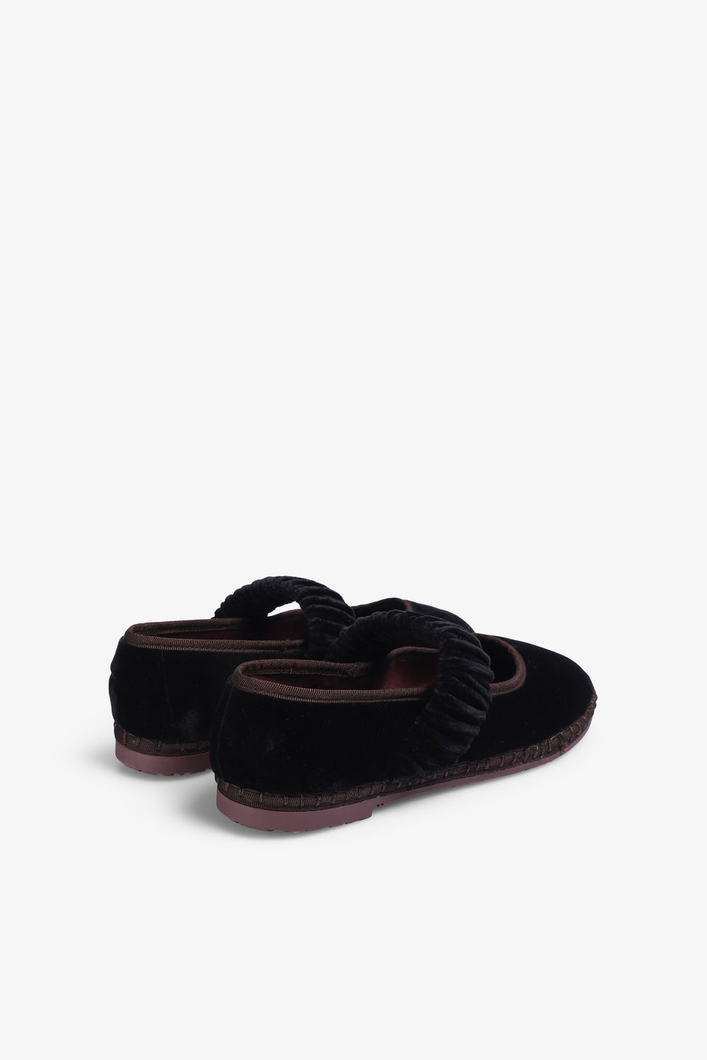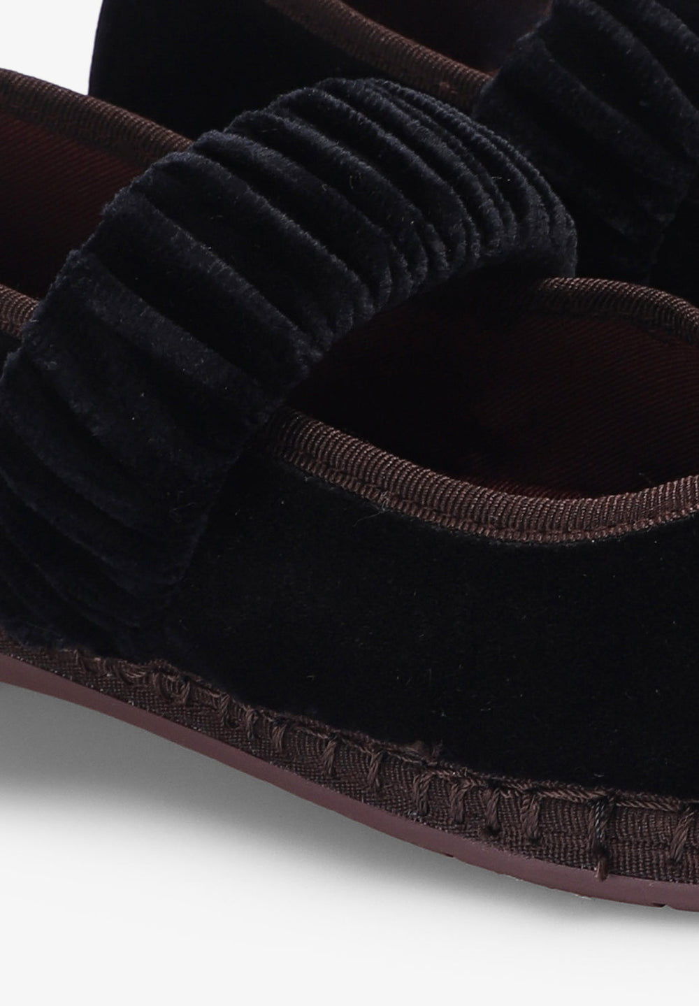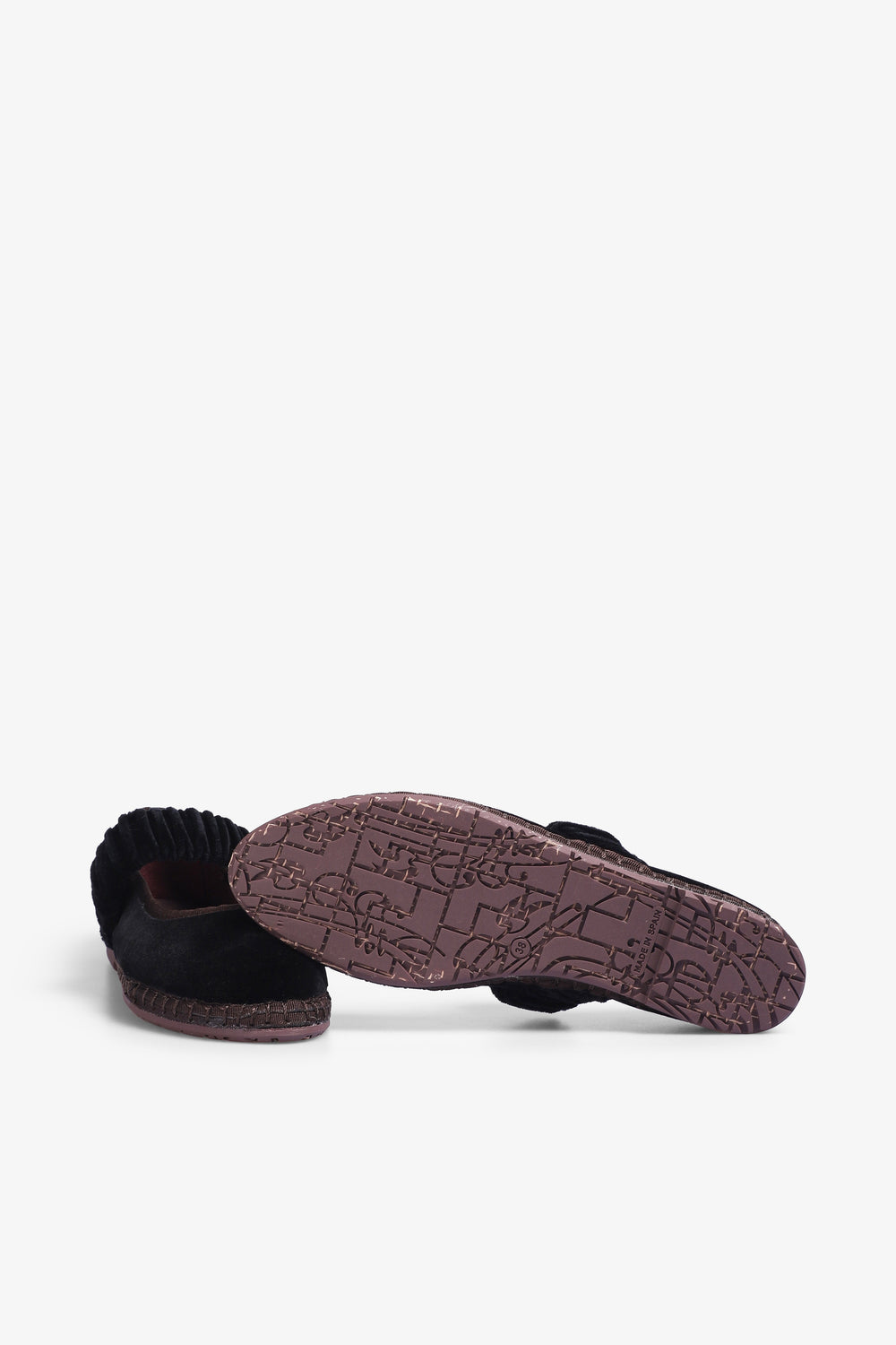 Slippers Flabelus de veludo em preto com debruns castanhos e elástico de veludo preto. O interior é 100% algodão orgânico com tratamento antibacteriano e a sola é feita de caucho reciclado.