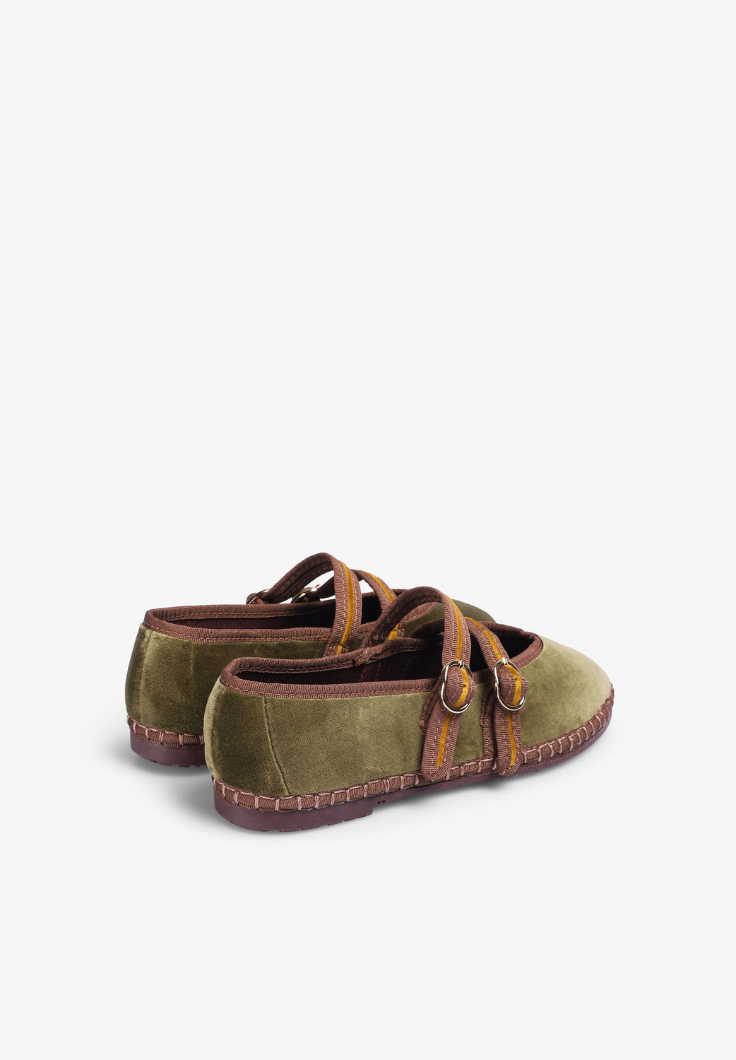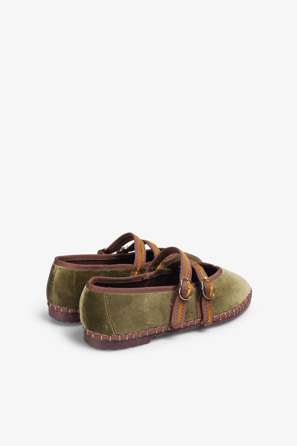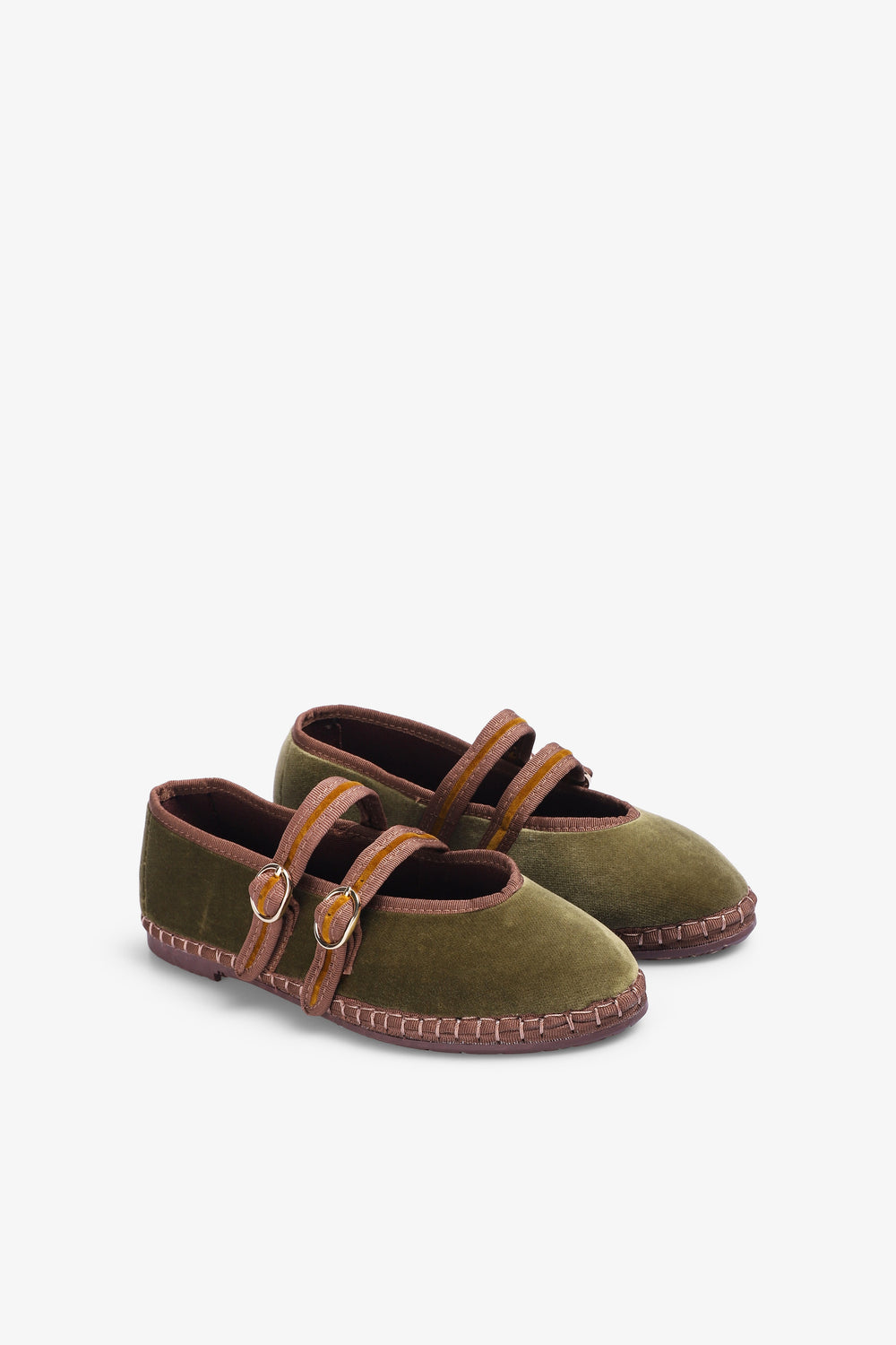 Slippers Flabelus de veludo em mostarda com debrum bege escuro e tira dupla em veludo castanho com fecho de fivela. O interior do sapato é 100% algodão orgânico com tratamento antibacteriano e a sola é feita de caucho reciclado.