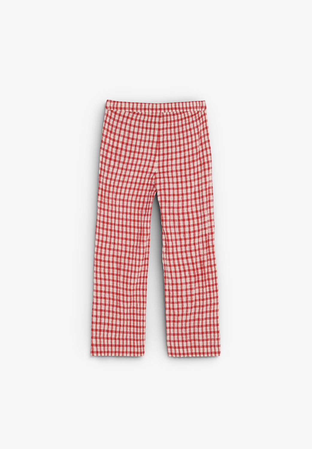 Calças confecionadas em 100% algodão BCI. Relaxed fit. Padrão vichy. Fecho com botão e bolsos laterais.