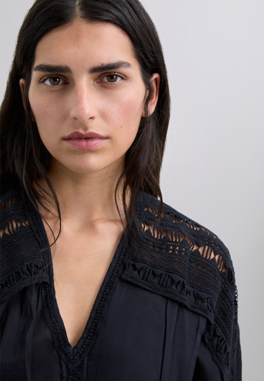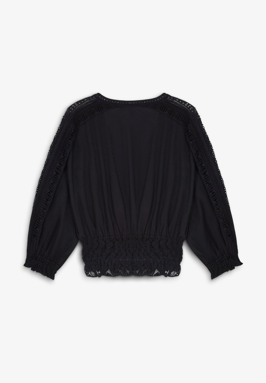 Top confeccionado en 100% algodón con detalles de bordados y frunces. Corte regular fit, escote en V, manga francesa ligeramente abullonada terminada en puño con frunce. Detalles de piping bordados en escote, hombros y mangas. Frunces en cintura.