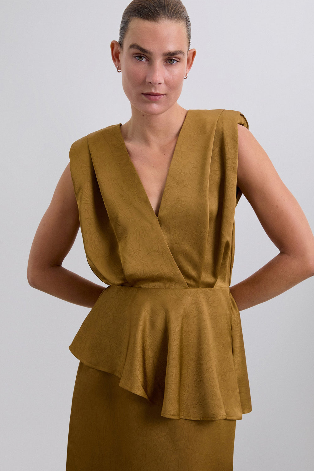 Top confecionado em tecido fluido com textura. Corte regular fit, decote em V e manga cava e ombreira ligeira. Plissados no peito, cingido na cintura e com folho na bainha.