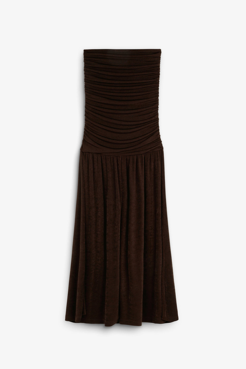 Vestido confecionado em malha fina ligeiramente elástica. Corte slim fit, sem alças, corpo com pormenor de franzidos. Corte midi.