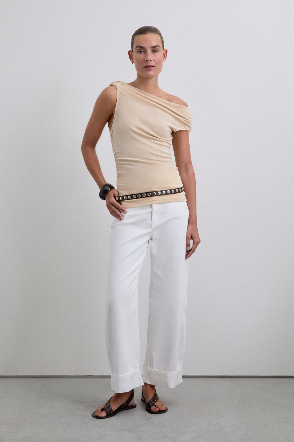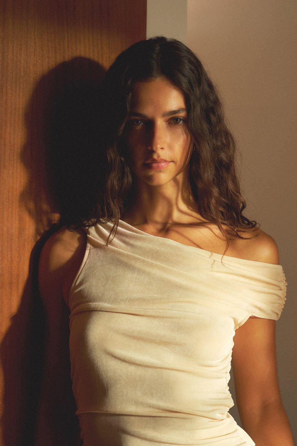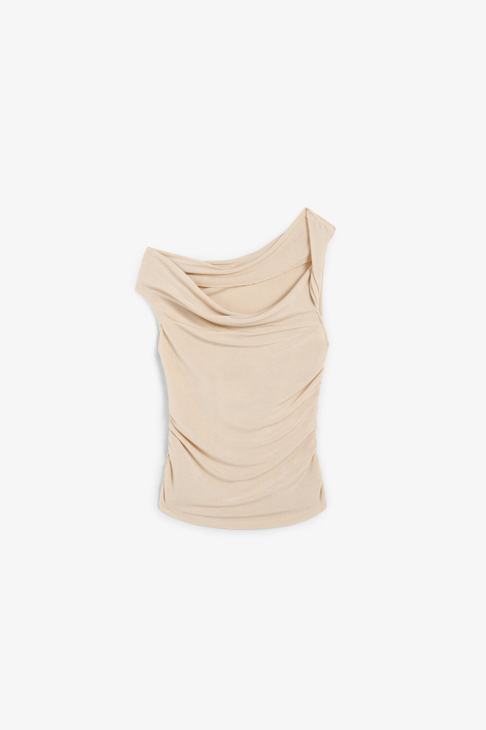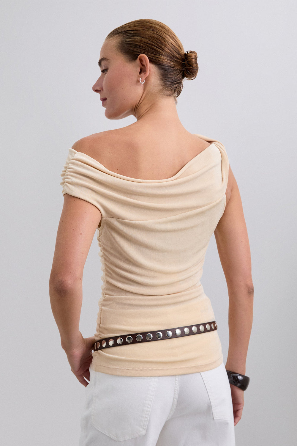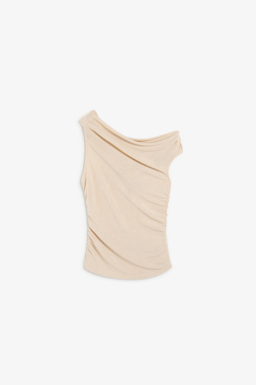 Top confecionado em tecido ligeiramente elástico. Corte slim fit, ombro descaído, decote assimétrico com franzidos nas laterais.