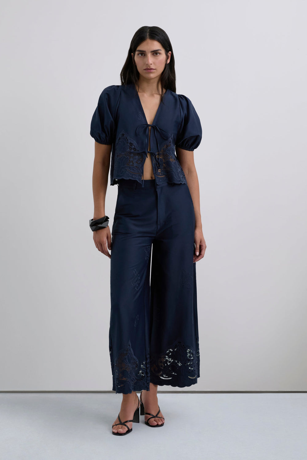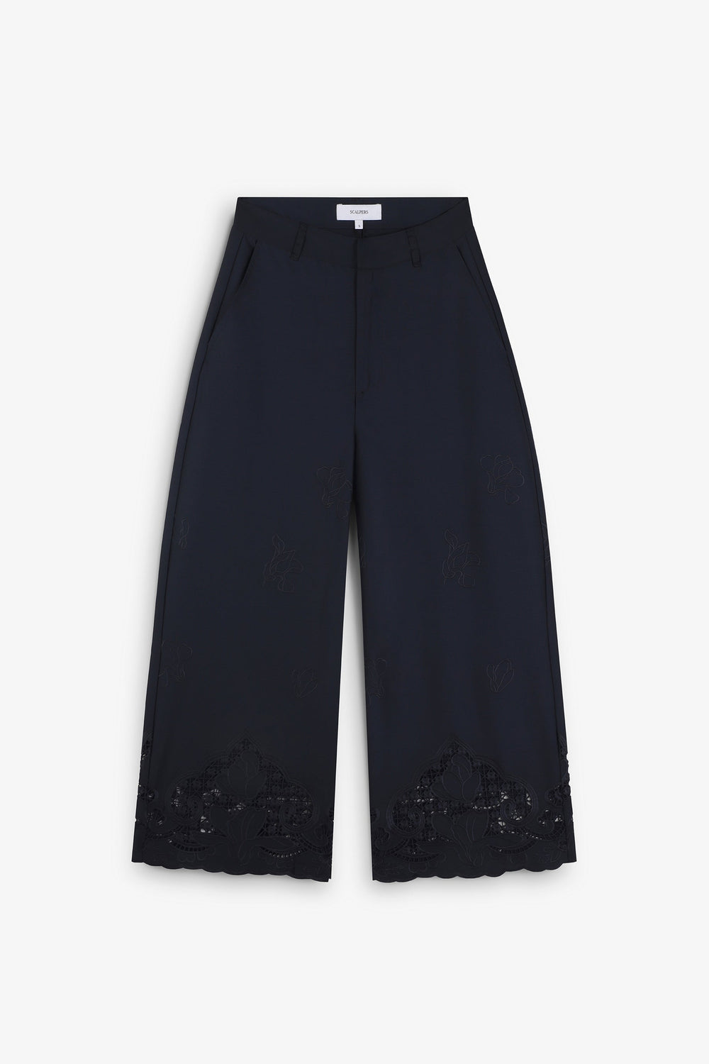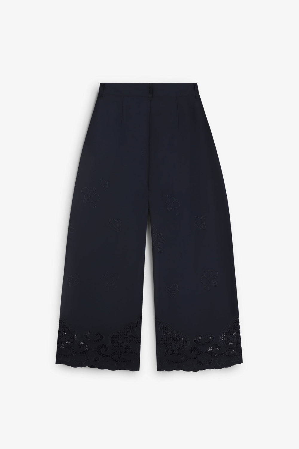 Calças compridas culotte. Bordado rendilhado em toda a perna, especialmente à volta da bainha. Bolsos frontais inclinados. Acabamento ligeiramente em volta.