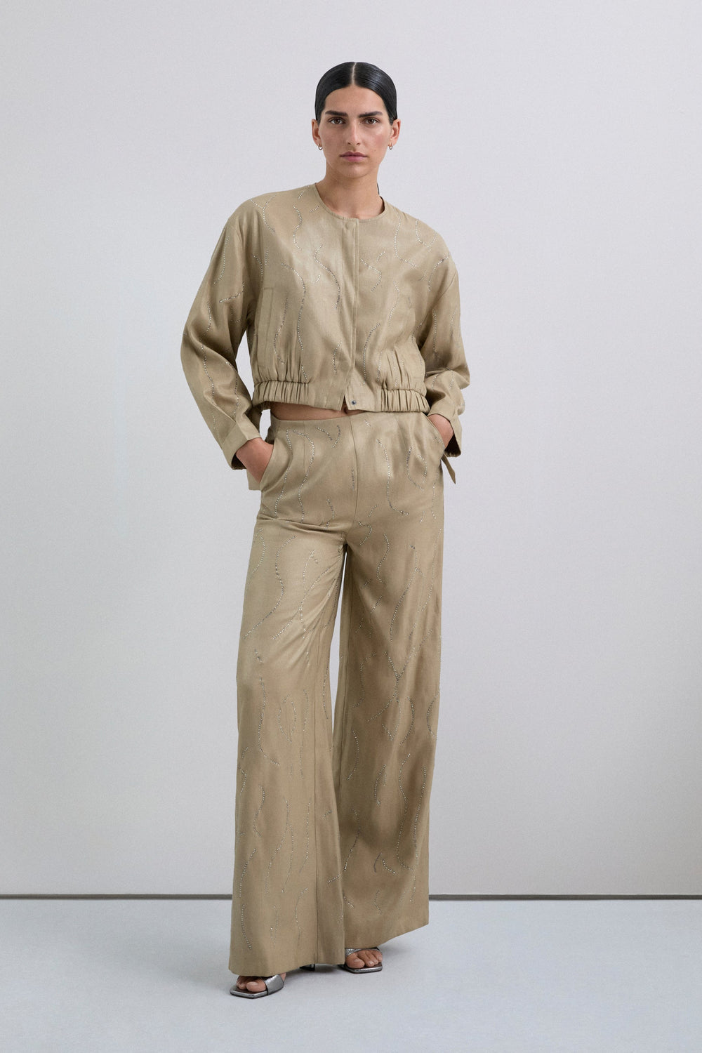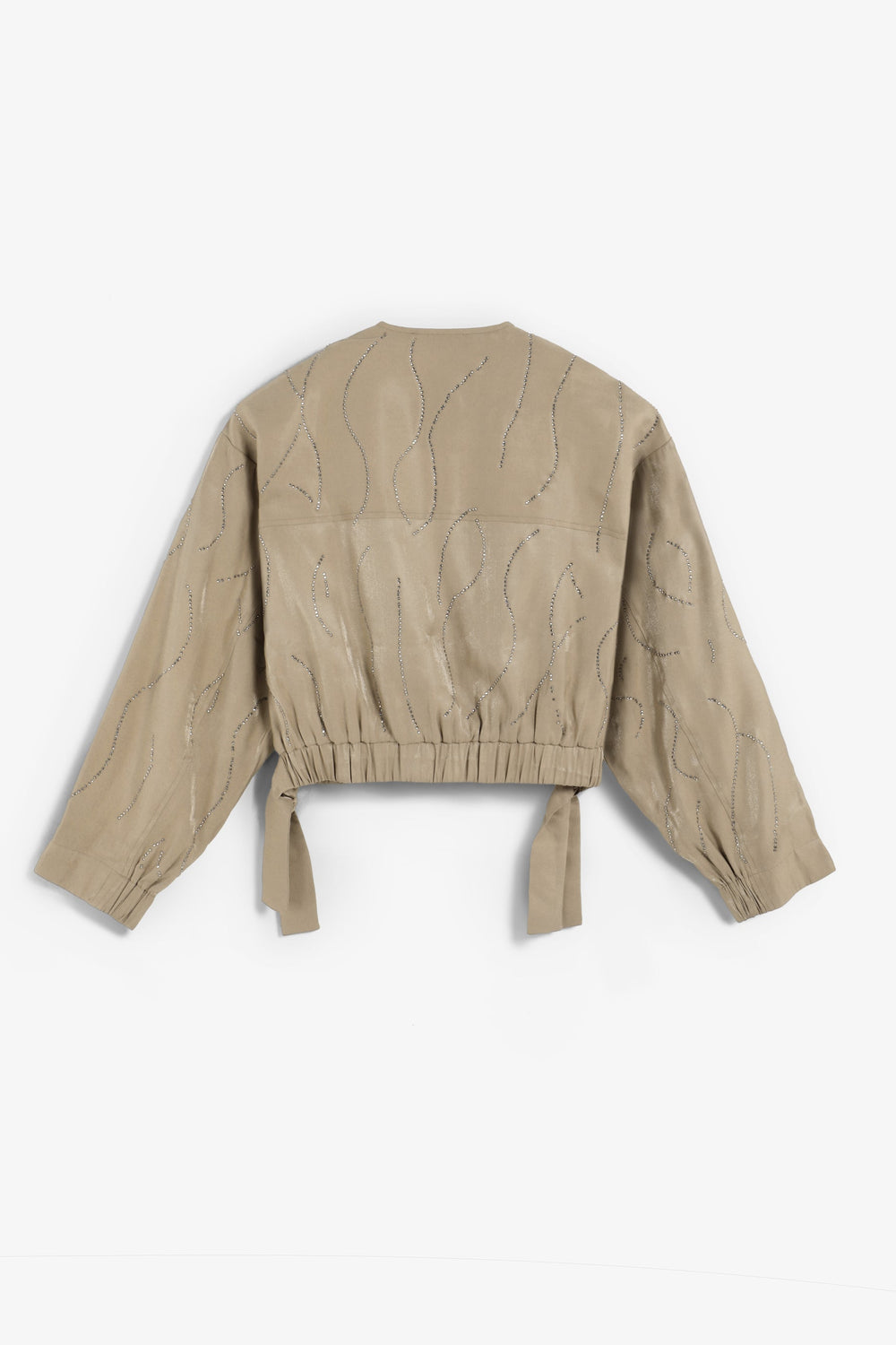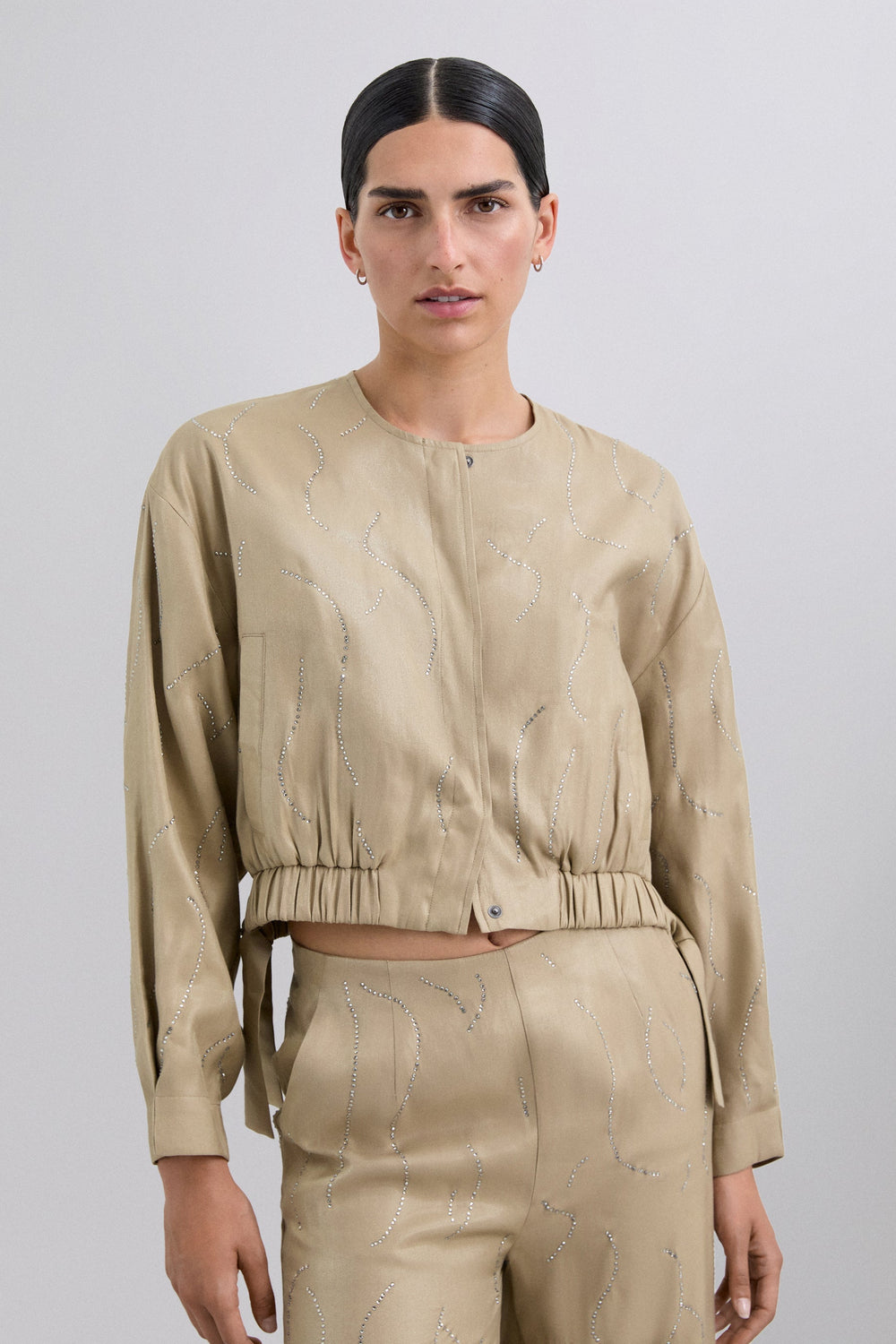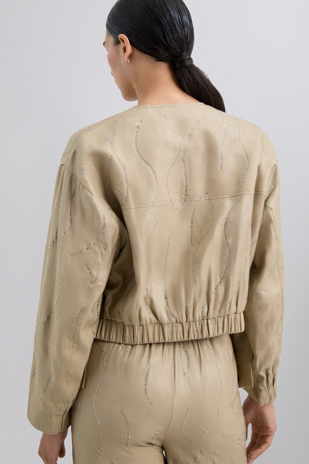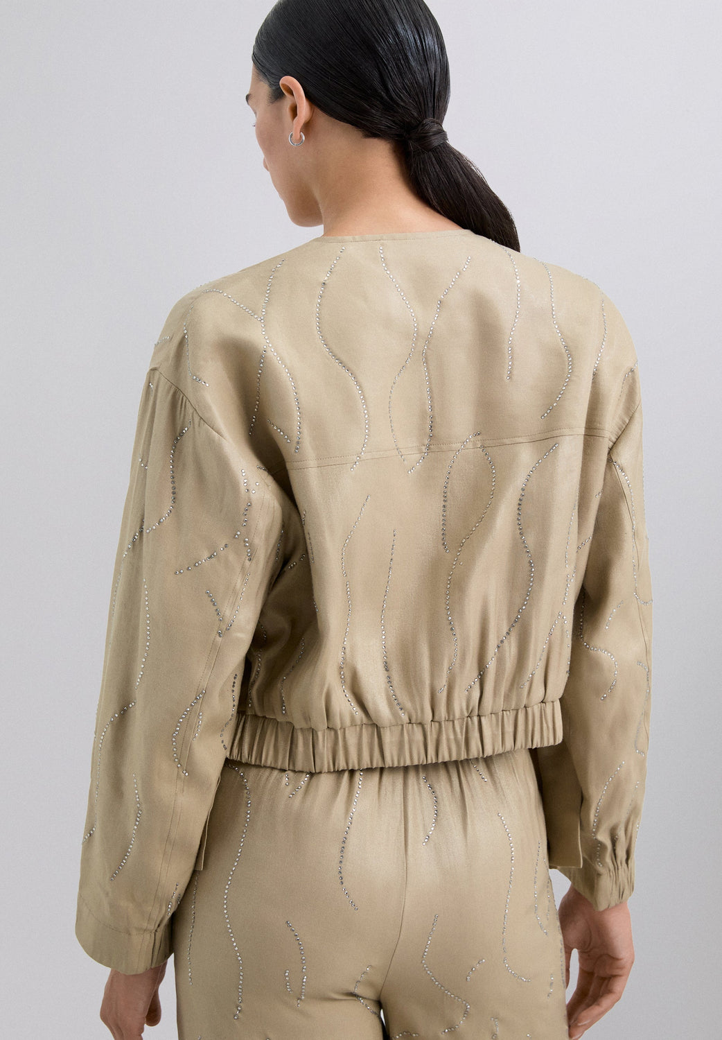 Cardigan bomber com pedras de strass. Fecho de correr e botões à frente. Decote redondo. Punhos e bainha franzidos. Tecido fluido com acabamento acetinado. Faixa elástica com pormenor de laço nas laterais.