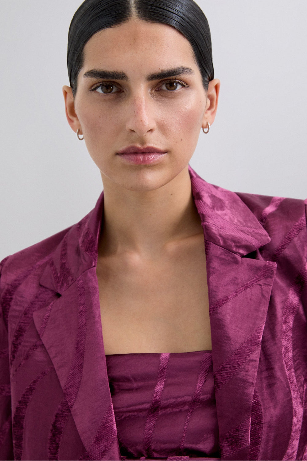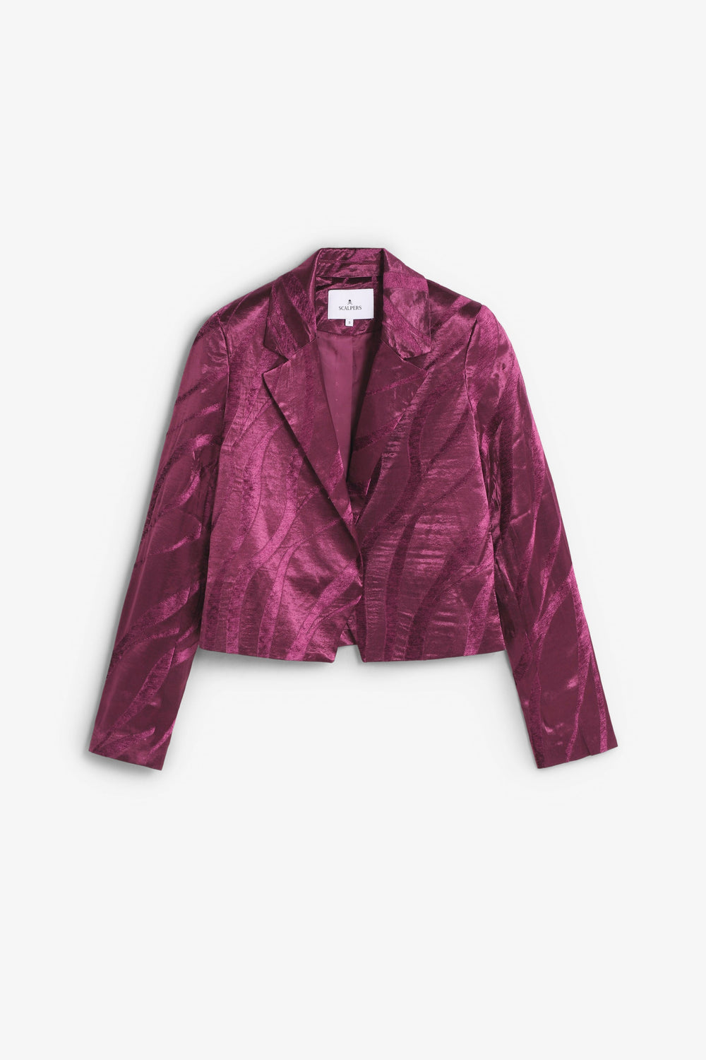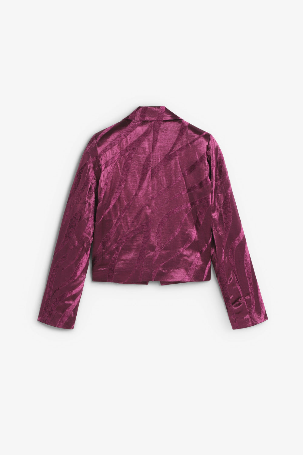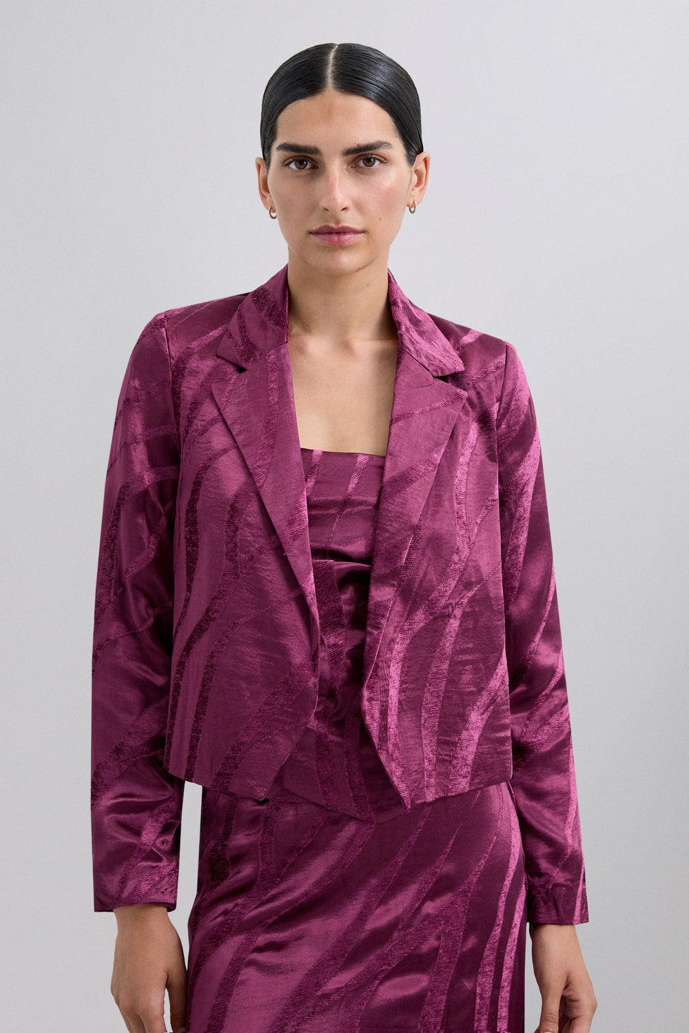 Blazer cropped com estampado jacquard. Regular fit, gola com aba. Manga comprida.