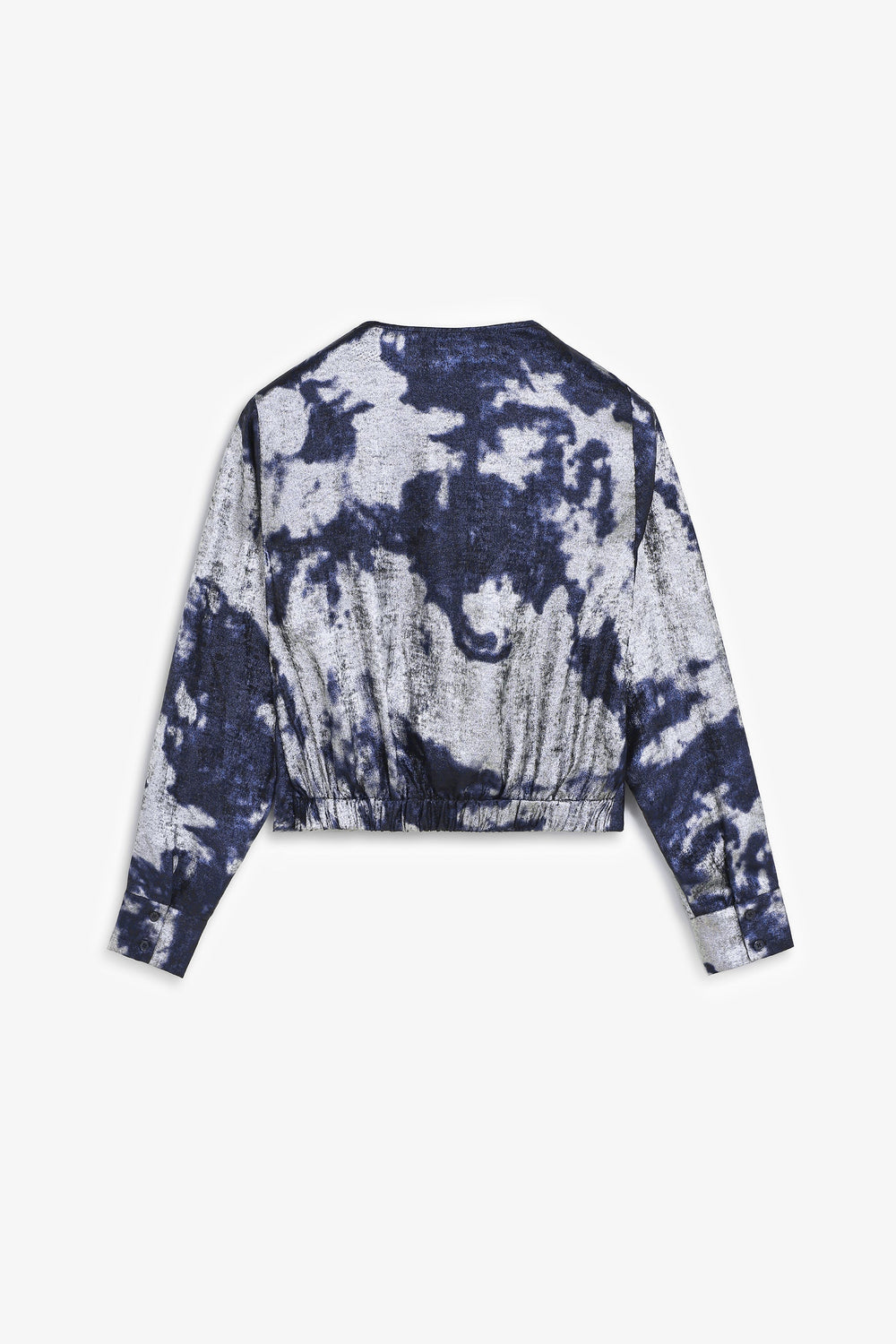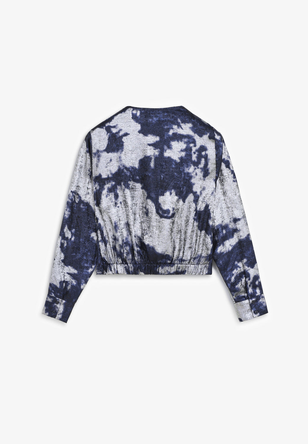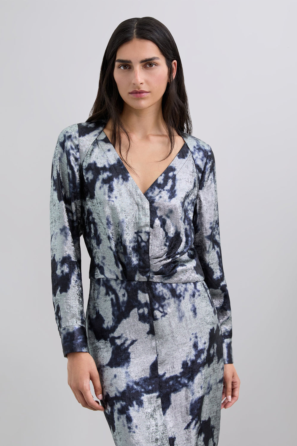 Blusa confecionada em tecido fluido com estampado tie-dye e pormenores metalizados. Corte slim fit. Decote em V. Manga comprida. Ligeiramente cropped.