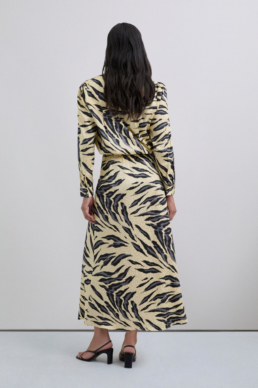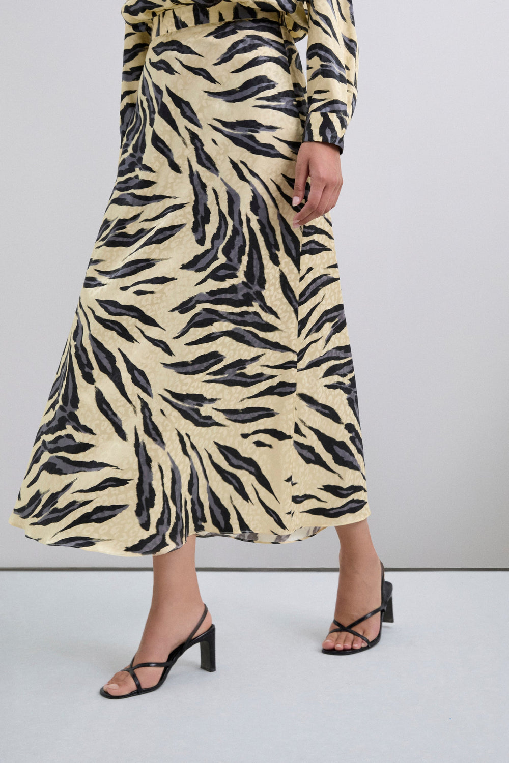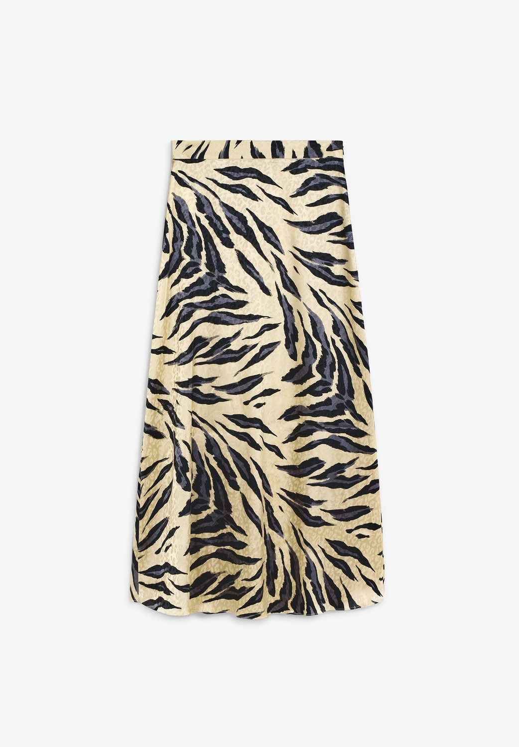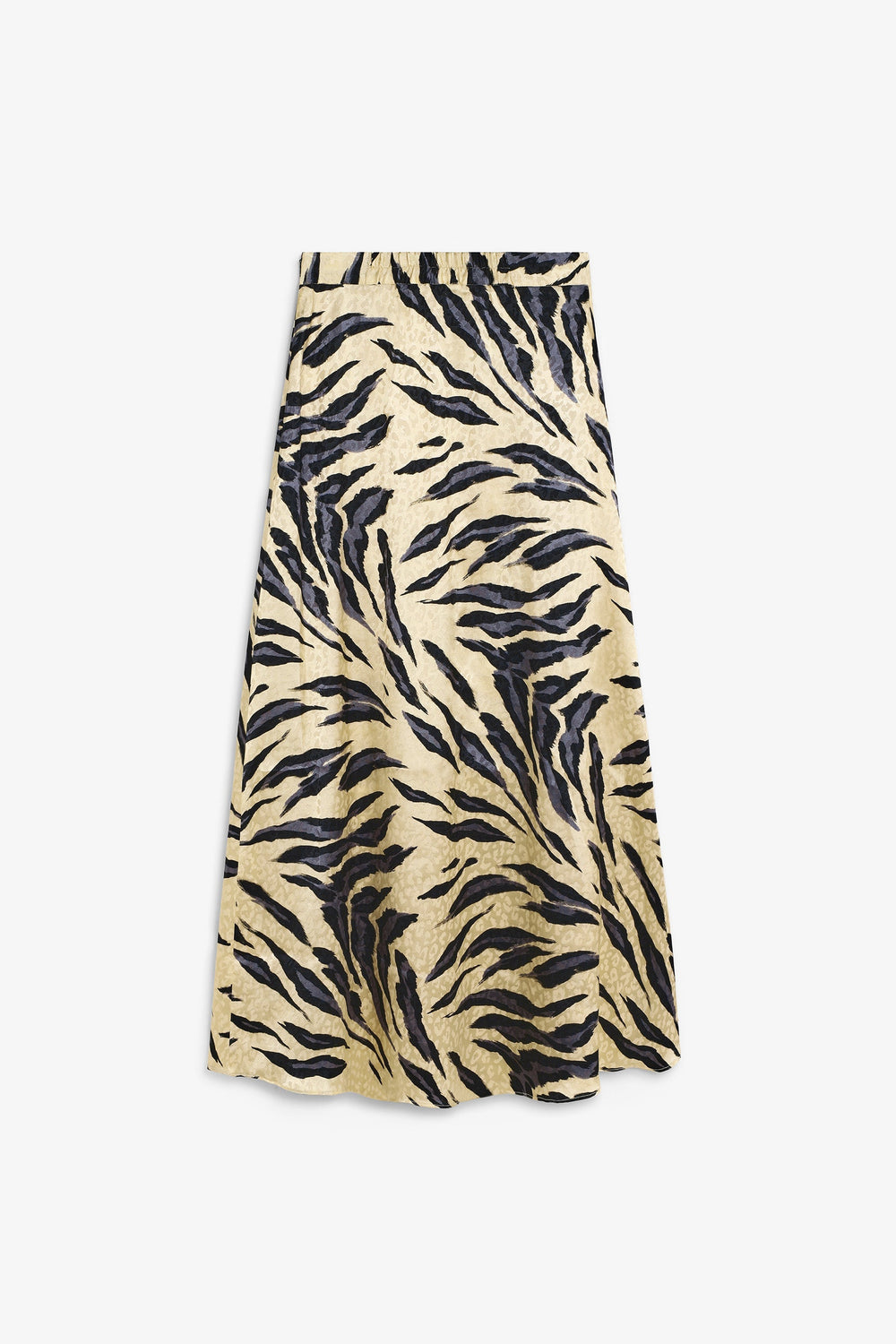 Saia midi. Padrão de estampado animal. Cintura elástica. Ondas na bainha.