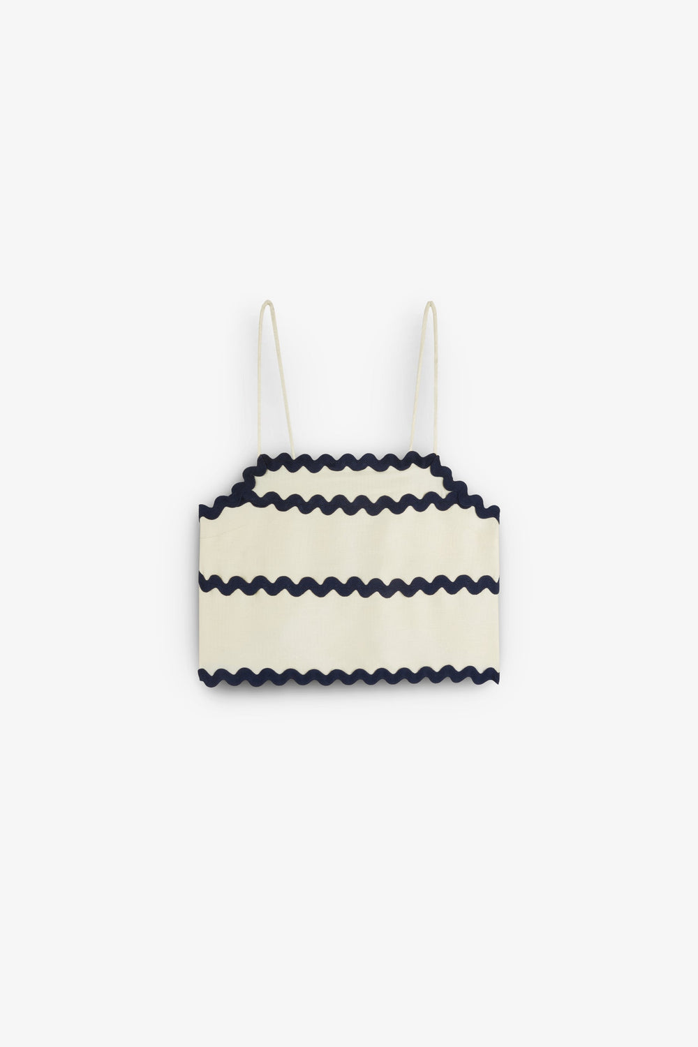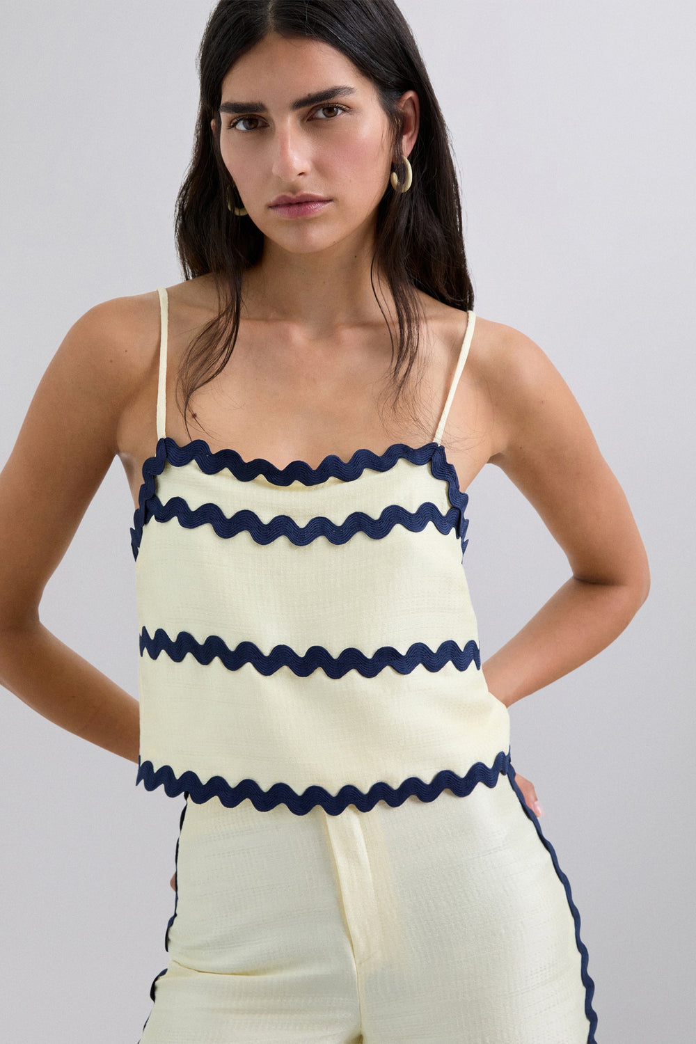 Top com alças finas e decote direito Pormenor ondulado em contraste. Corte cropped.