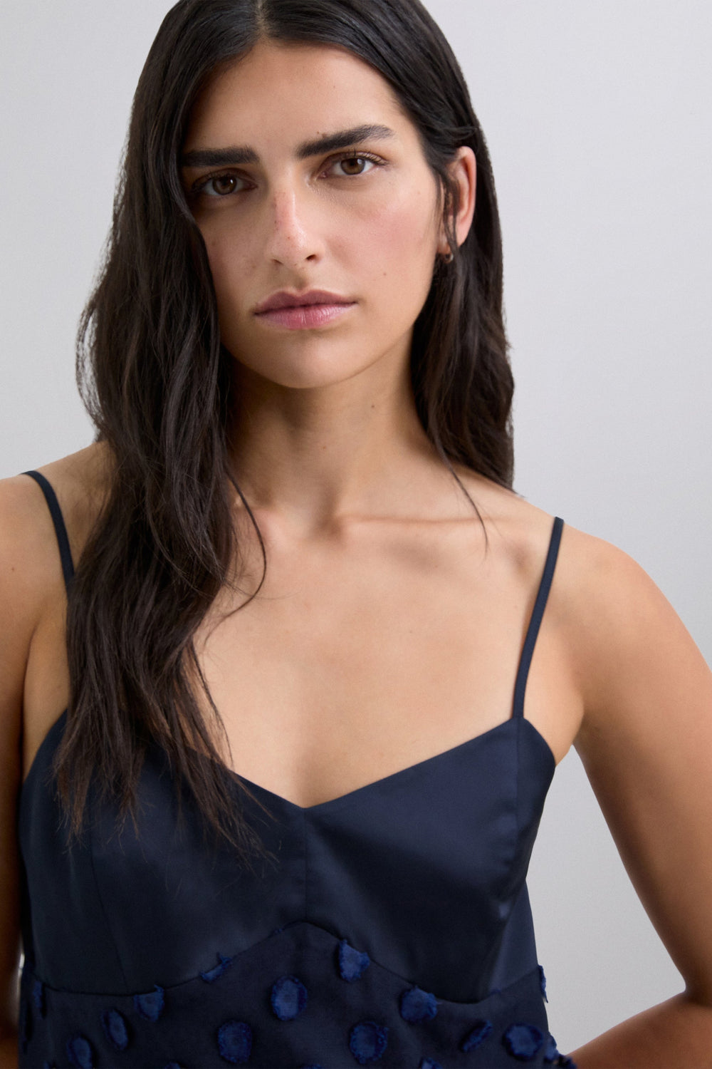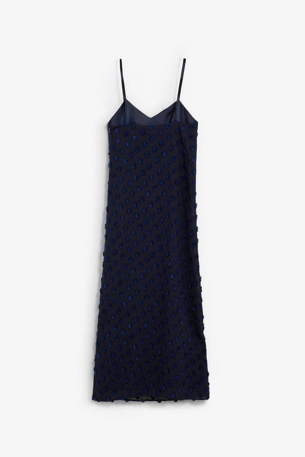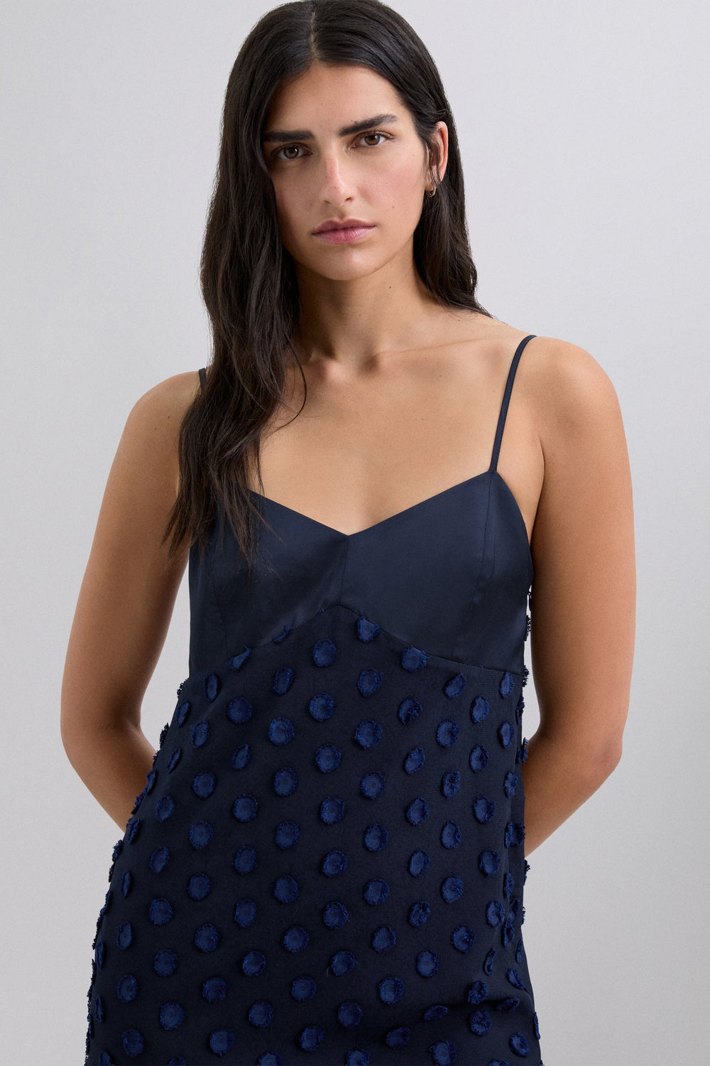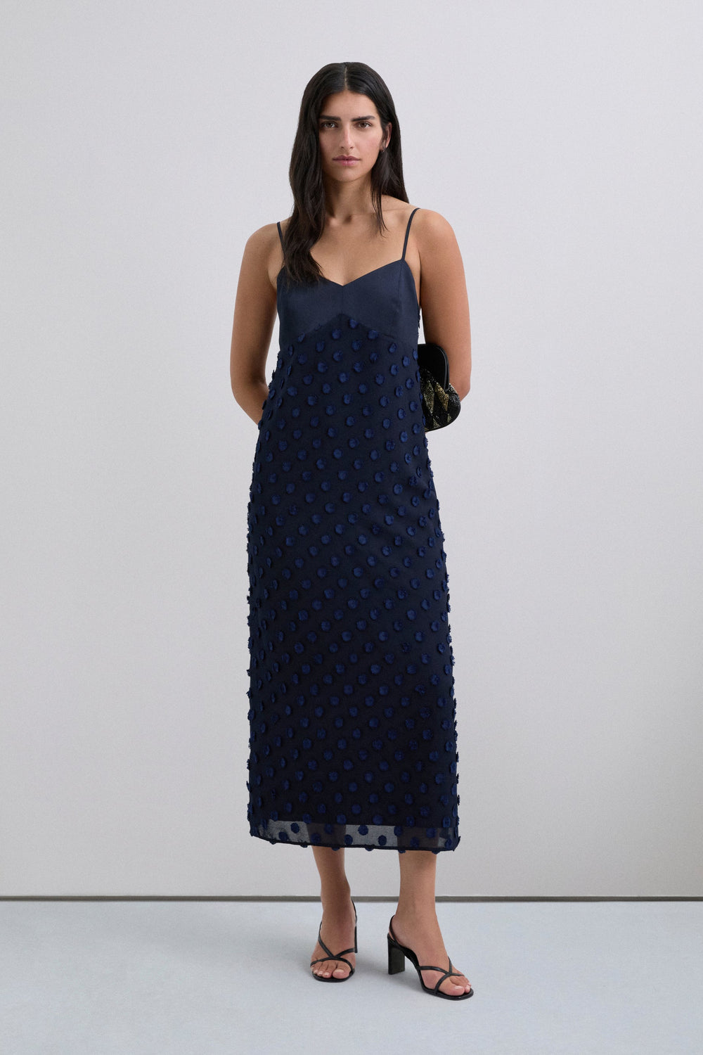 Vestido midi em tecido jacquard com estampado às bolinhas. Peça do corpete com acabamento acetinado. Com alças. Fecho lateral com fecho de correr.