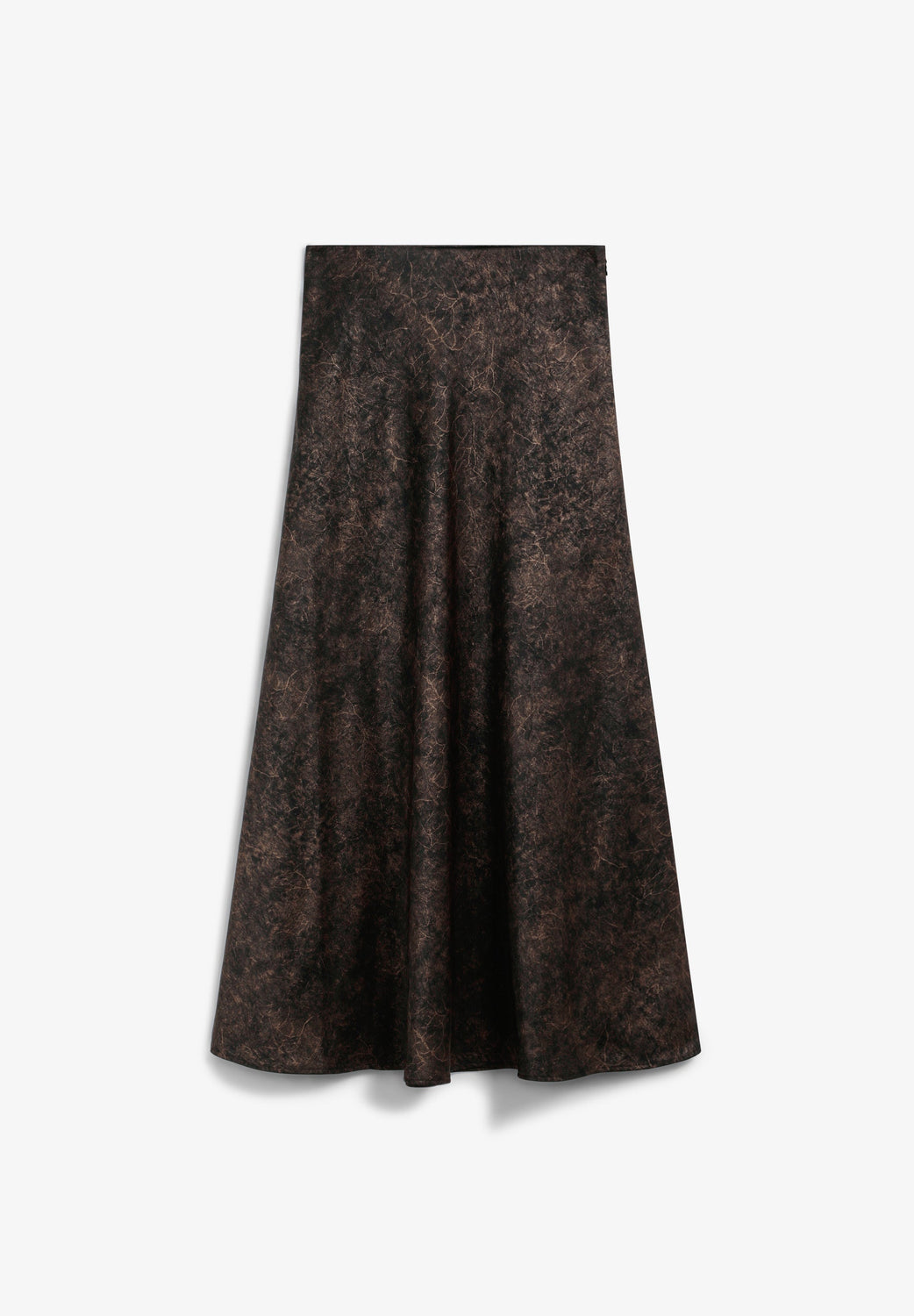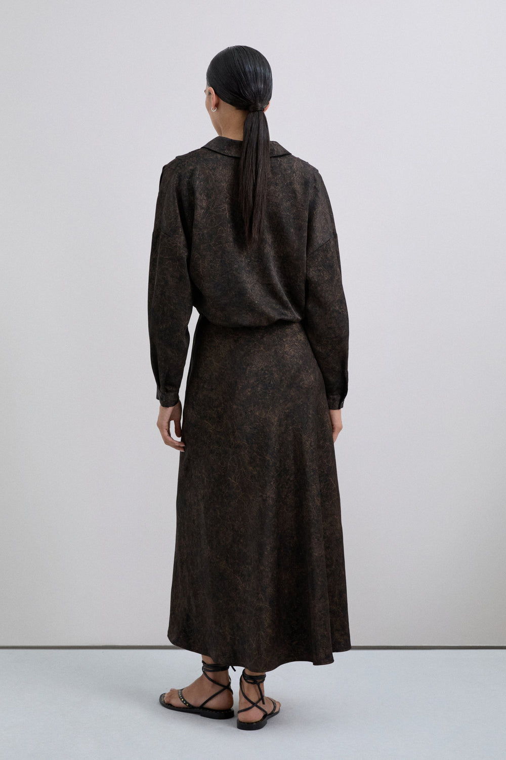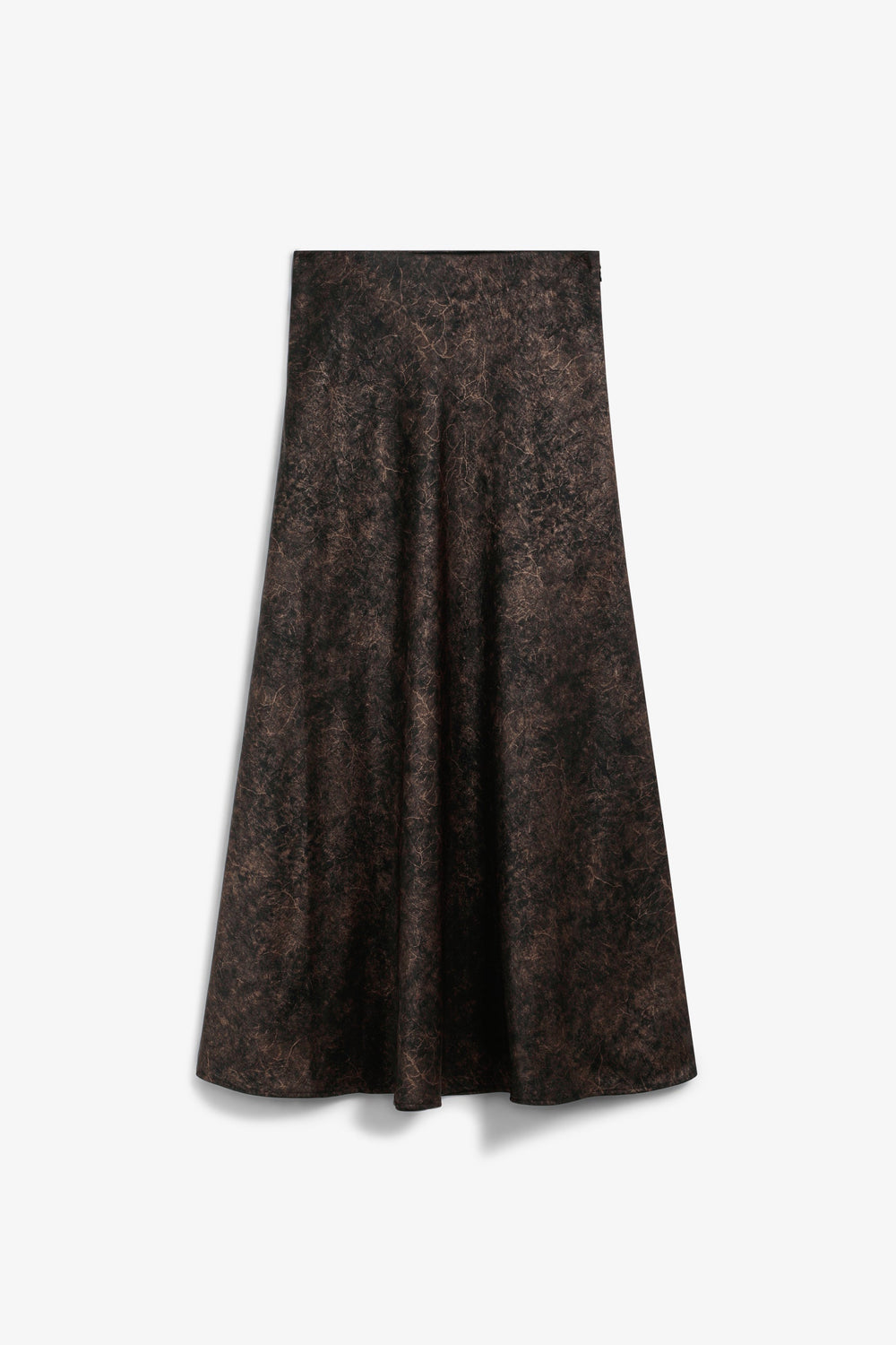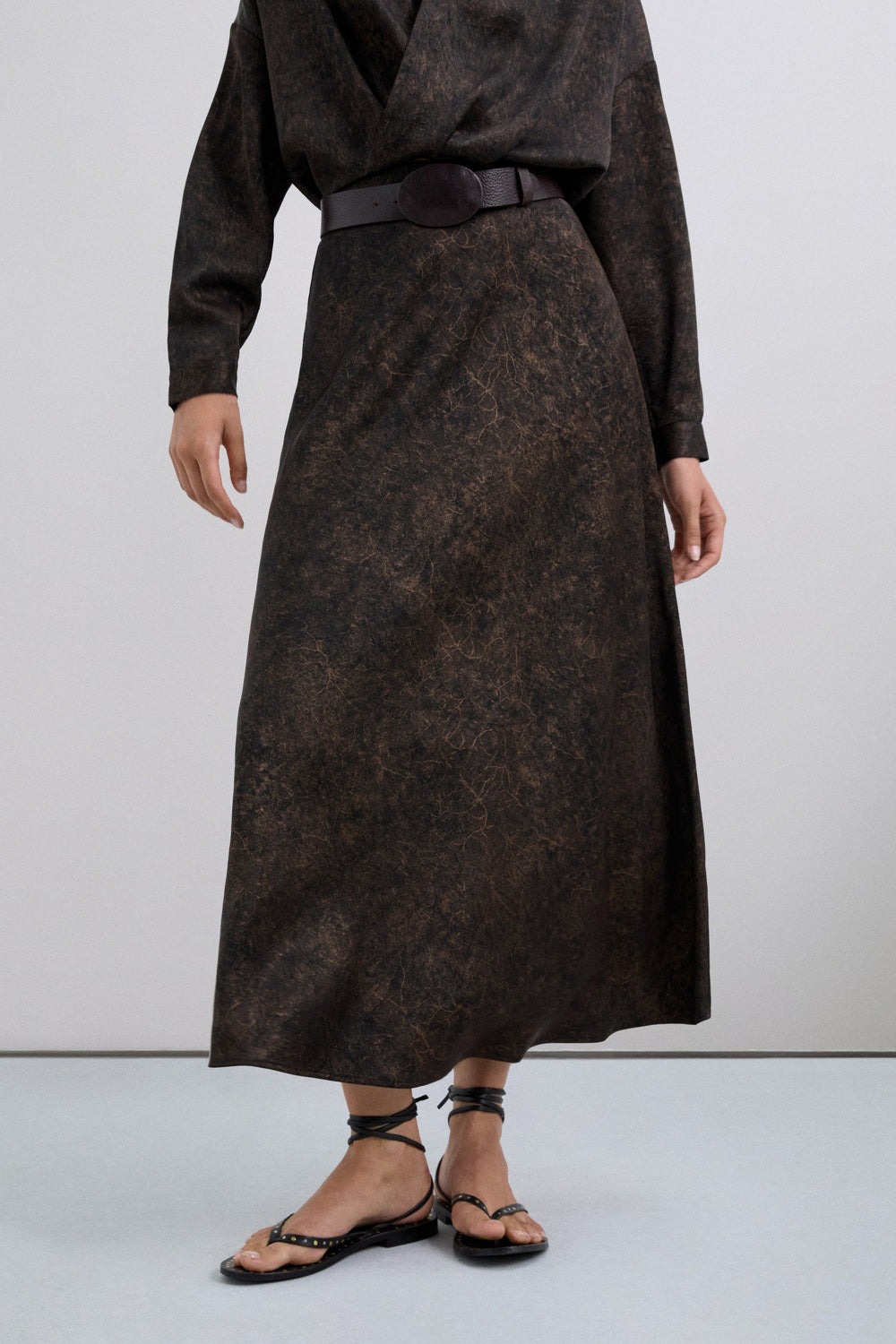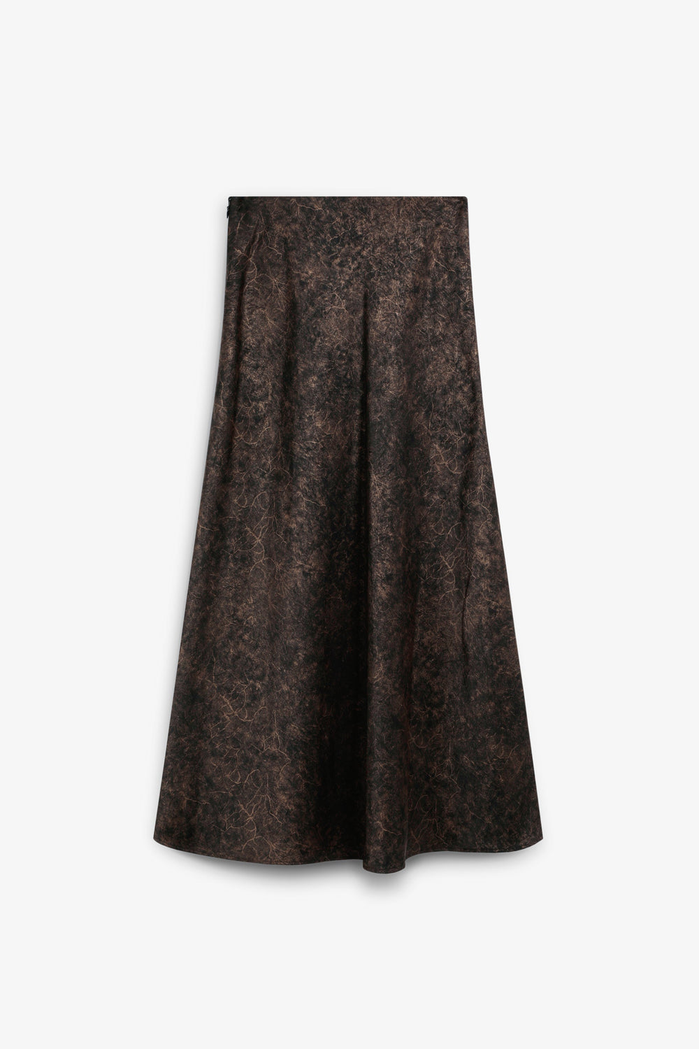 Saia confecionada em tecido fluido com acabamento acetinado. Padrão com efeito mármore. Regular fit. Corte midi. Fecho com zip lateral oculto.