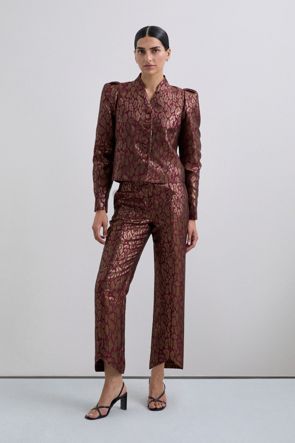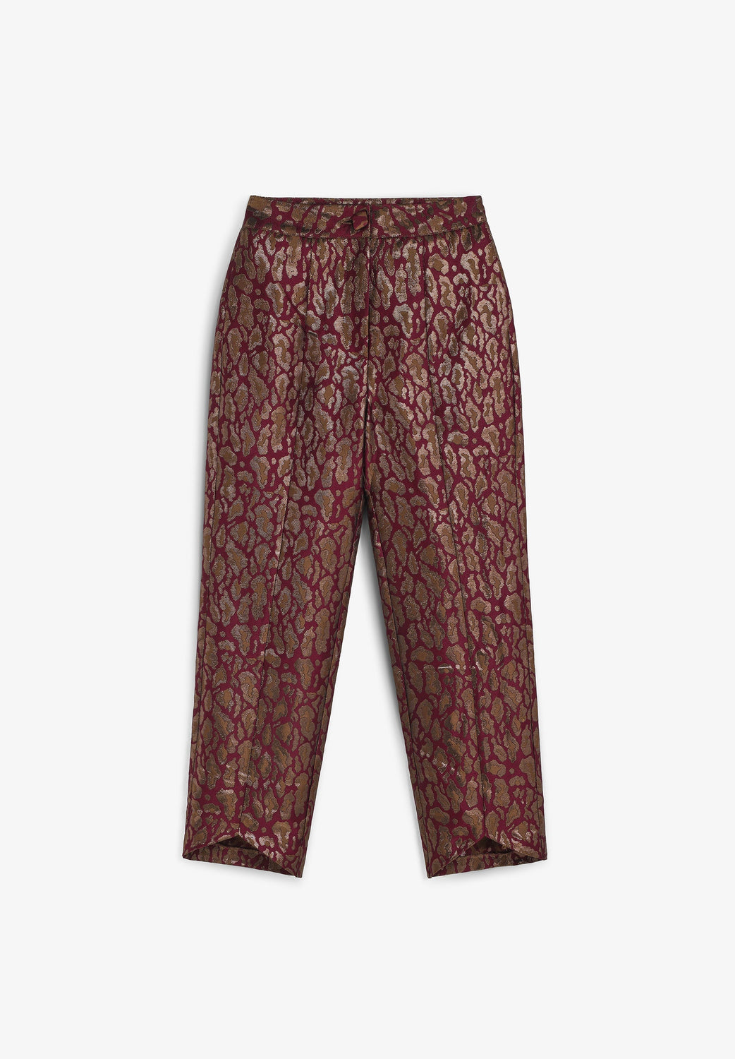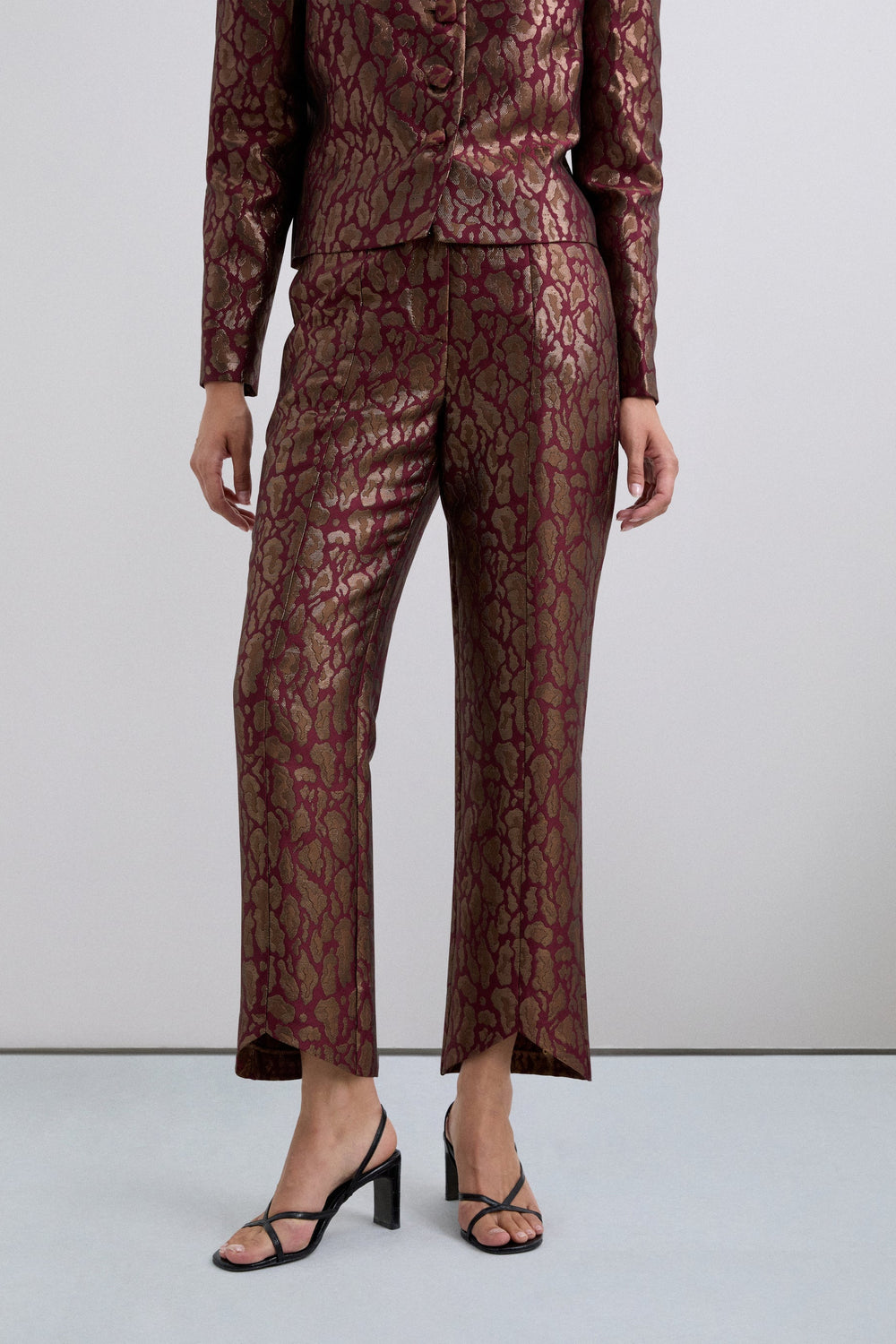 Calças confecionadas em tecido de efeito metalizado e padrão de estampado animal. Pormenor de costuras. Fecho de correr. Bainha das calças com design assimétrico.