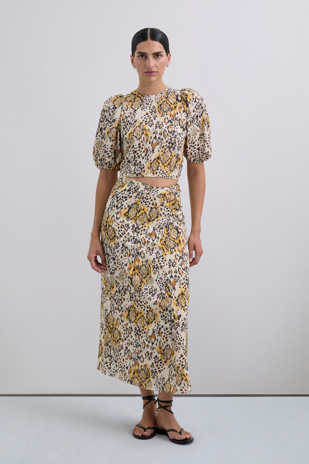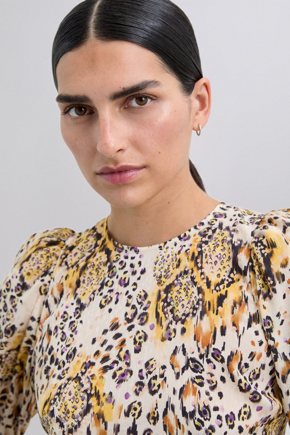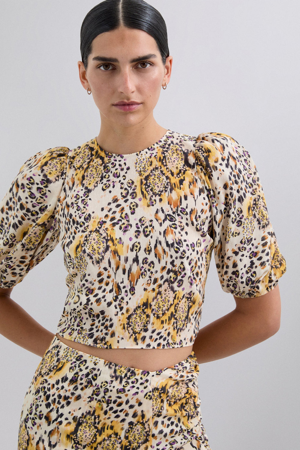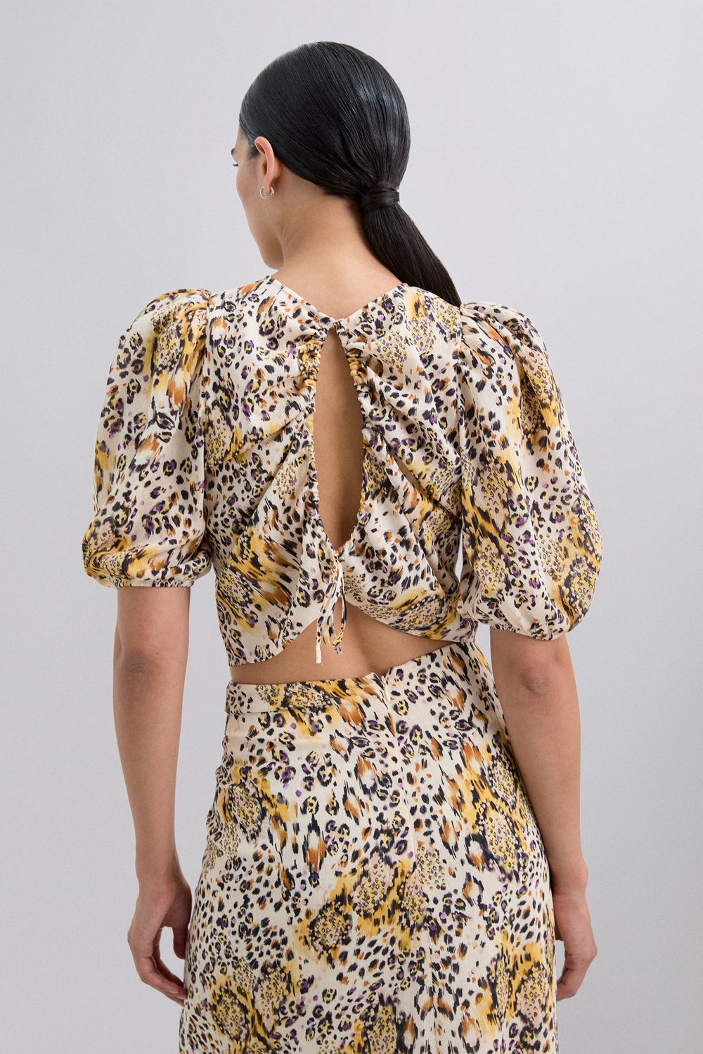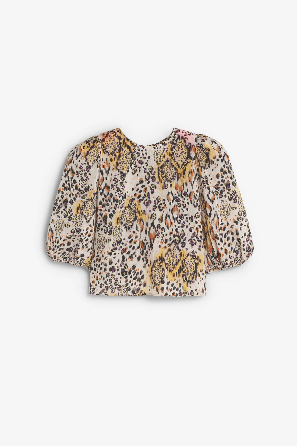 Top com estampado animal. Decote redondo e manga curta ligeiramente abalonada. Costas com fecho de laço.