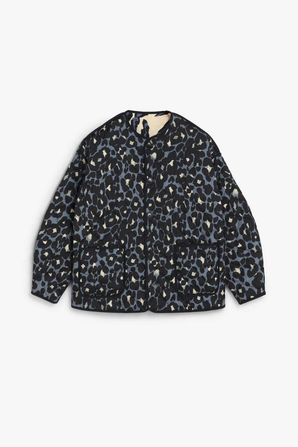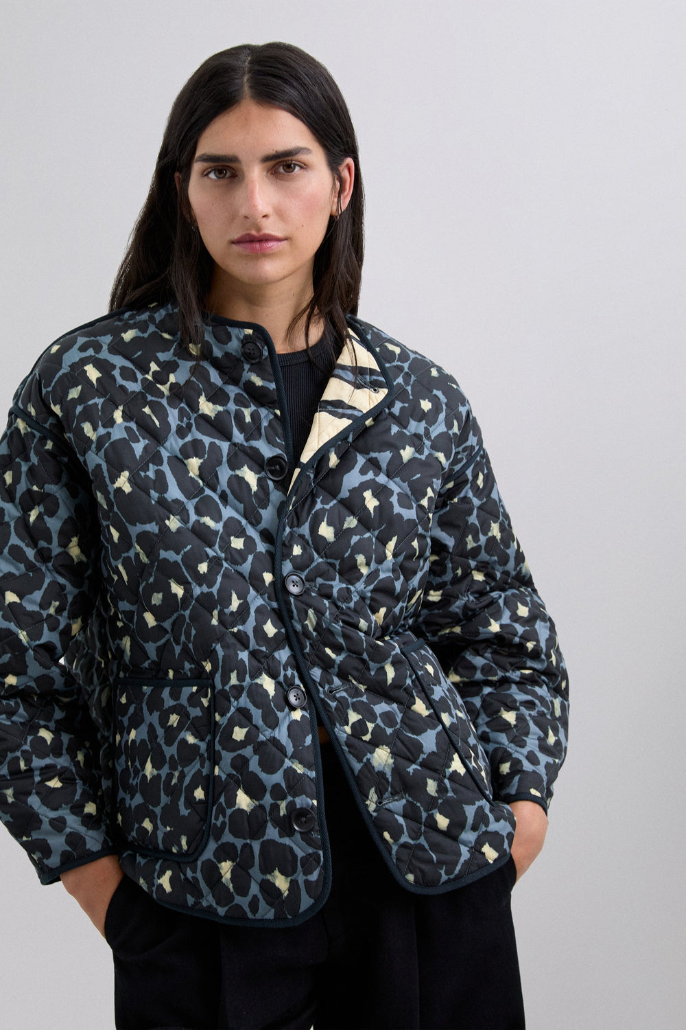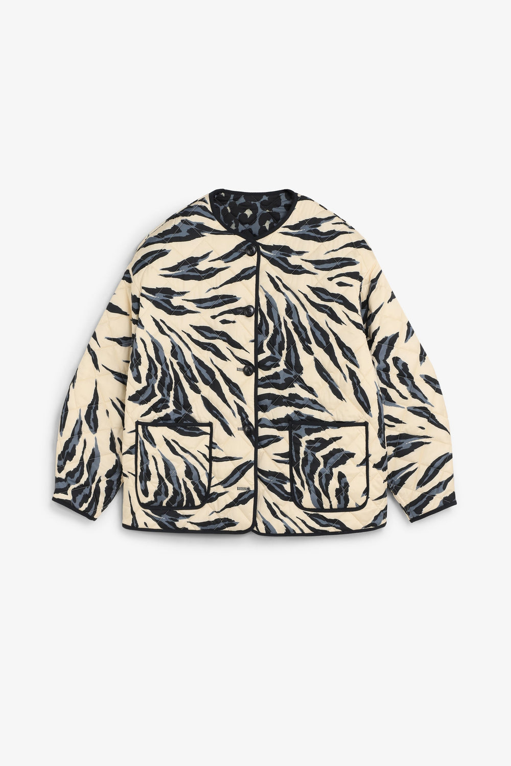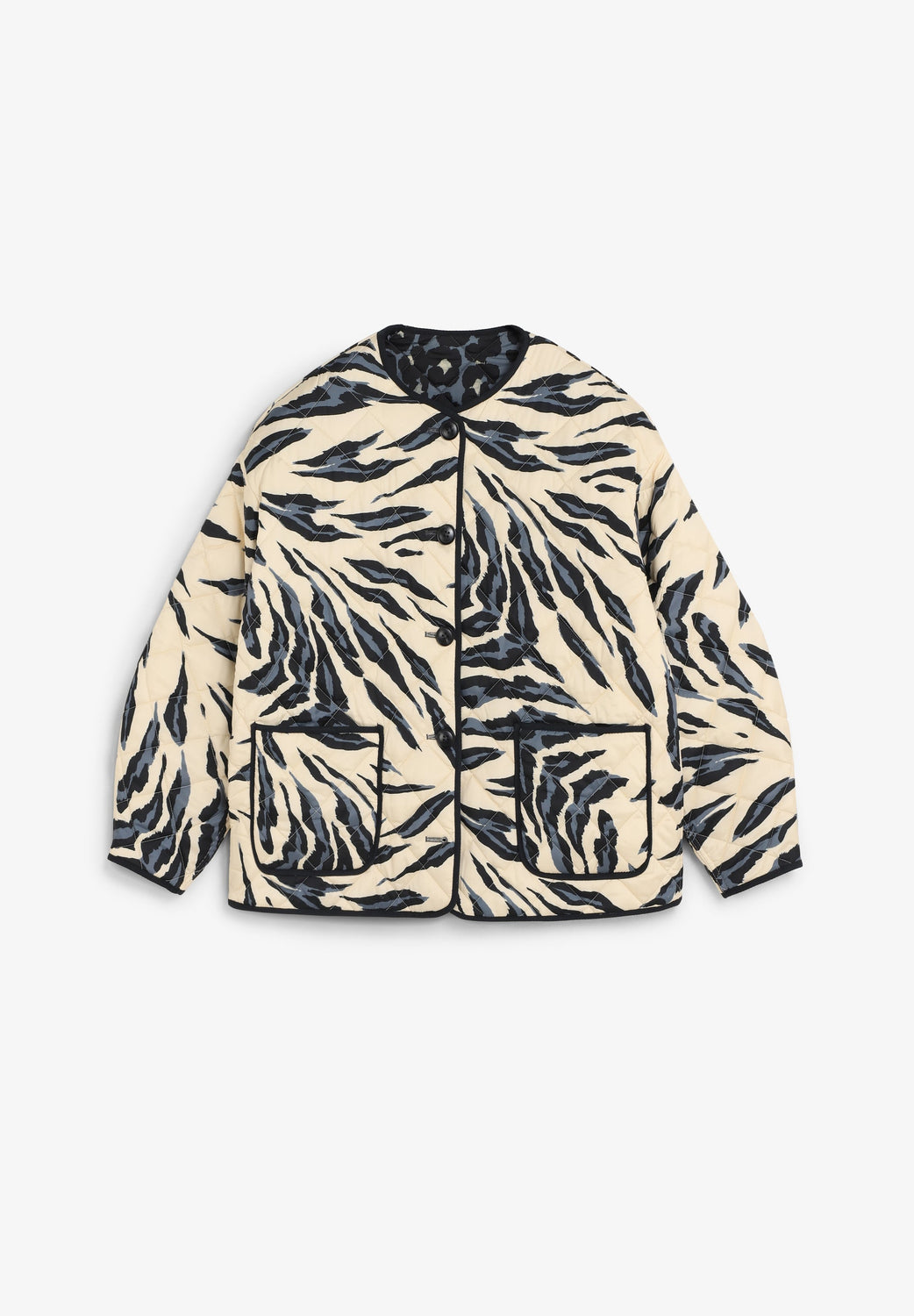 Casaco acolchoado reversível. Estampado animal. Manga comprida. Dois bolsos à frente. Fecho de botões.