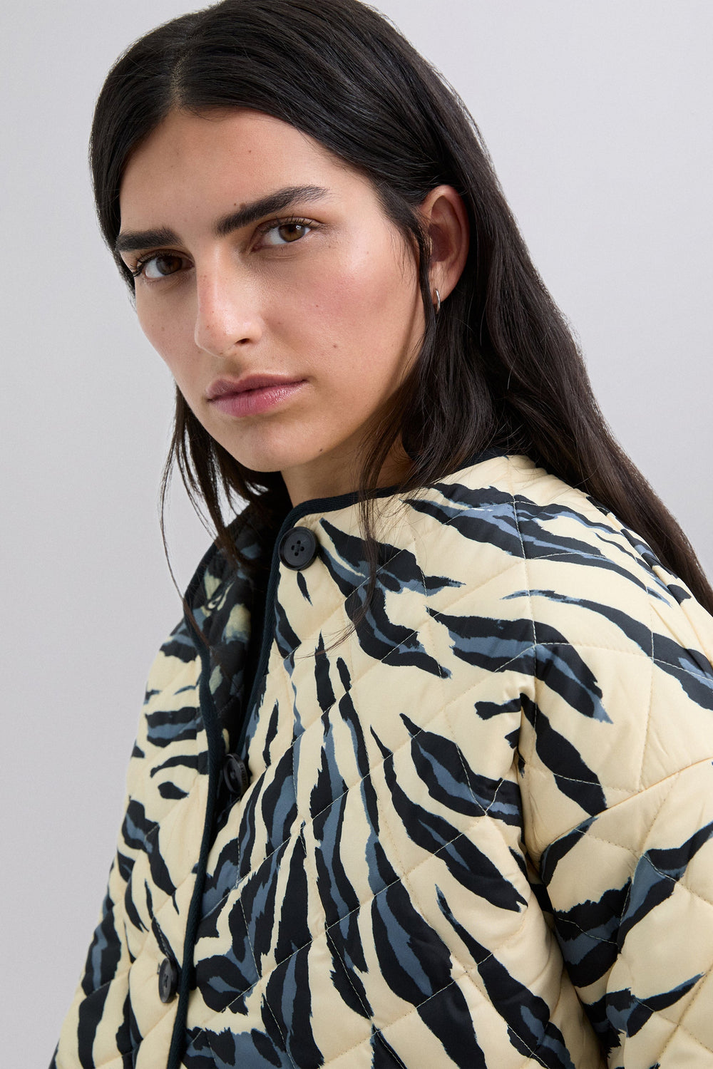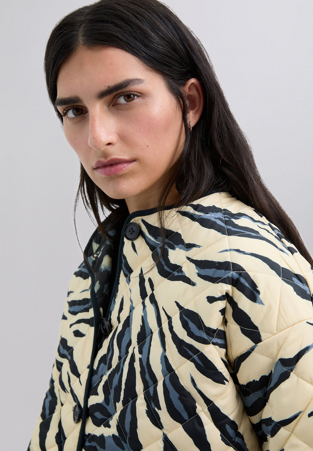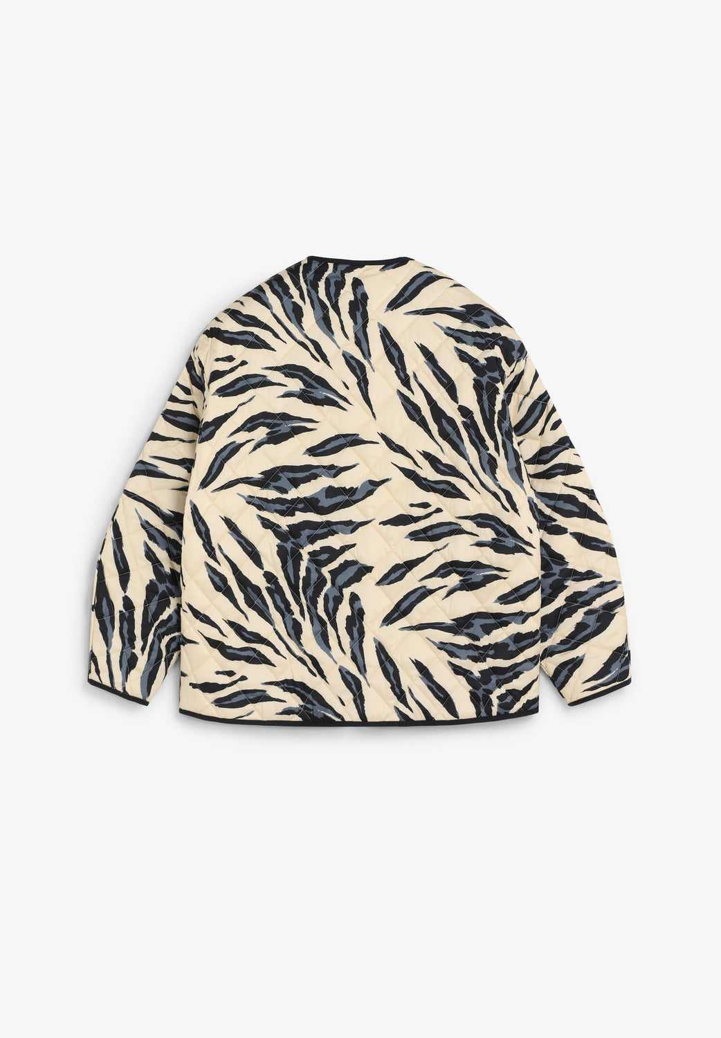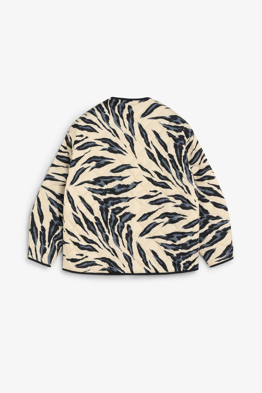 Casaco acolchoado reversível. Estampado animal. Manga comprida. Dois bolsos à frente. Fecho de botões.