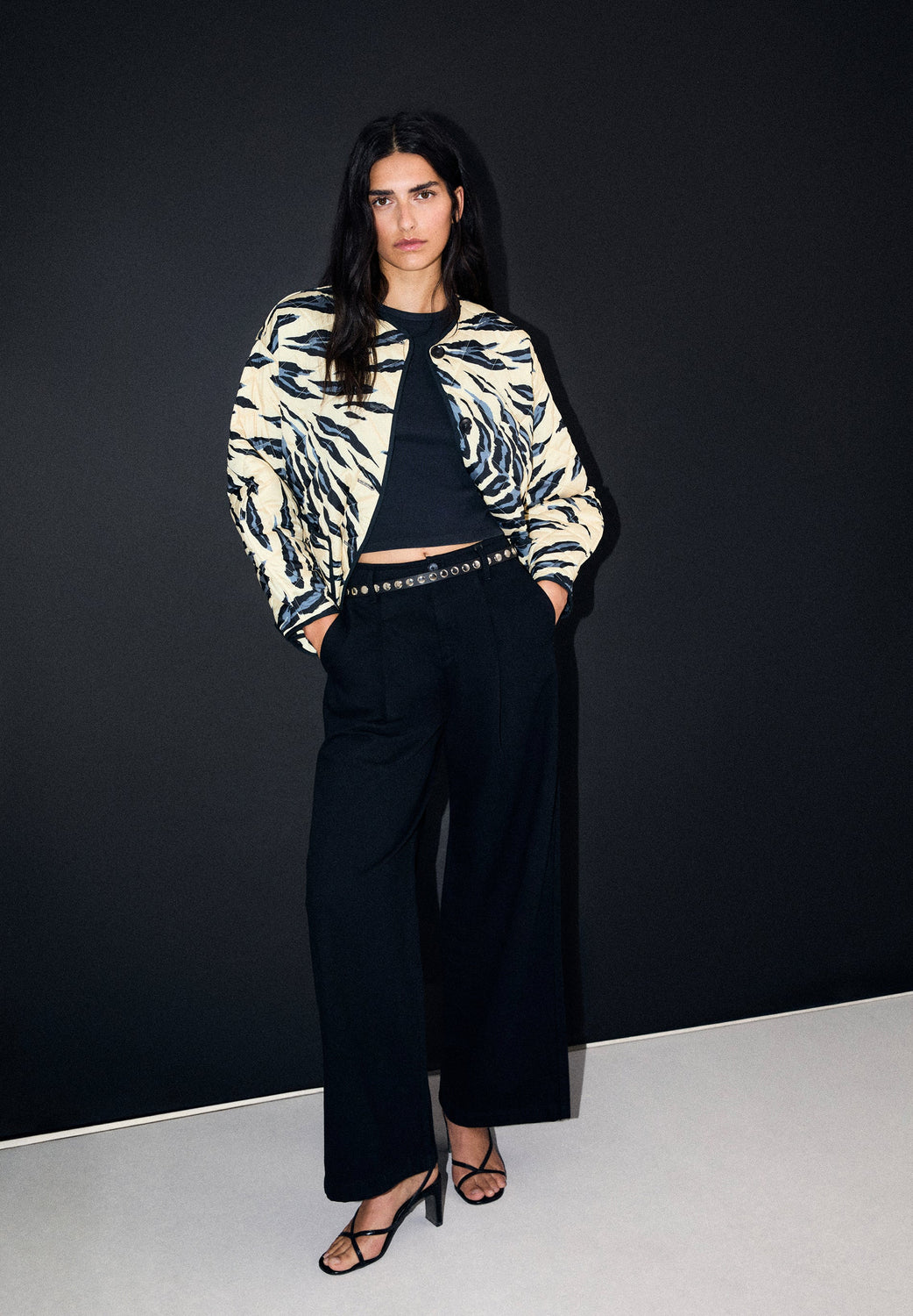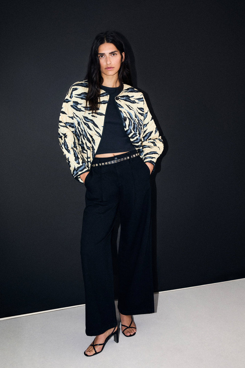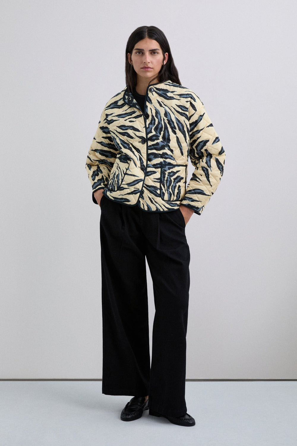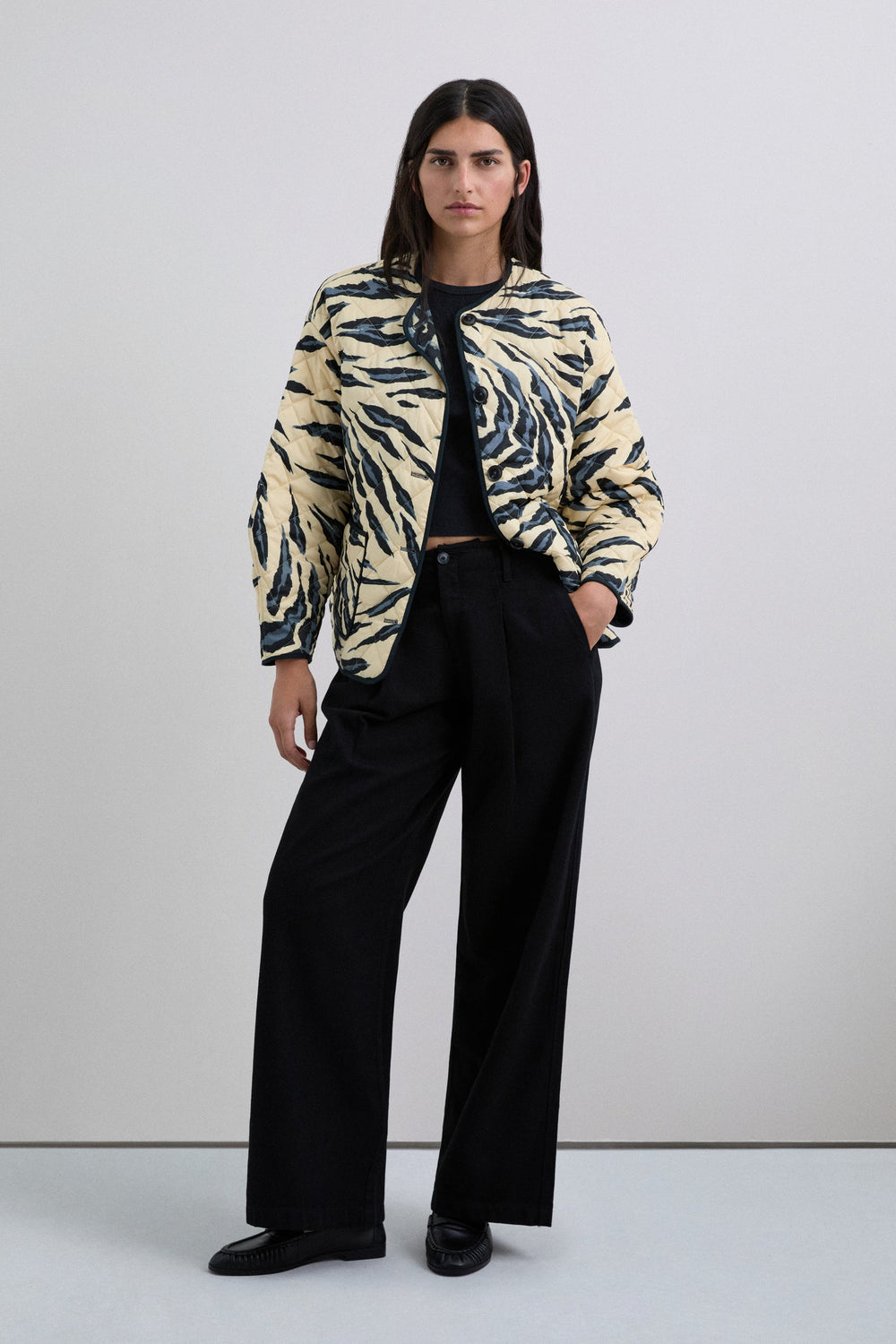 Casaco acolchoado reversível. Estampado animal. Manga comprida. Dois bolsos à frente. Fecho de botões.