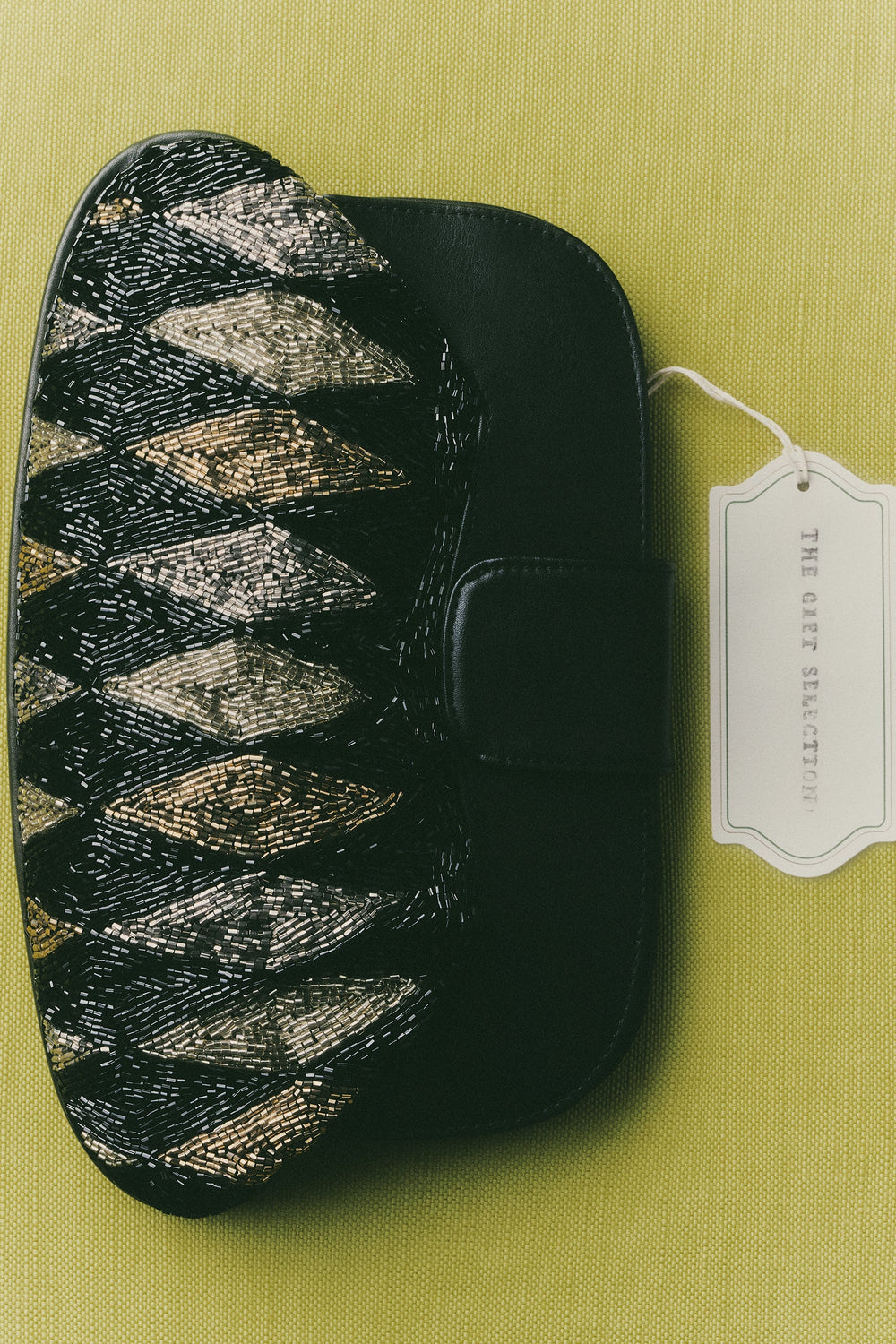 Bolsa de mão. Pormenor de contas. Correia metálica amovível em posição de alça de ombro. Fecho com íman. Pormenor de logótipo bordado no interior.