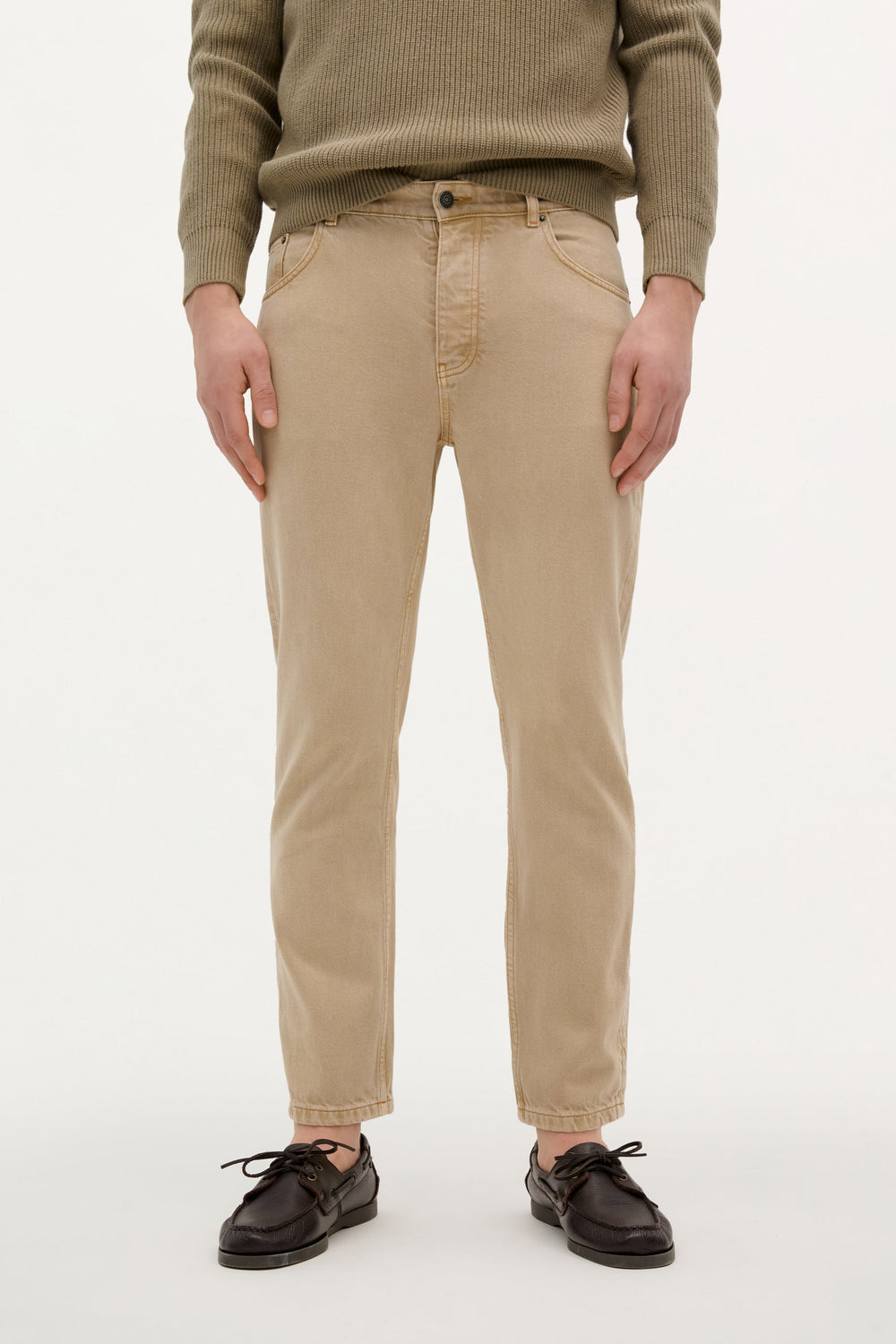 Jeans confecionados em mistura de algodão. Corte cropped, fecho com botão e zip e bolsos laterais e traseiros. Presilhas na cintura.
