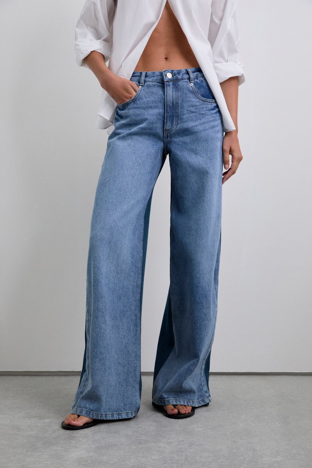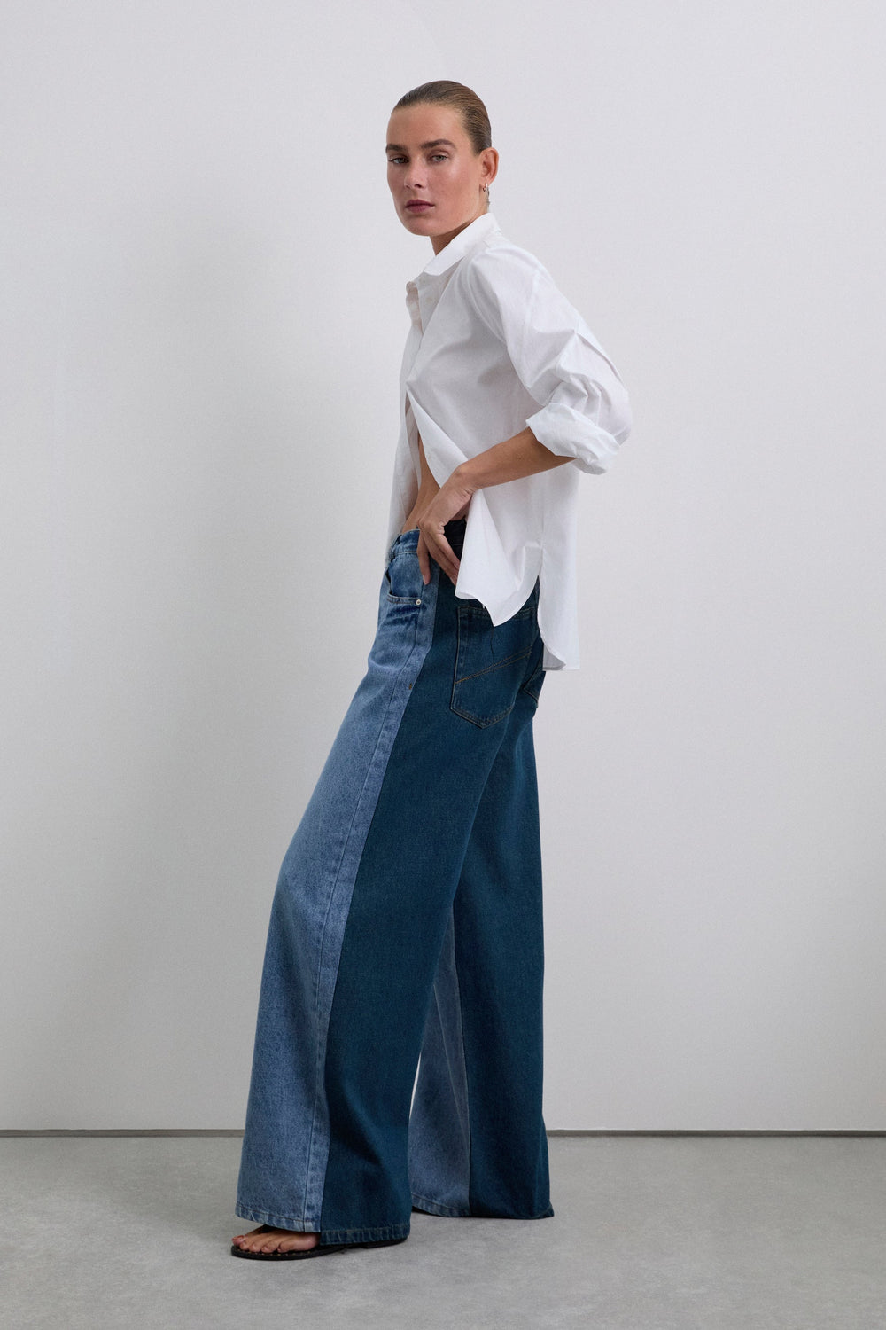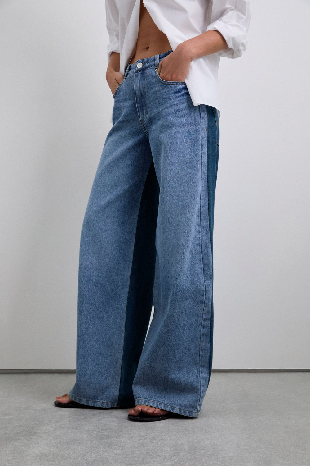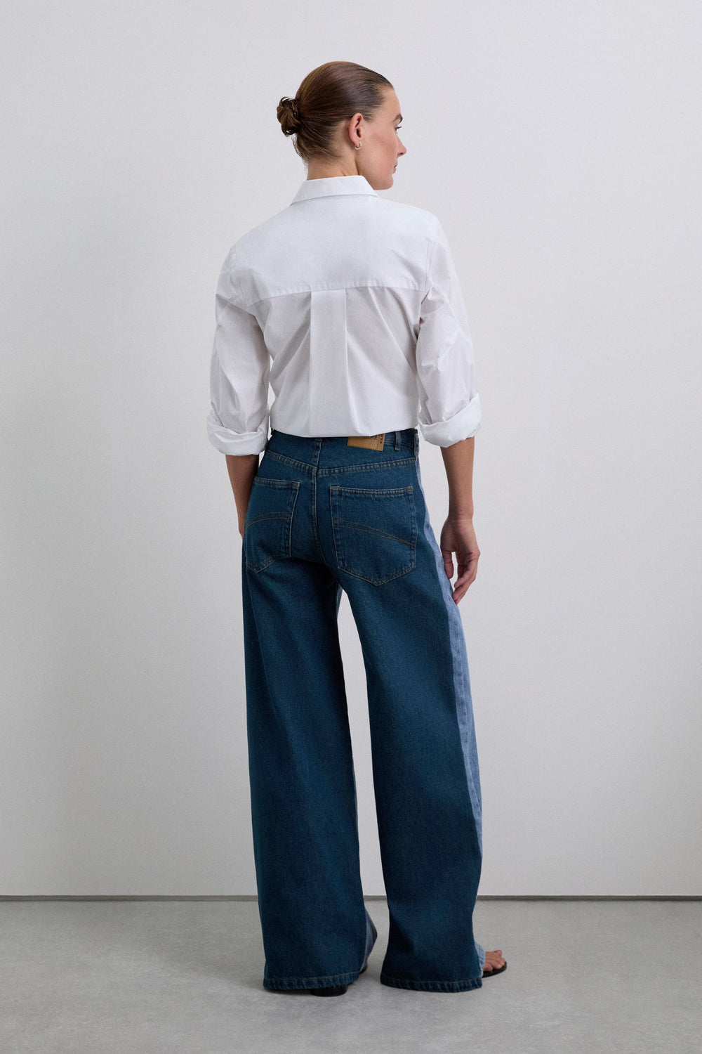 Calças denim confecionadas em 100% algodão. Corte regular fit, bicolores, fecho de correr e botão, presilhas na cintura, five pockets.