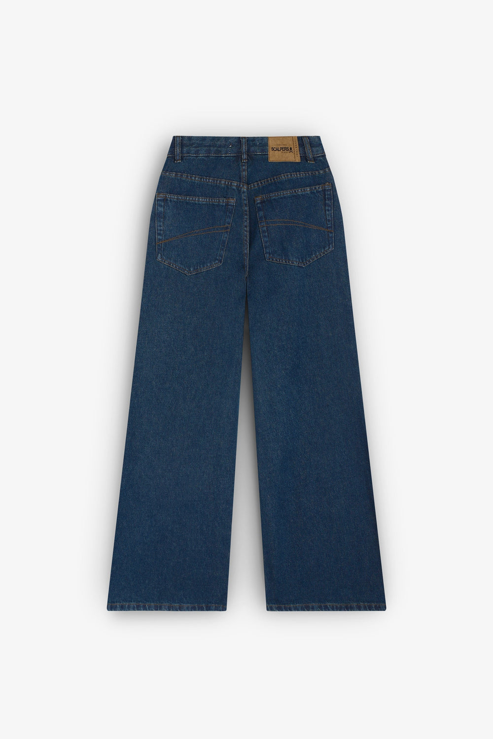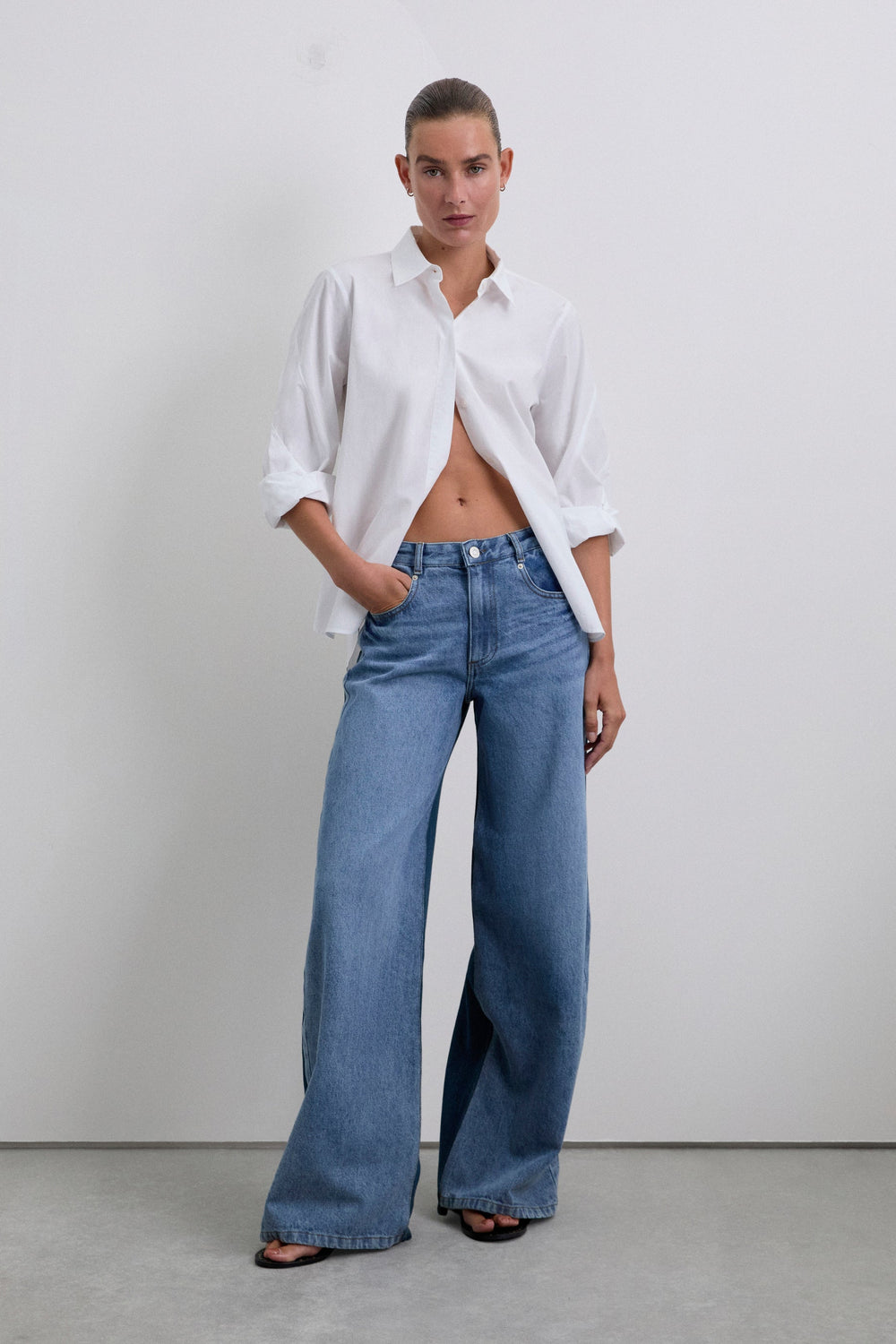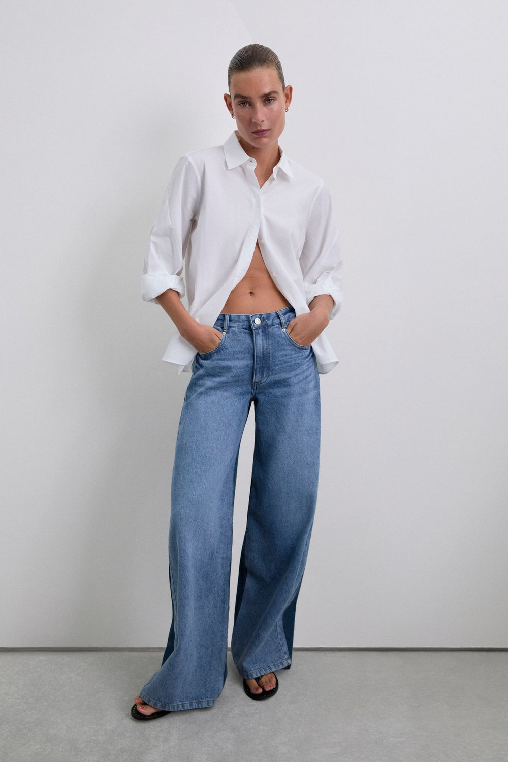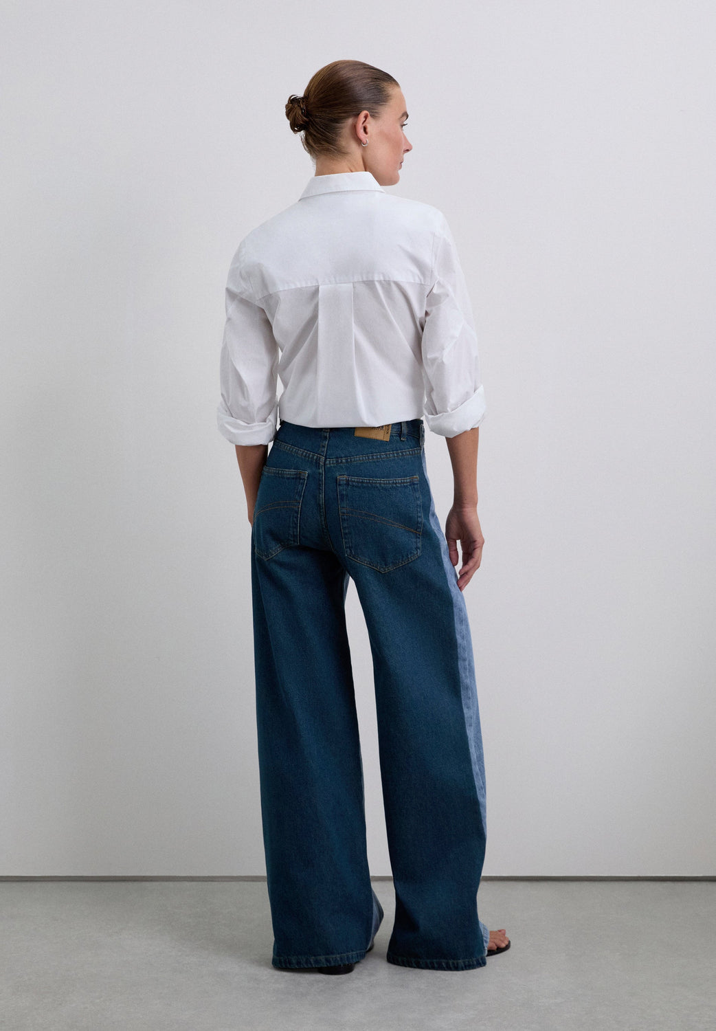 Calças denim confecionadas em 100% algodão. Corte regular fit, bicolores, fecho de correr e botão, presilhas na cintura, five pockets.