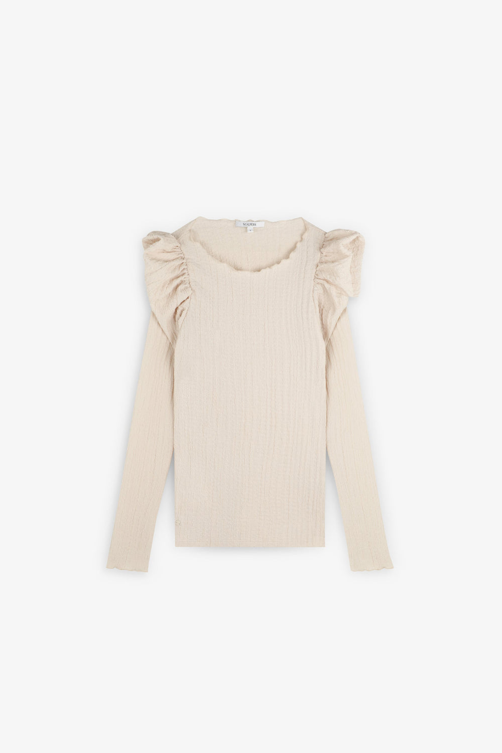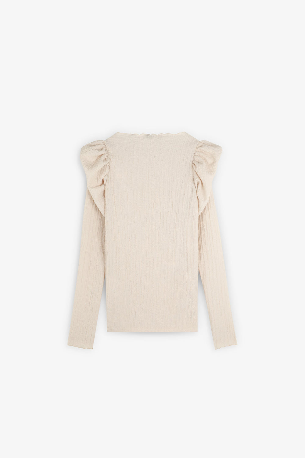 Camiseta confeccionada en tejido con textura ligeramente elástica. Manga larga. Cuello redondo. Volantes en hombros.