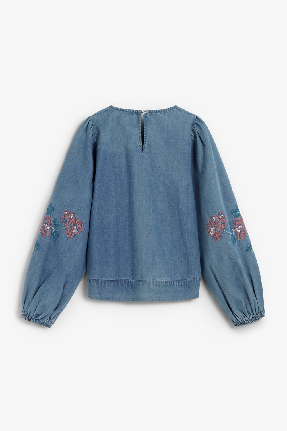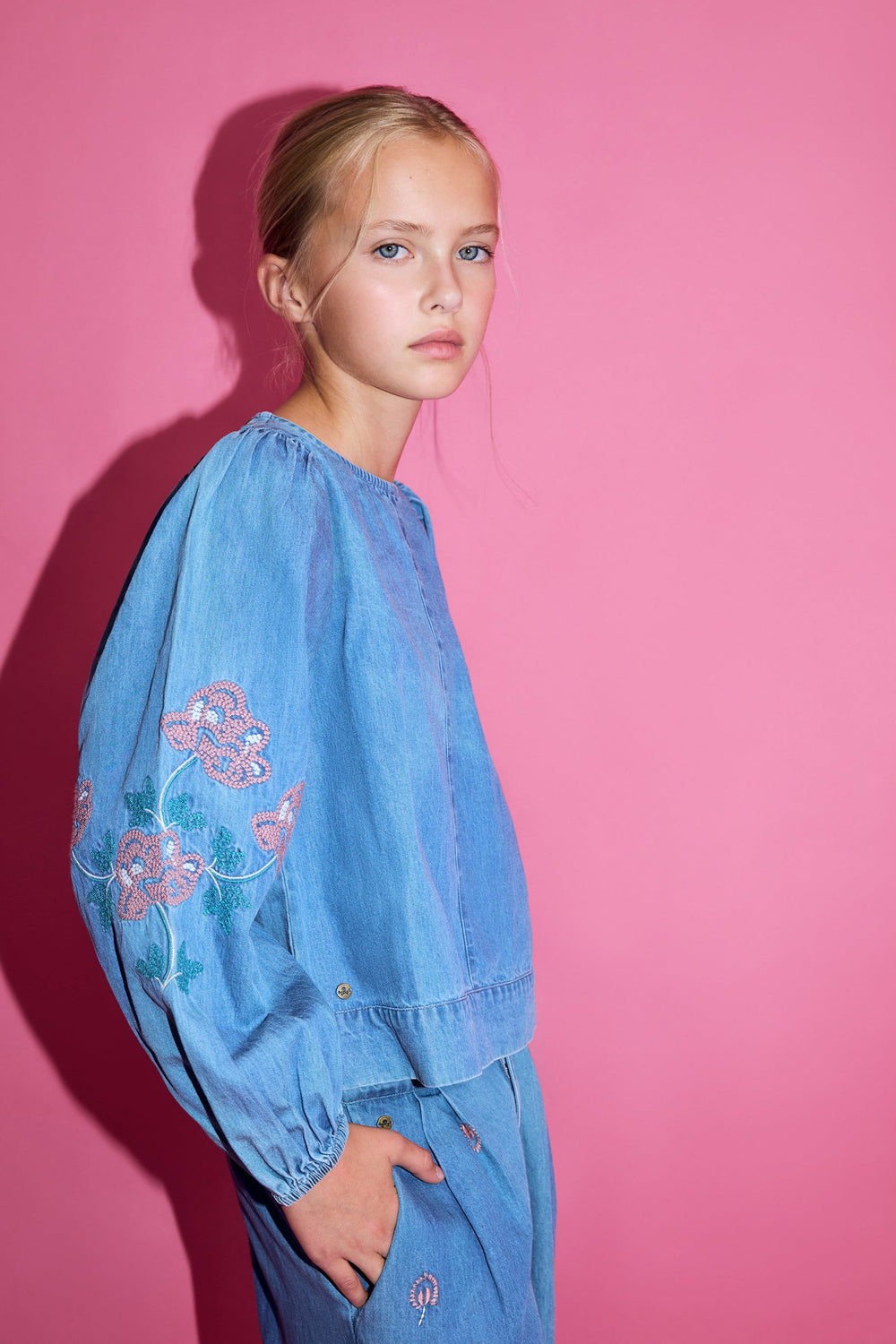 Blusa confecionada em 100% algodão BCI. Manga comprida abalonada e terminada em elástico. Decote redondo e pormenor de flores bordadas nas mangas. Fecho com botão nas costas.