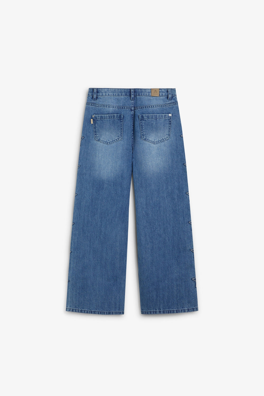 Calças wide leg confecionadas em 100% algodão orgânico. Fecho com botão e zip. Presilhas na cintura. Dois bolsos à frente e atrás. Pormenor de estrelas bordadas nas laterais.