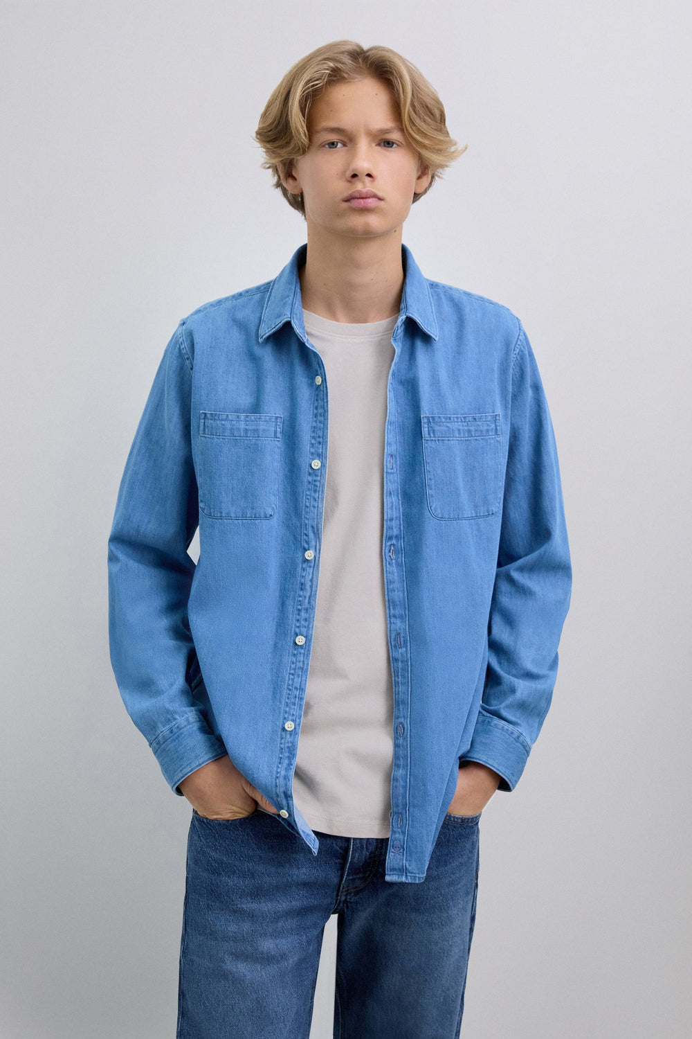 Camisa denim confecionada em tecido 100% algodão. Corte Regular Fit. Fecho com botões. Manga comprida terminada em punho com botões. Bolsos à frente.