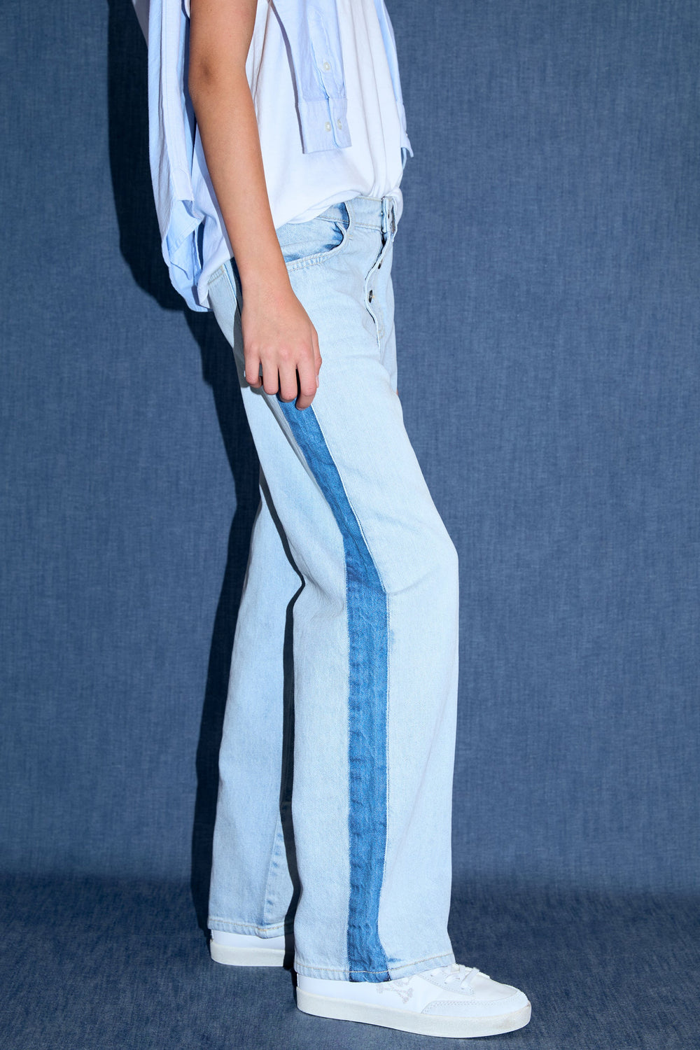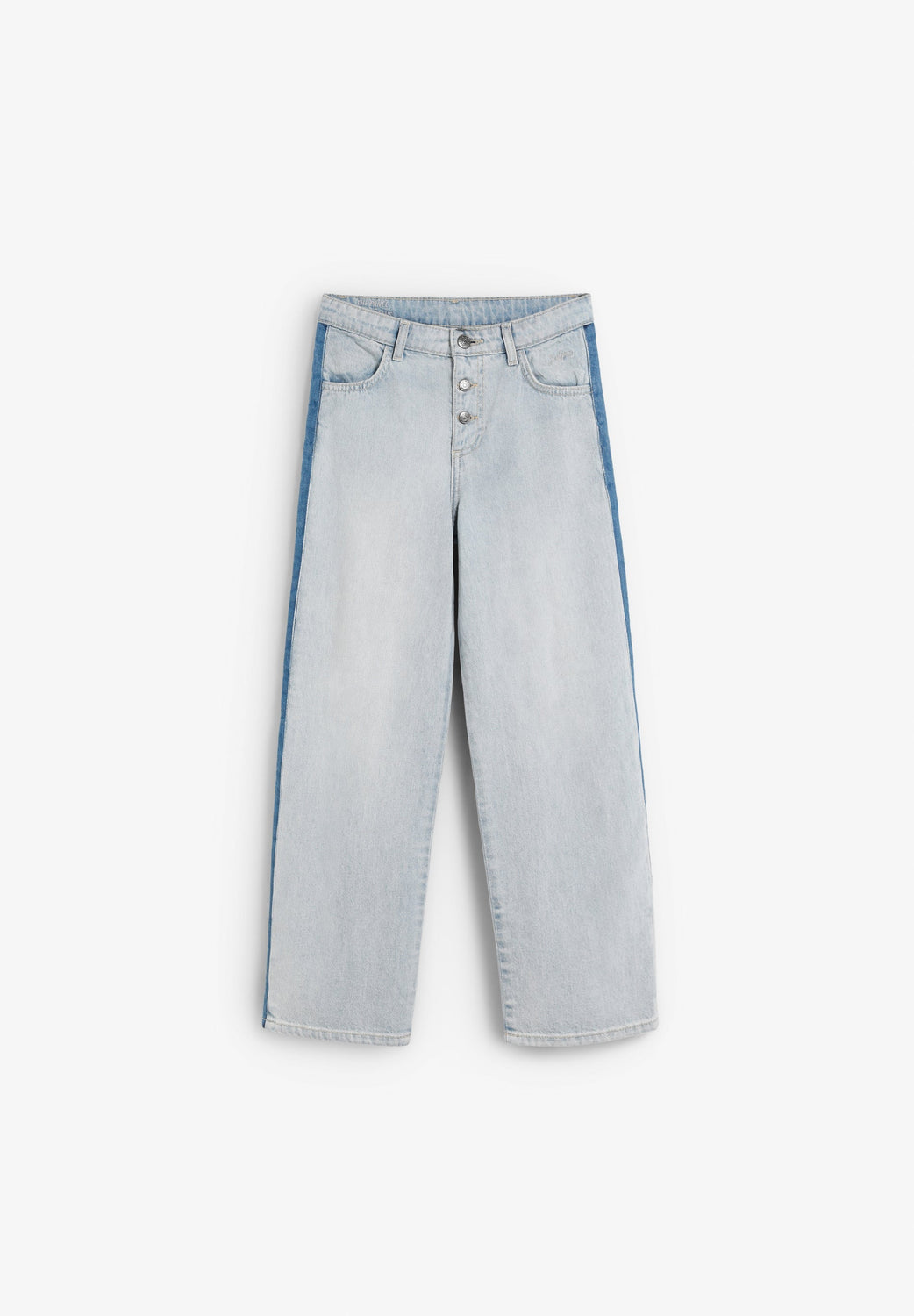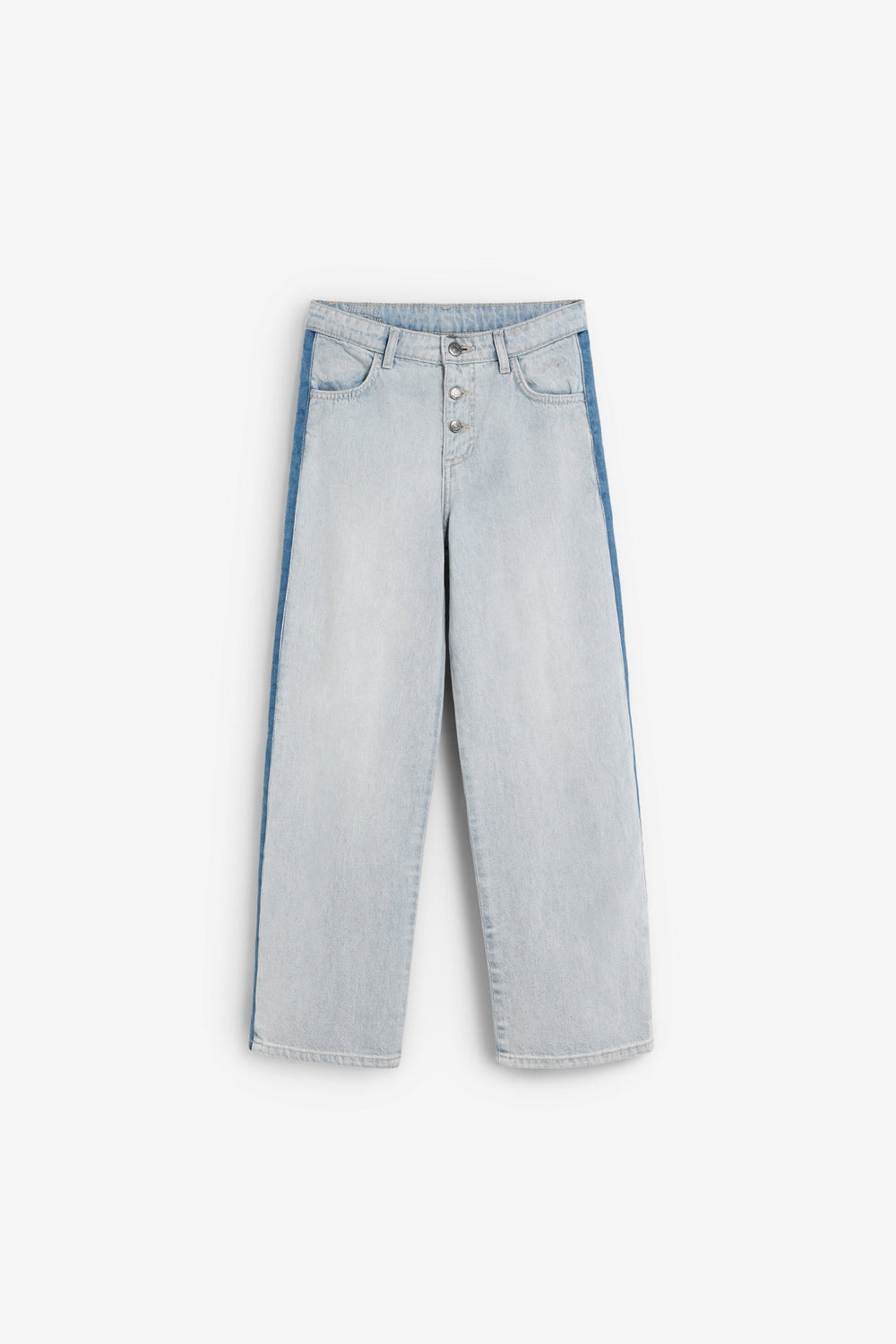 Calças wide leg confeconadas em 100% algodão BCI. Fecho com duplo botão e fecho de correr. Presilhas na cintura. Pormenor de costura em contraste na lateral. Forro interior 100% algodão.