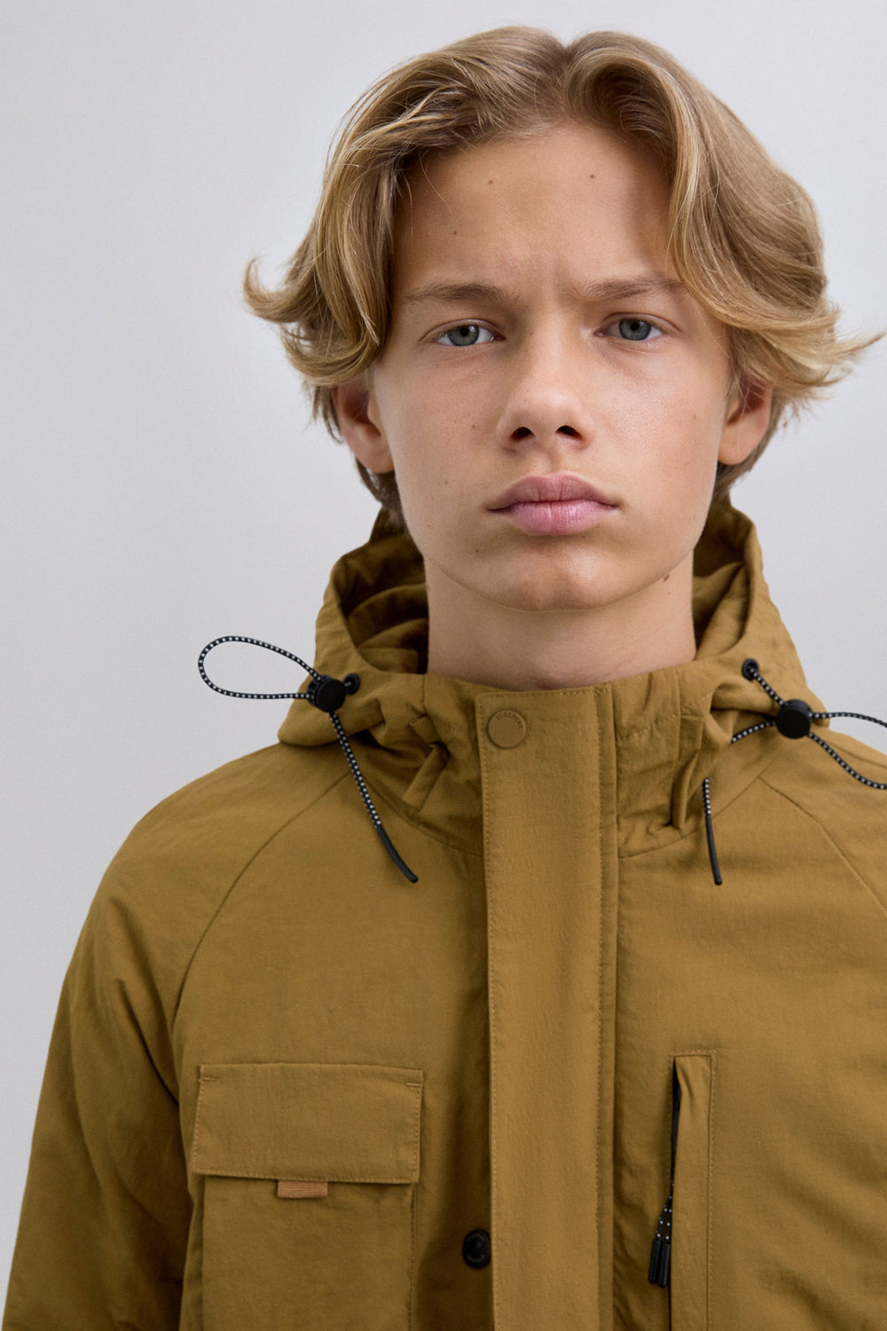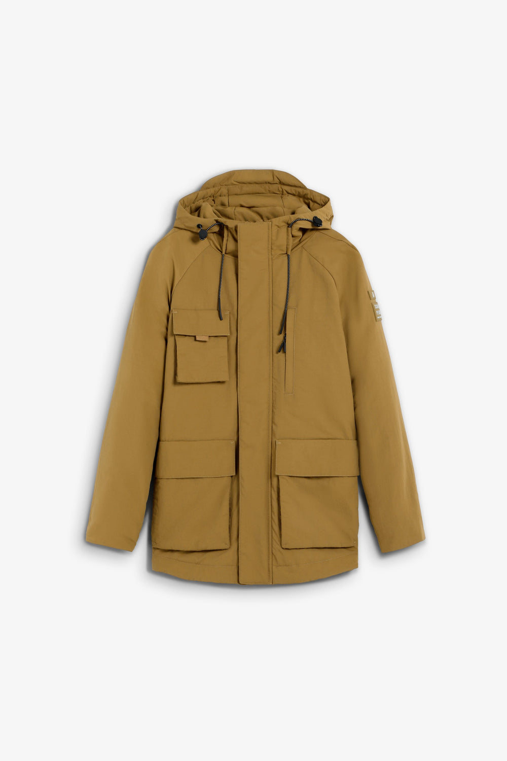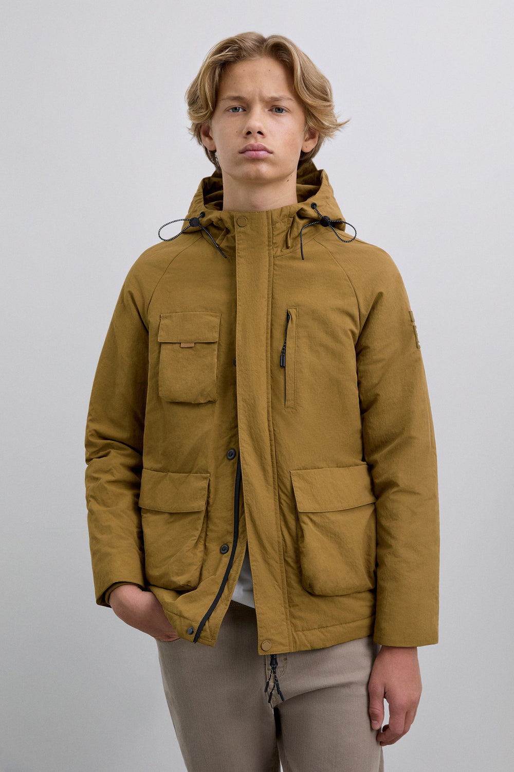 Cardigan de manga comprida com capuz ajustável com cordões. Quatro bolsos frontais, dois no peito e dois inferiores com placket. Fecho à frente com botões e zip. Pormenor de remendo efeito de caucho em contraste com logótipo e skull na manga.