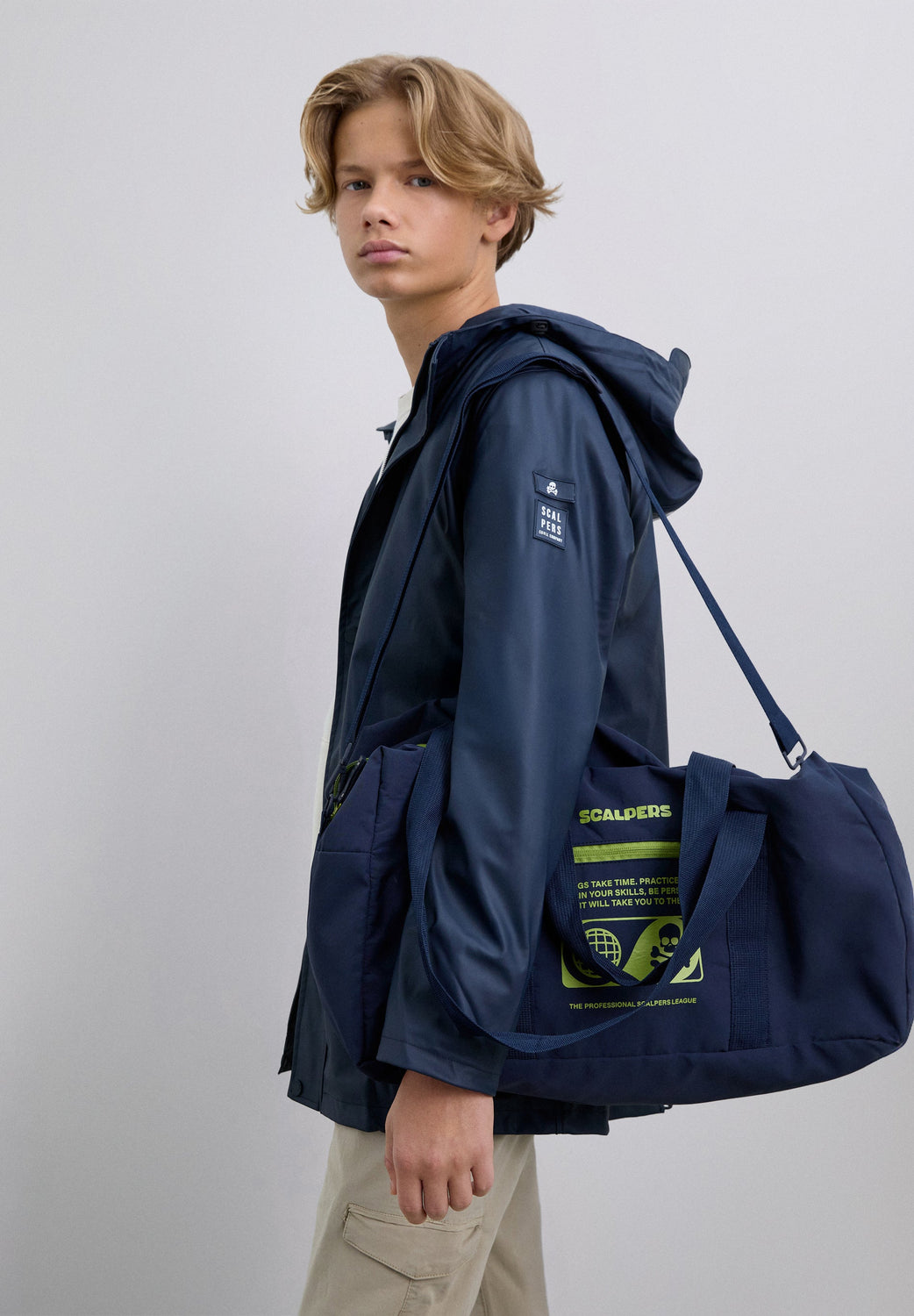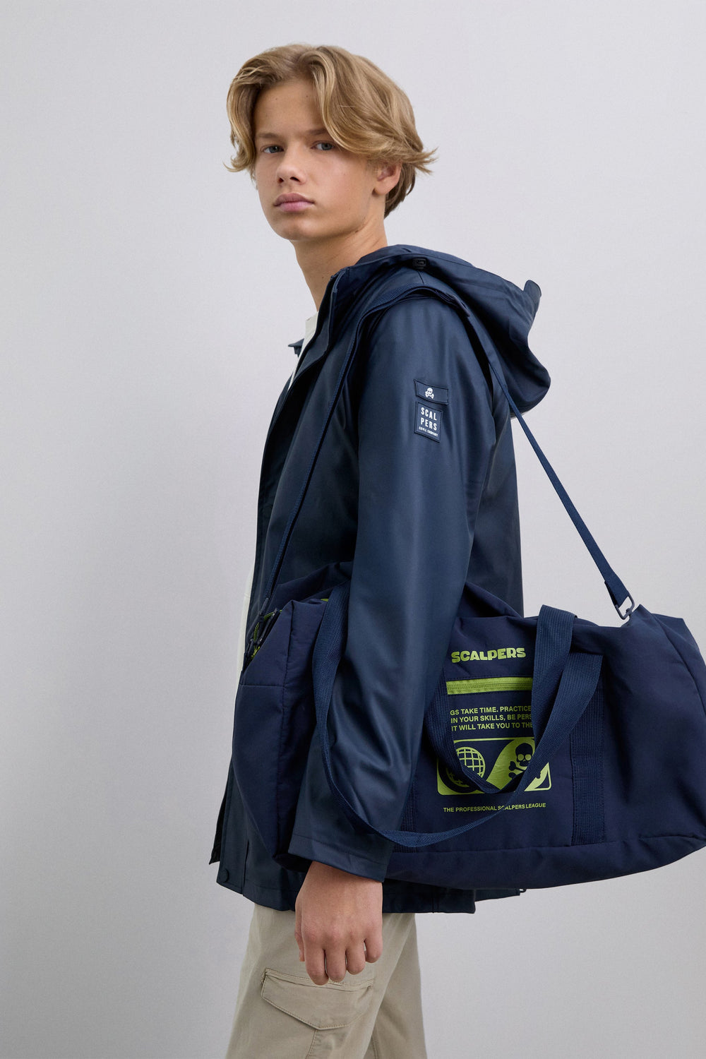 Bolsa confecionada em tecido técnico. Compartimento principal e lateral com fecho de correr. Fecho com zip, alças curtas e alça comprida removível. Padrão frontal com logótipo e skull.