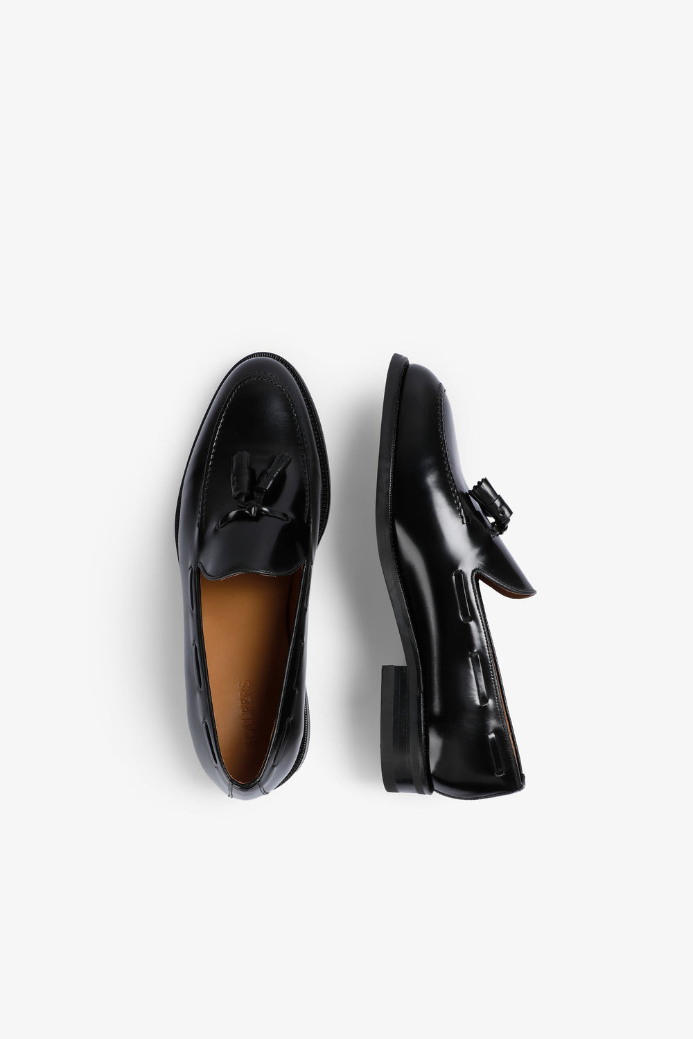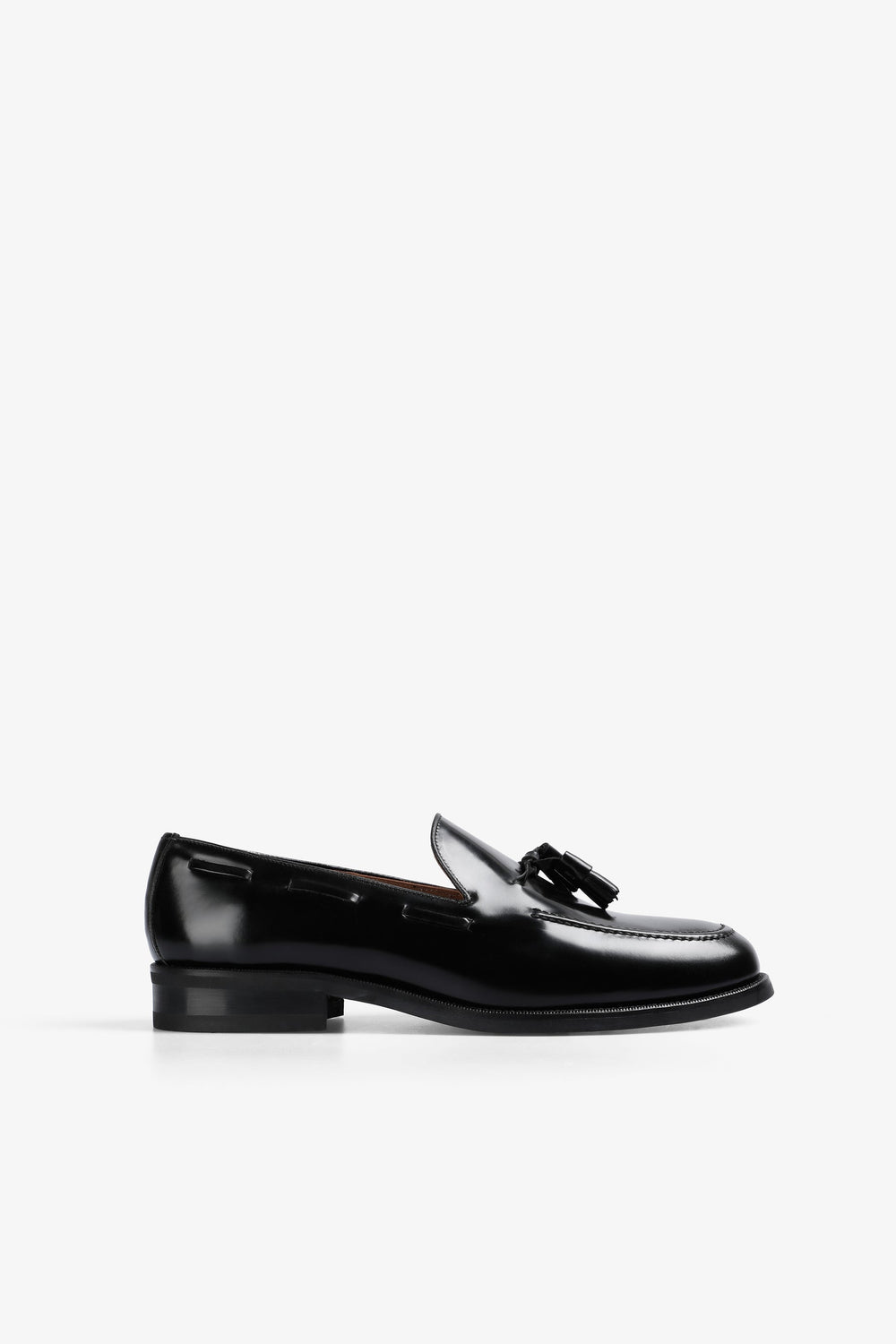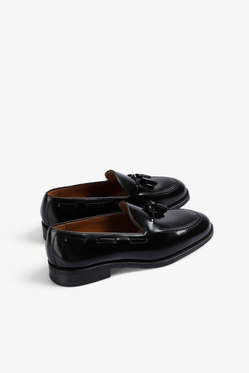 Mocassins de fato confecionados em 100% pele de bovino. Parte superior lisa com pormenor de borlas. Forro e palmilha interior em contraste. Forma redonda. Sola com leve tacão.