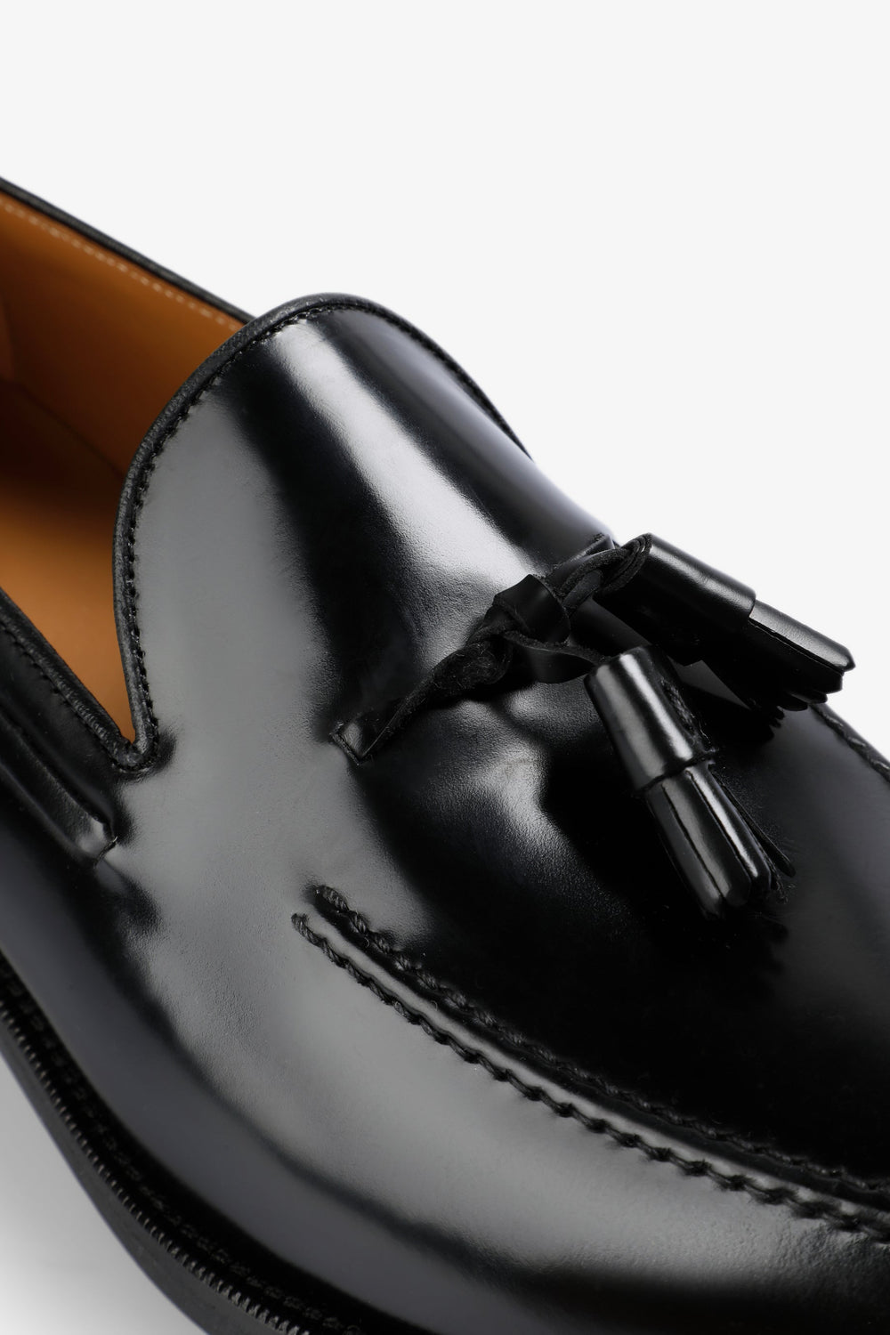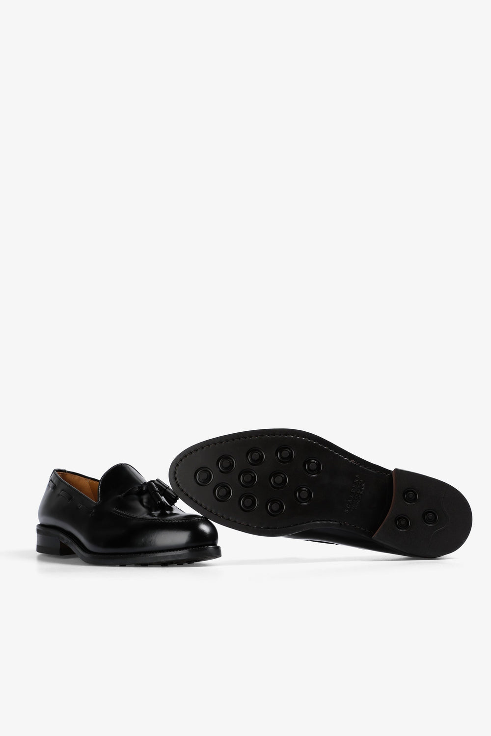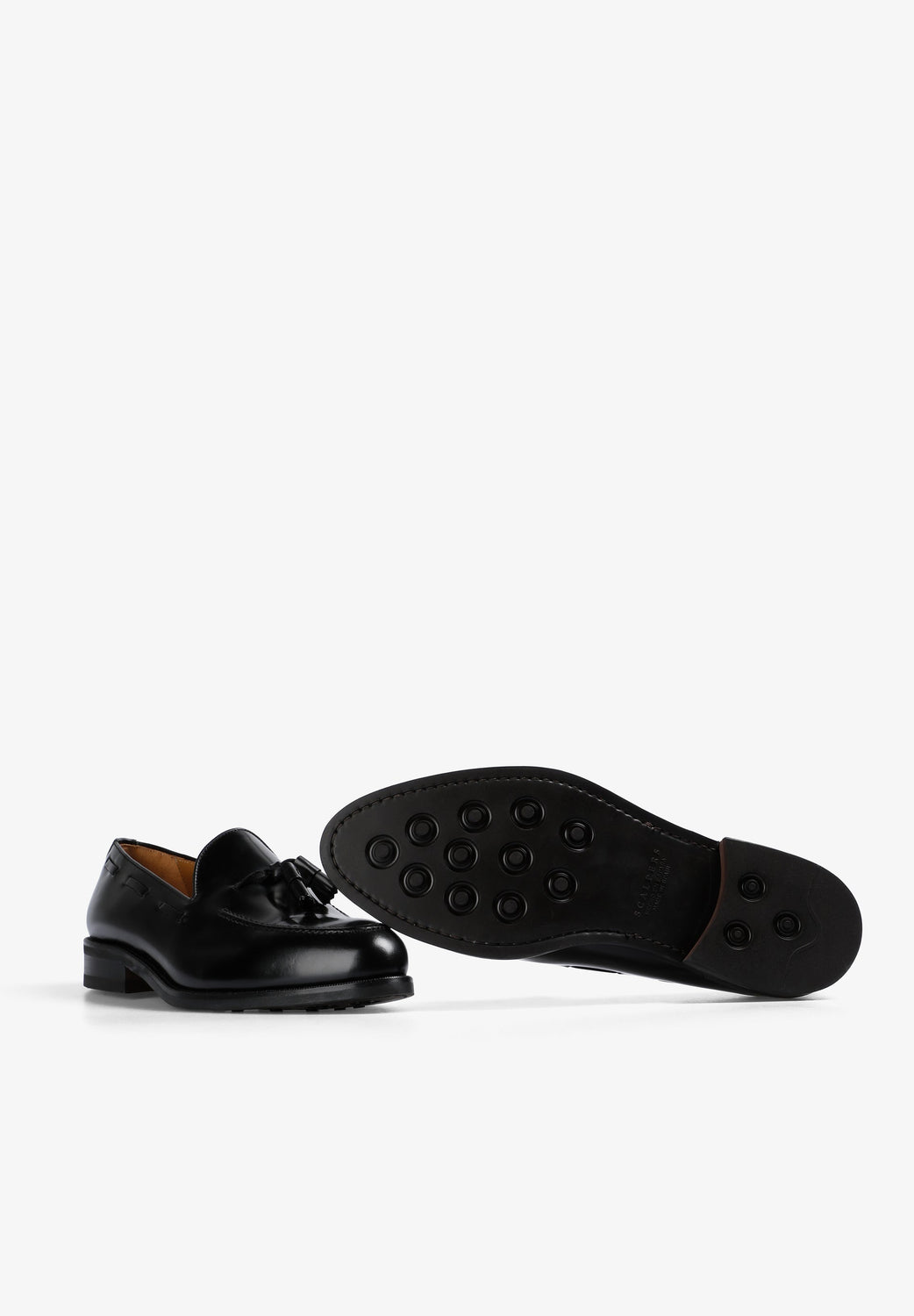 Mocassins de fato confecionados em 100% pele de bovino. Parte superior lisa com pormenor de borlas. Forro e palmilha interior em contraste. Forma redonda. Sola com leve tacão.