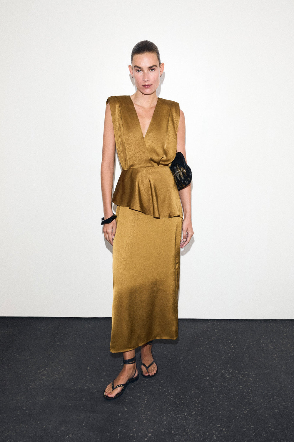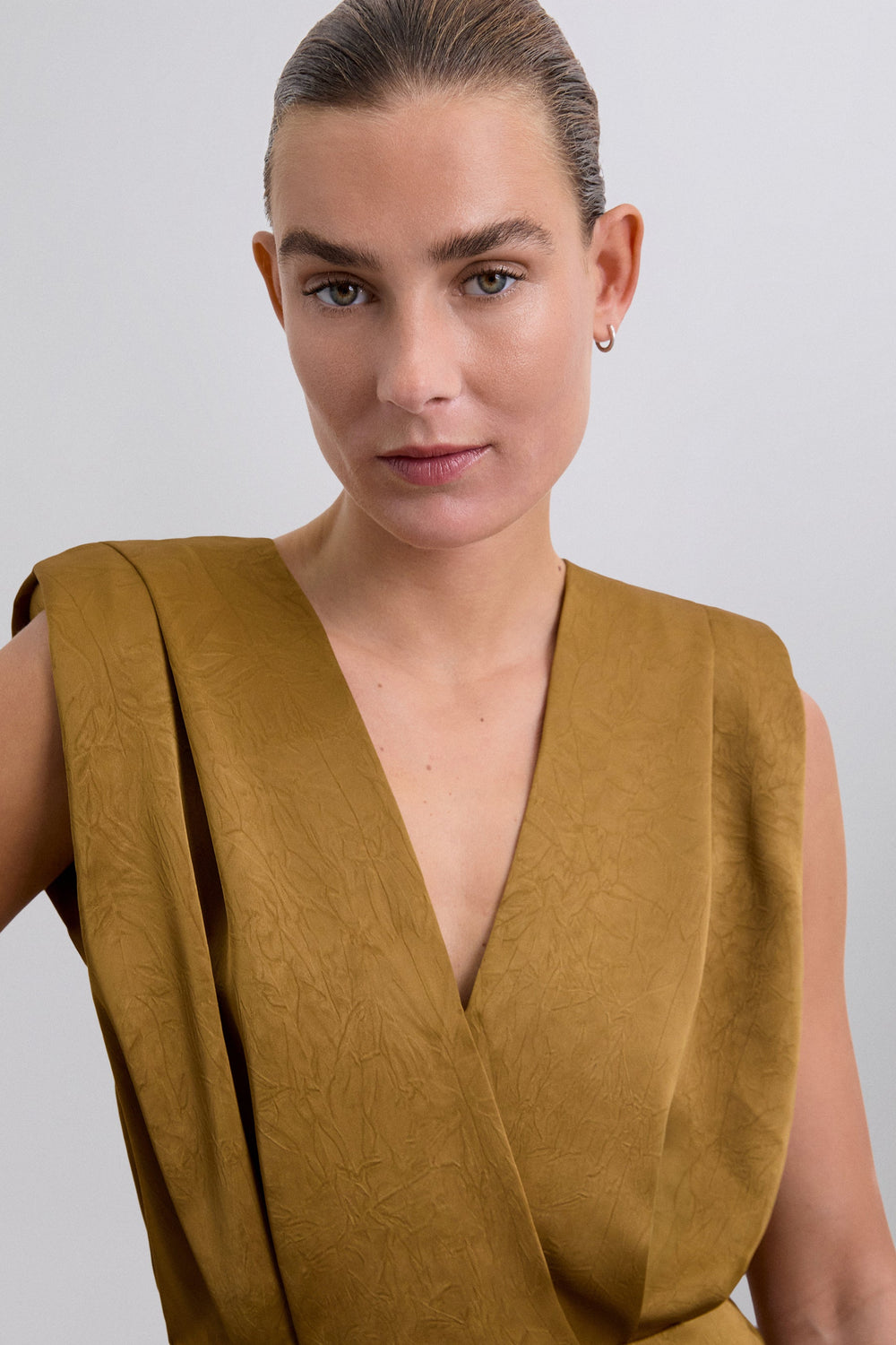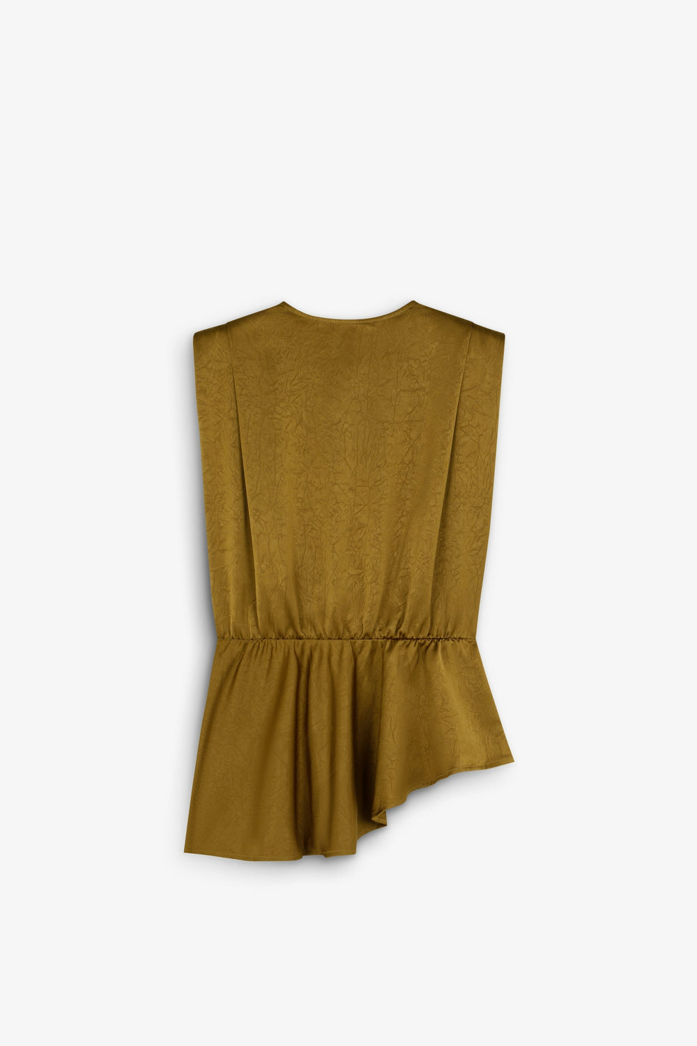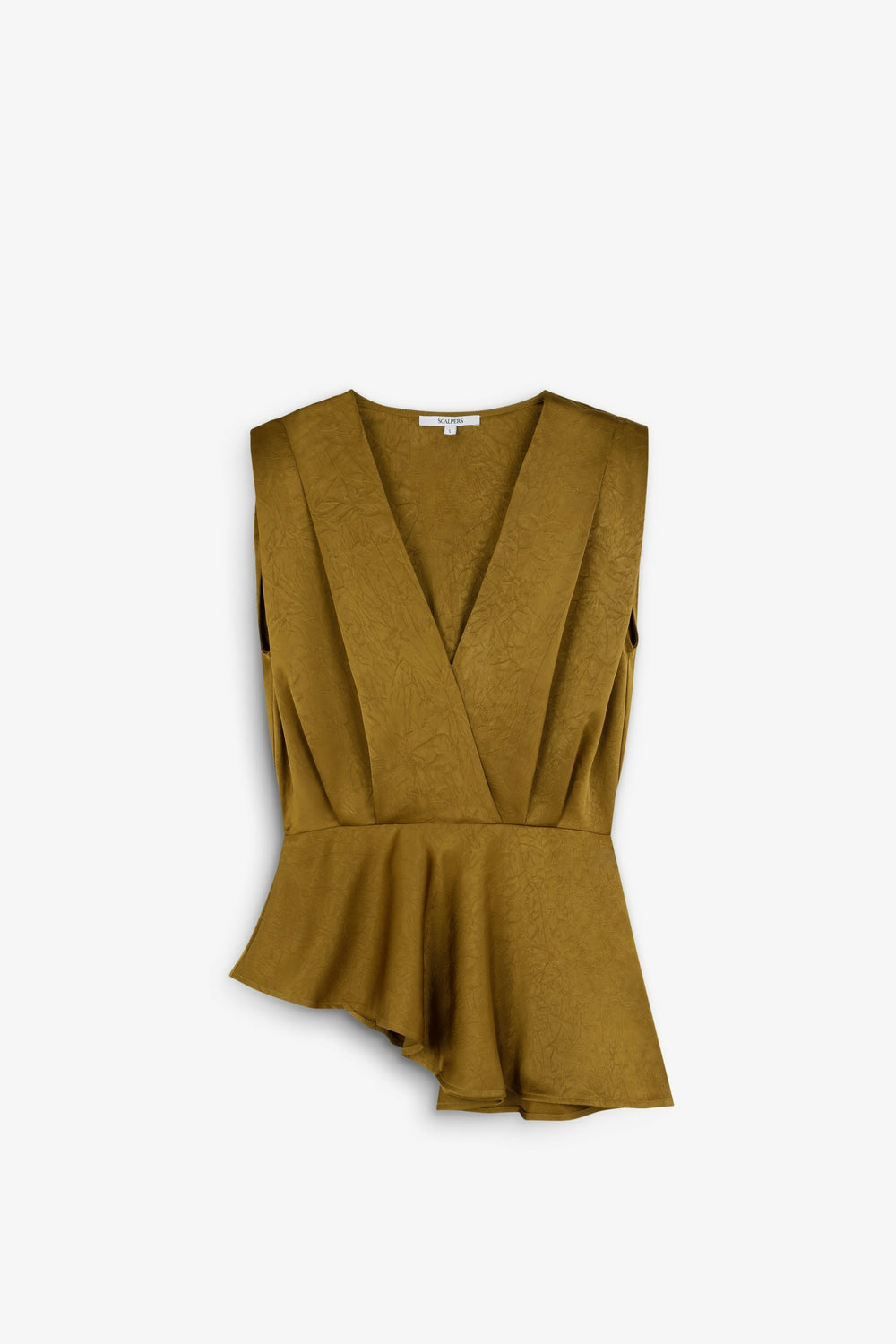Top confecionado em tecido fluido com textura. Corte regular fit, decote em V e manga cava e ombreira ligeira. Plissados no peito, cingido na cintura e com folho na bainha.