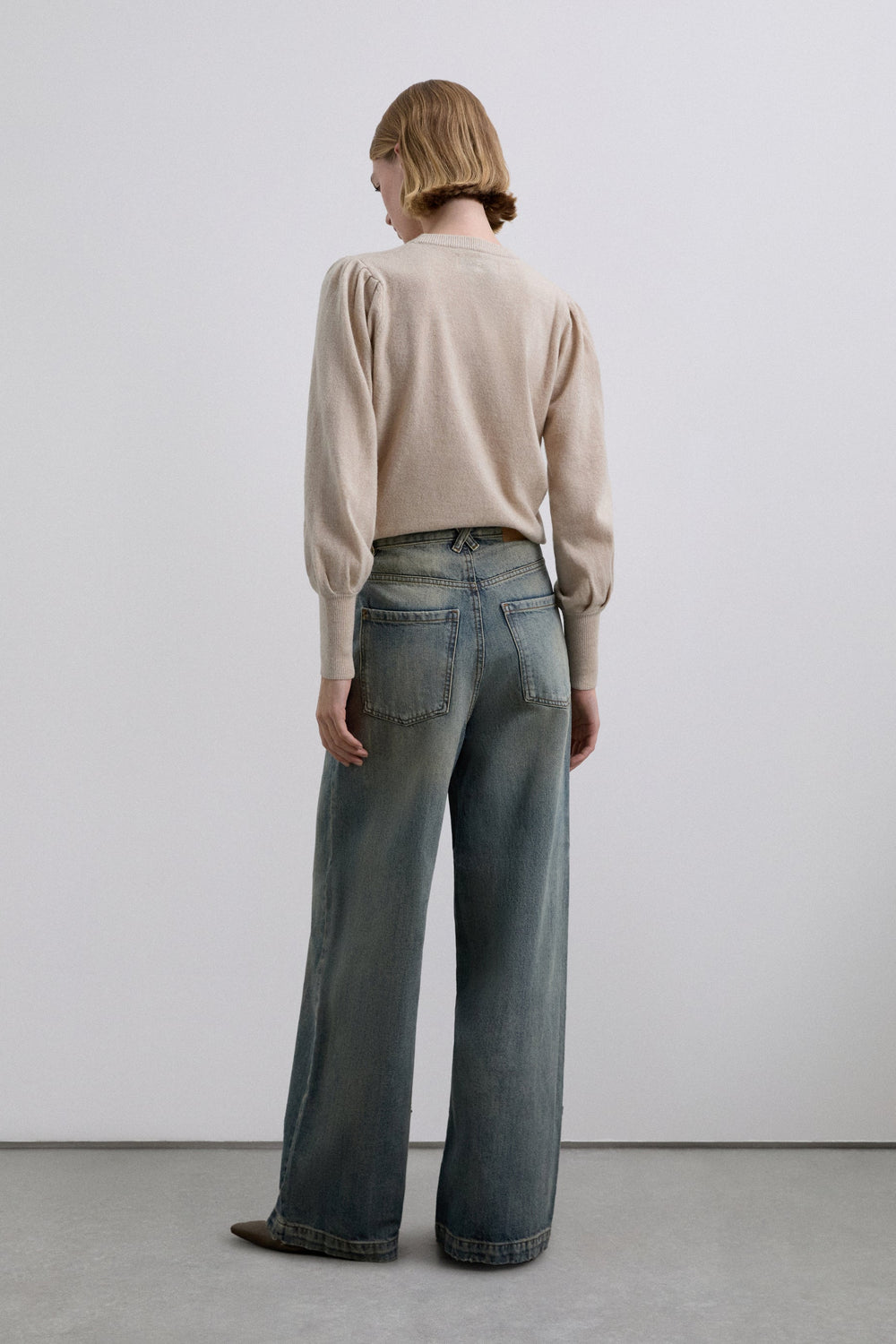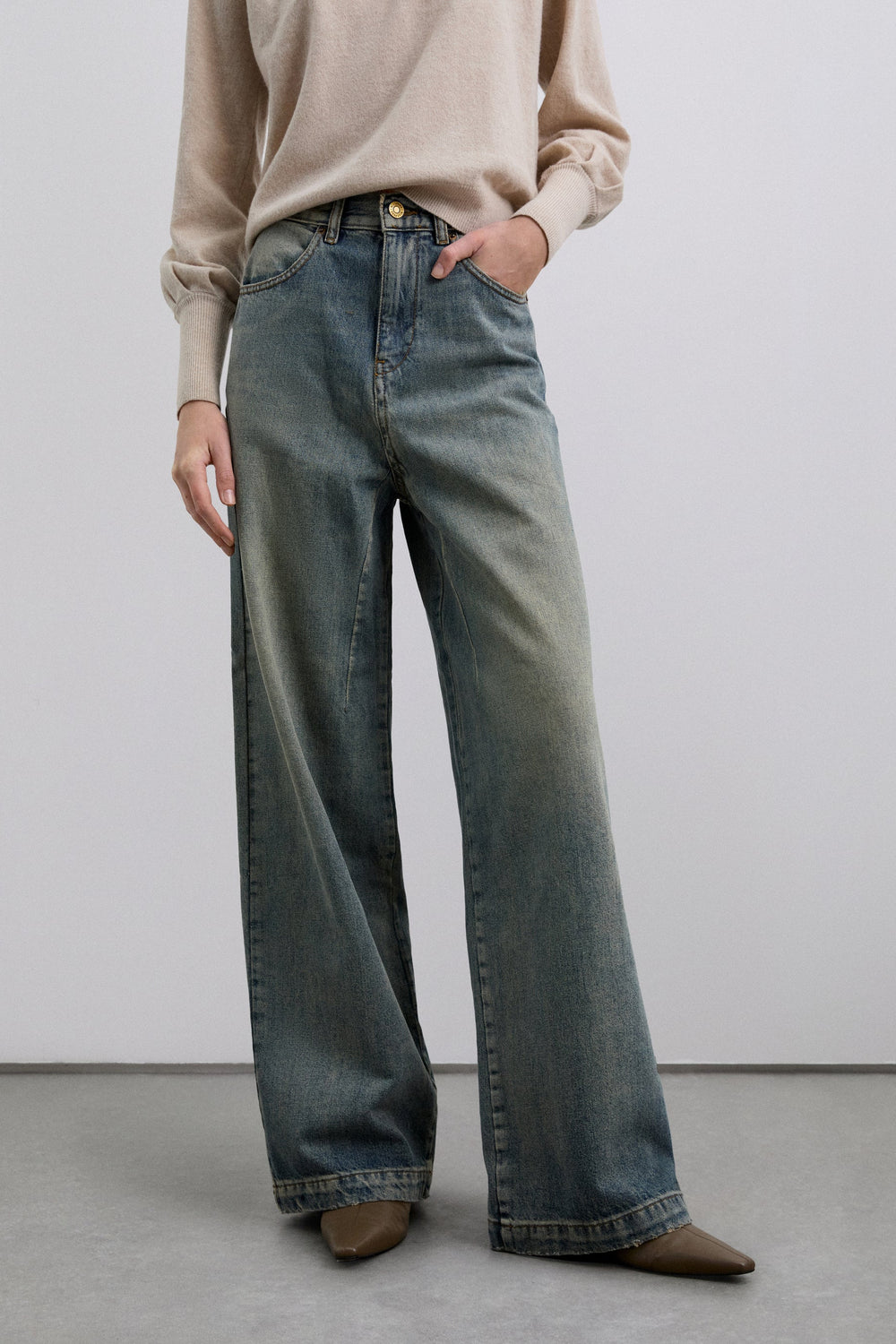 Calças denim confecionadas em 100% algodão. Corte regular fit, fecho de correr e botão, quatro bolsos.