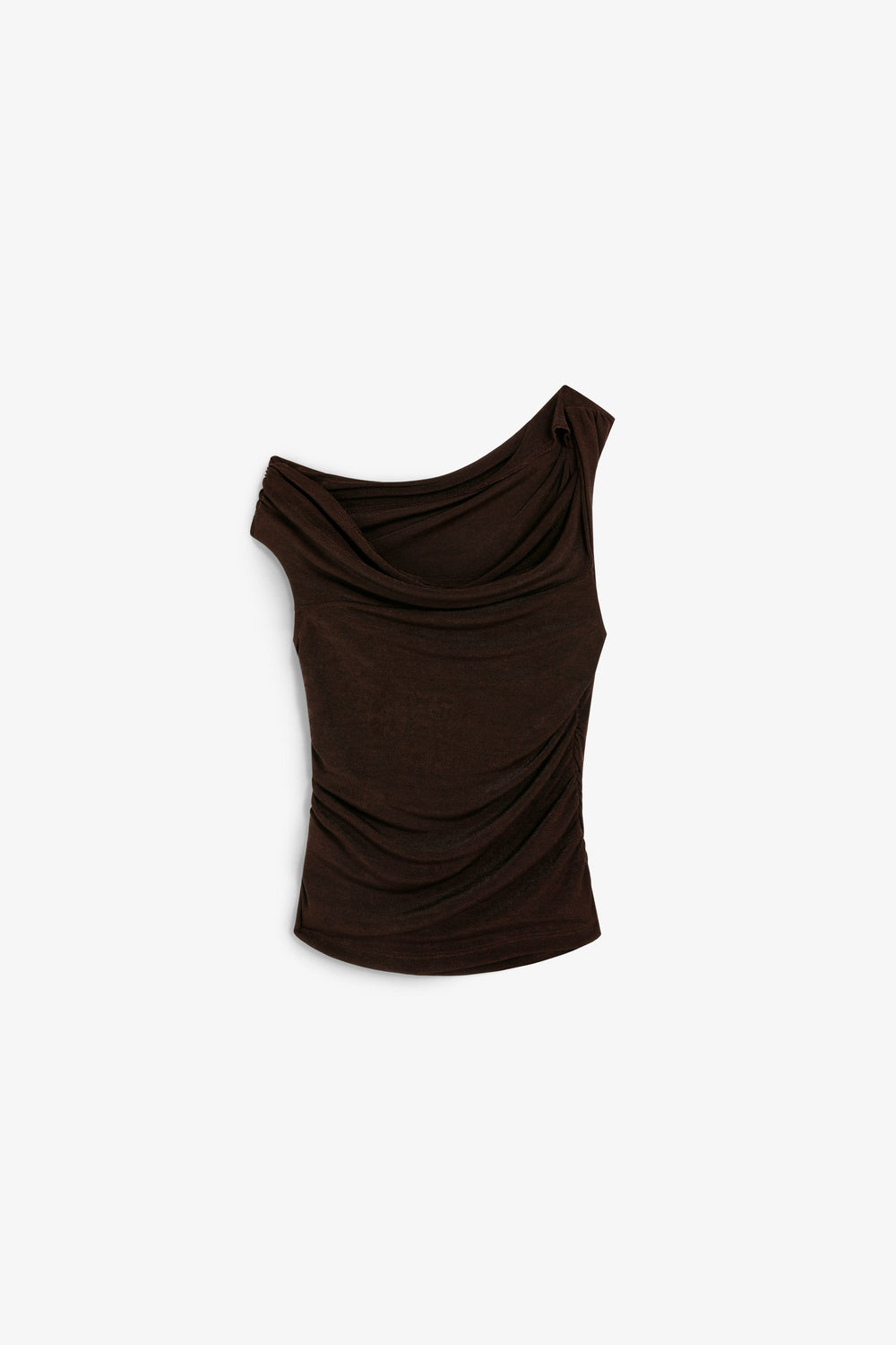 Top confecionado em tecido ligeiramente elástico. Corte slim fit, ombro descaído, decote assimétrico com franzidos nas laterais.
