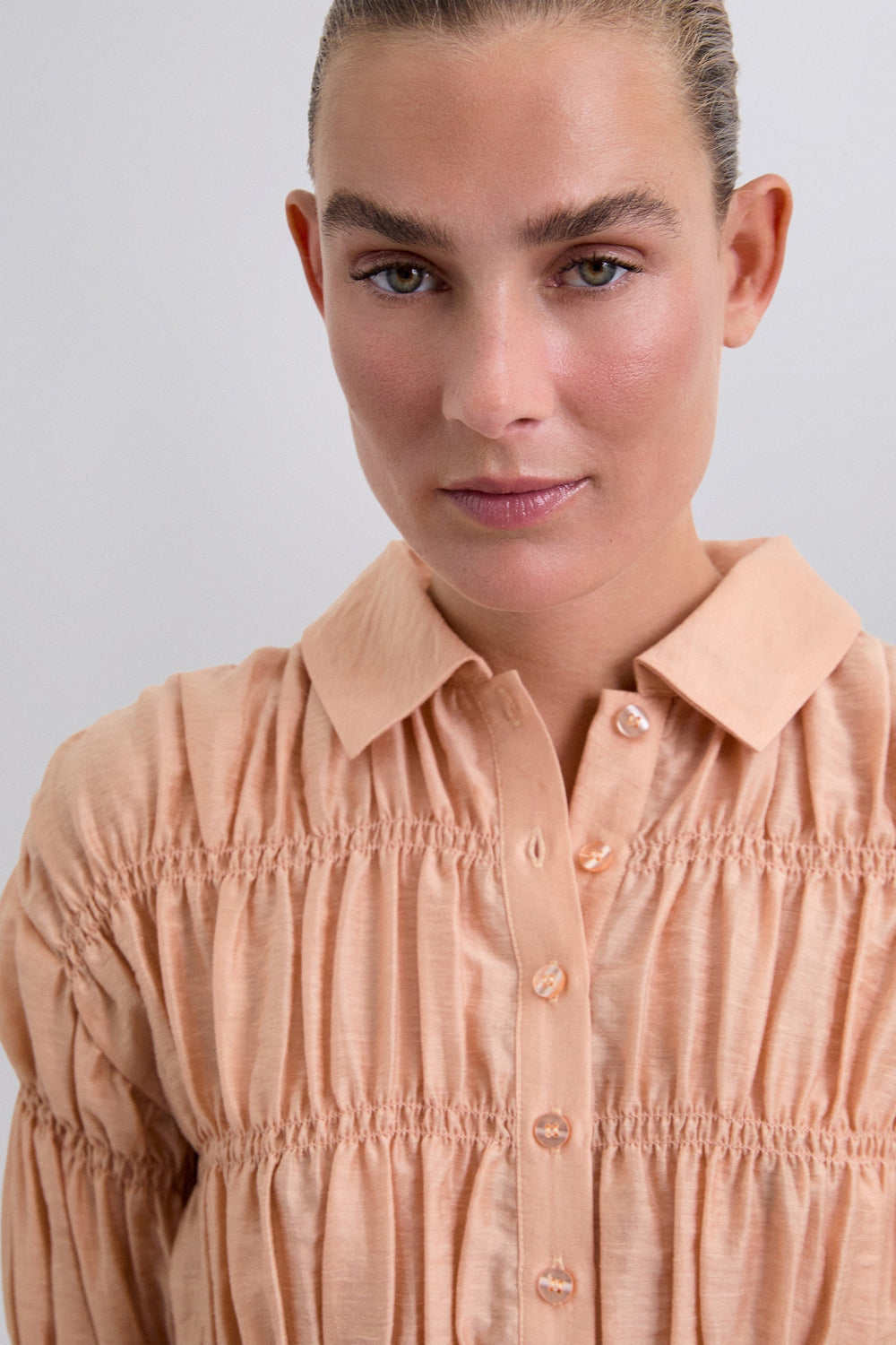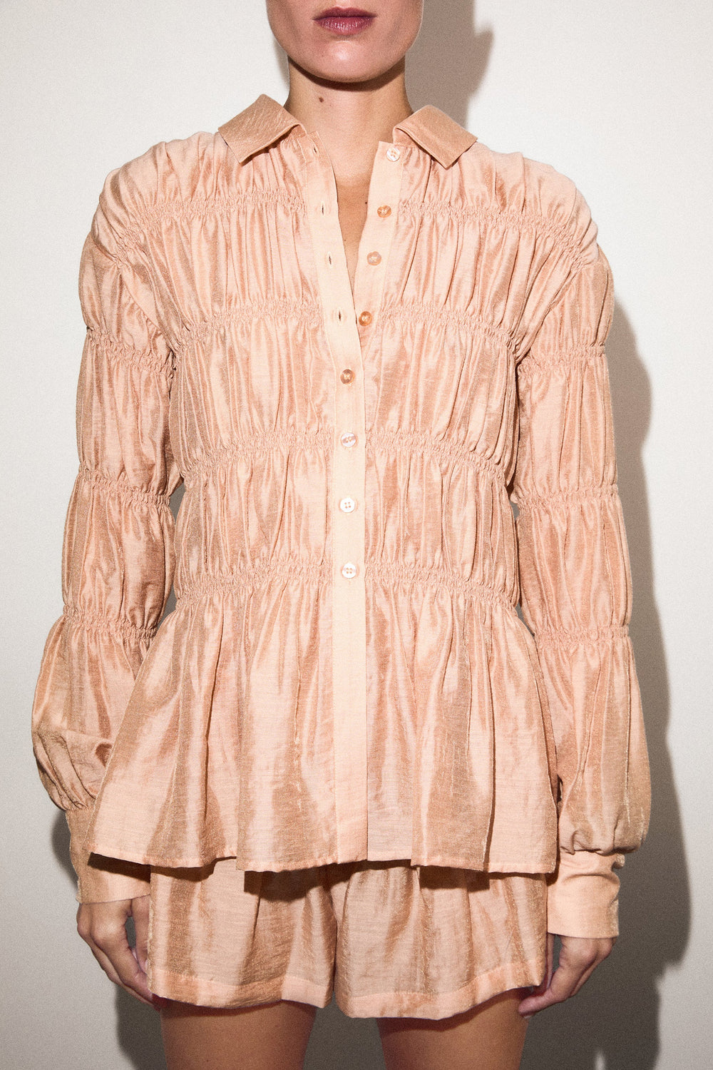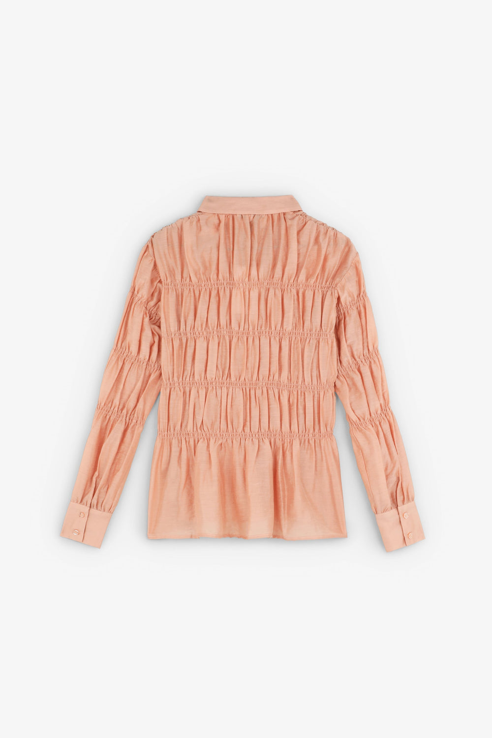 Camisa confecionada em tecido com textura. Manga comprida com smock. Fecho clássico de gola de camisa na parte frontal. Manga comprida ligeiramente abalonada.