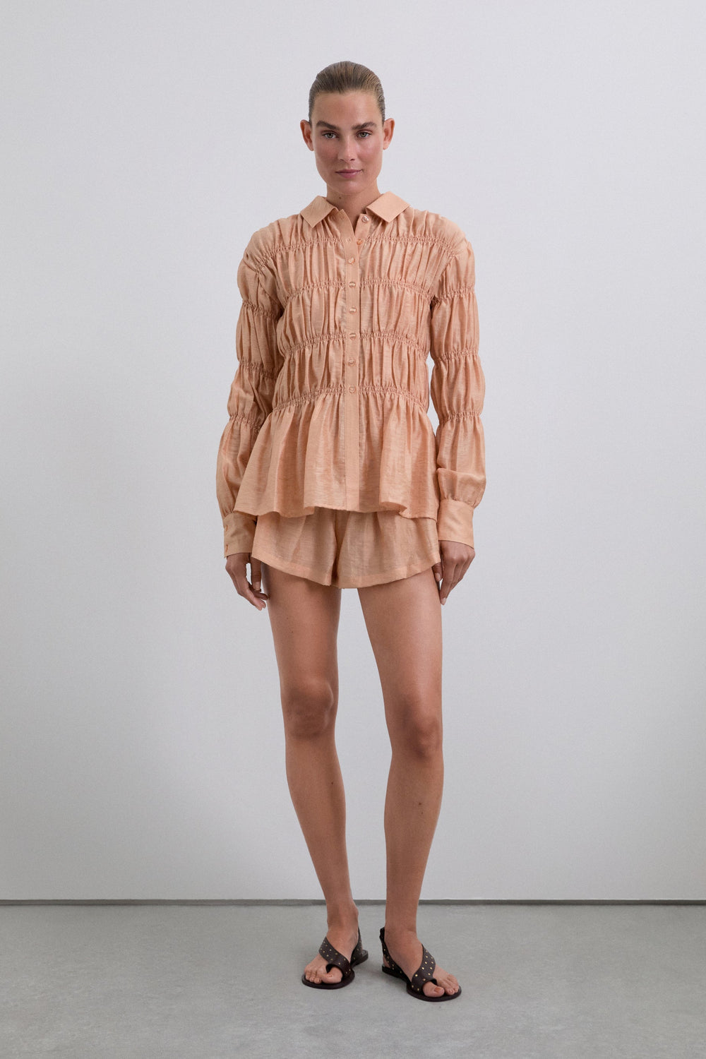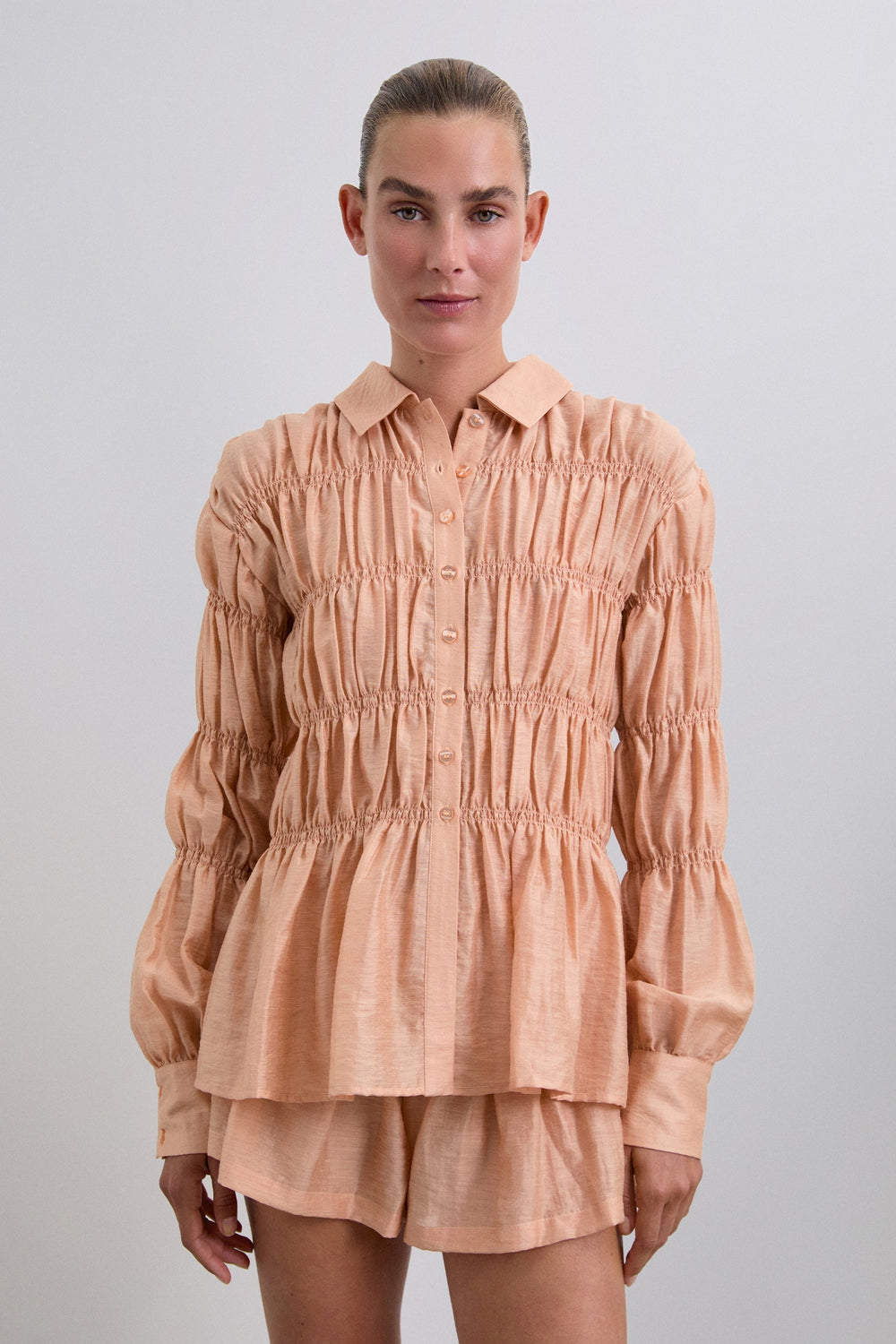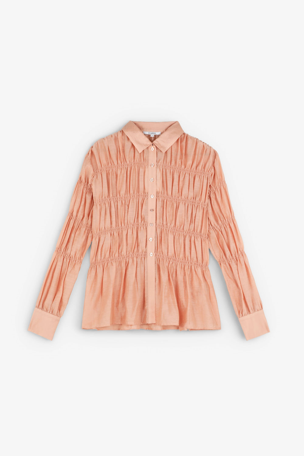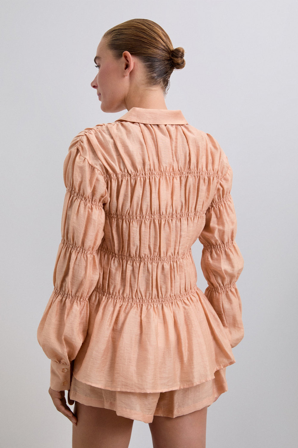 Camisa confecionada em tecido com textura. Manga comprida com smock. Fecho clássico de gola de camisa na parte frontal. Manga comprida ligeiramente abalonada.
