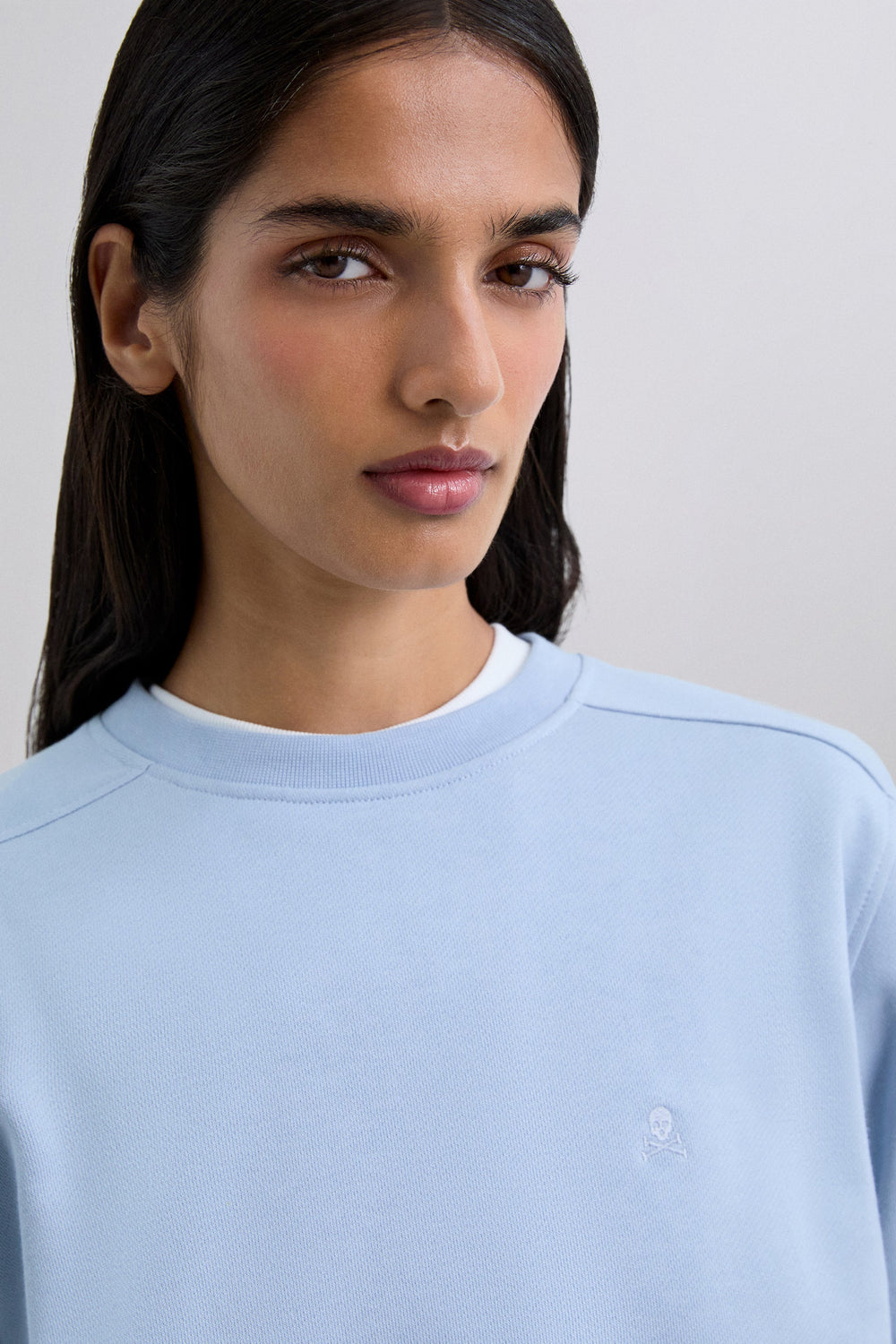 Sweatshirt confecionada em 100% algodão BCI. Corte regular fit, decote redondo e manga comprida com punhos terminados em nervuras. Bainha assimétrica, parte traseira alongada. Pormenor de skull bordada no peito.