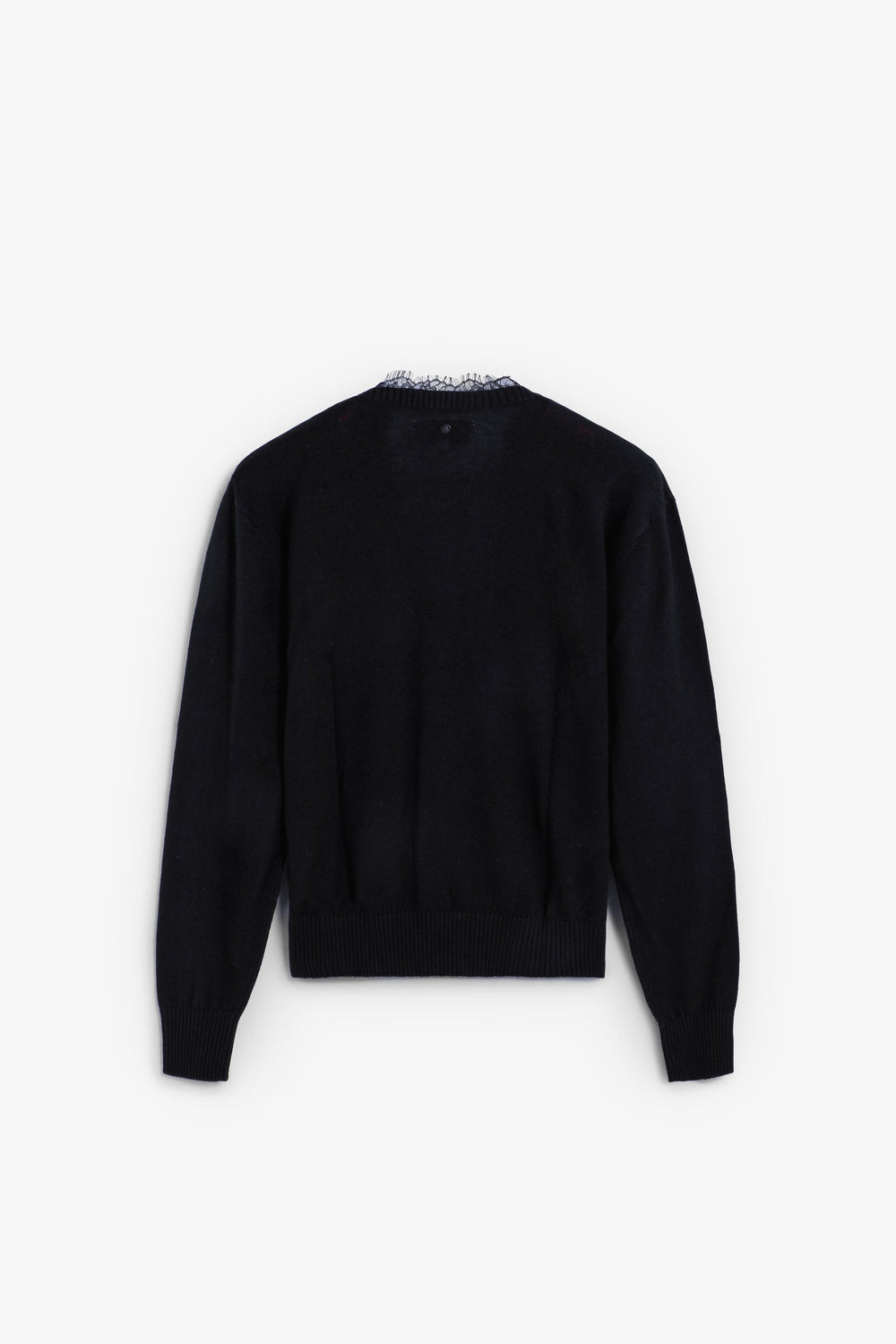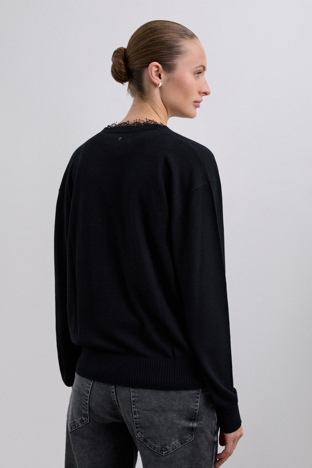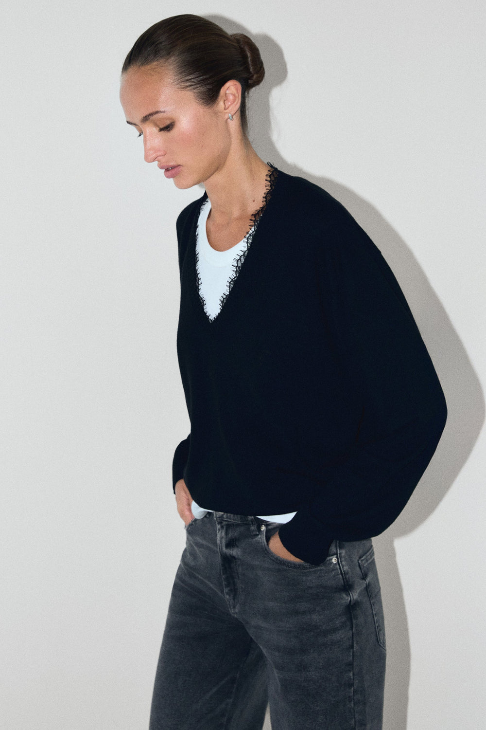 Sweater confecionada em mistura de lã e viscose. Regular fit. Decote em V com pormenores de renda. Manga comprida com punhos e bainha terminados em nervuras.