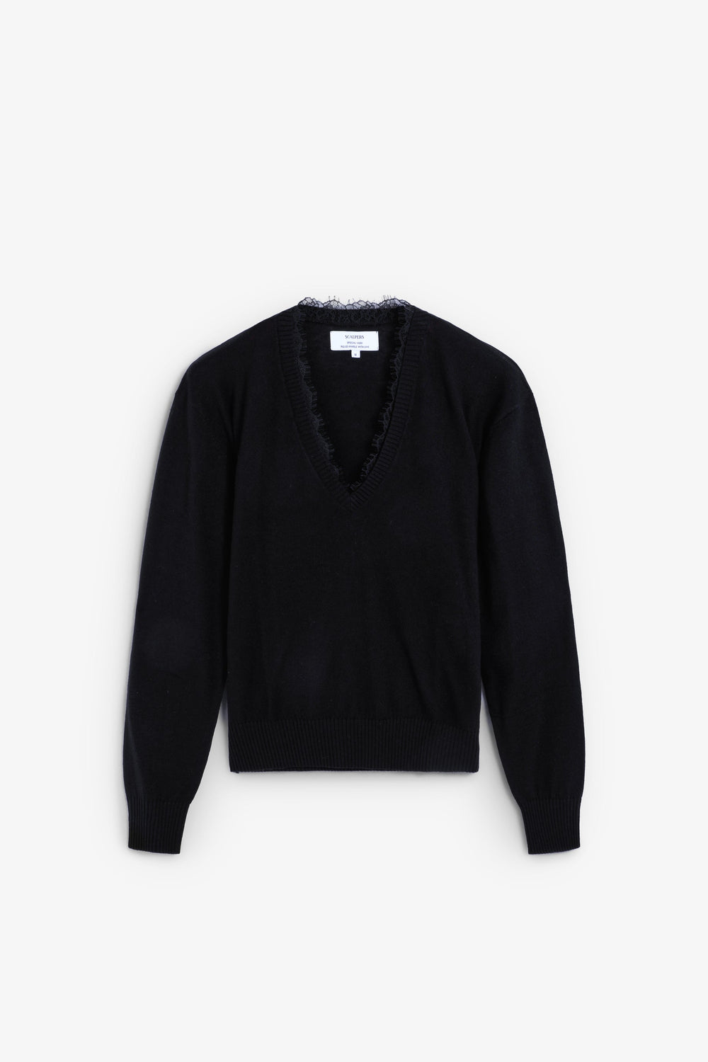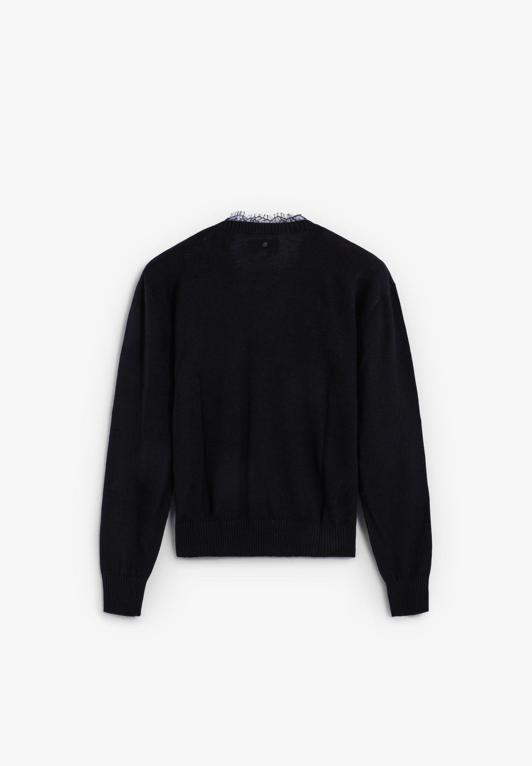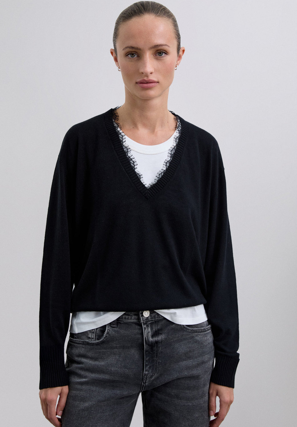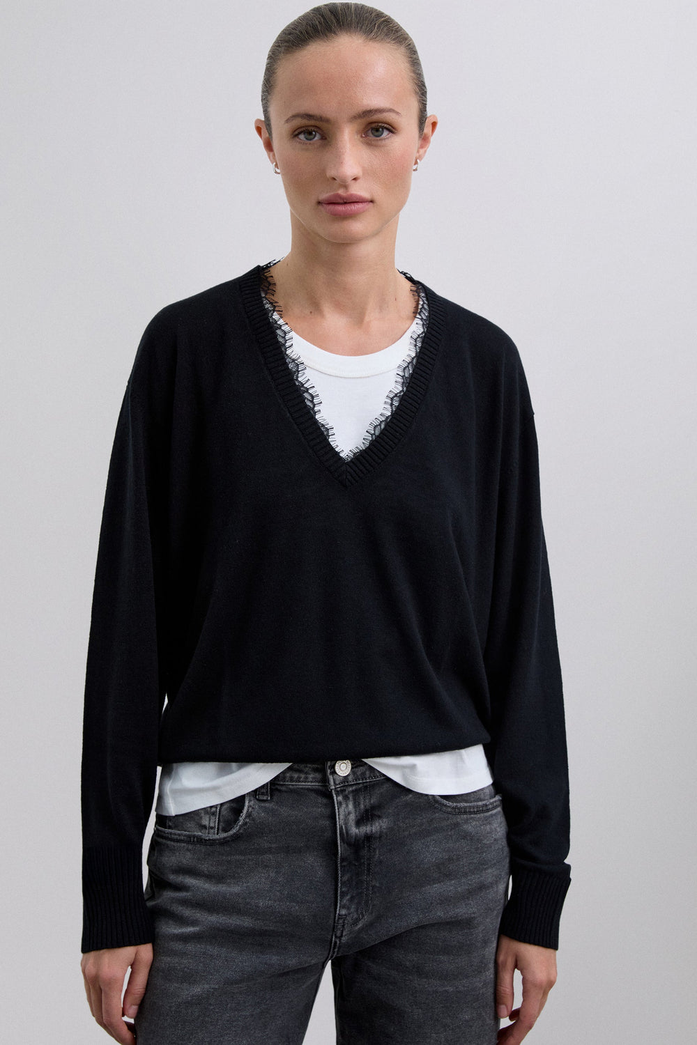 Sweater confecionada em mistura de lã e viscose. Regular fit. Decote em V com pormenores de renda. Manga comprida com punhos e bainha terminados em nervuras.