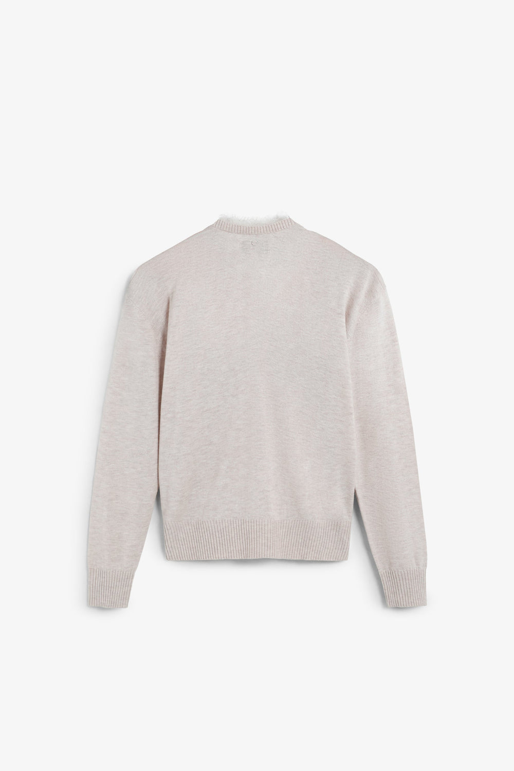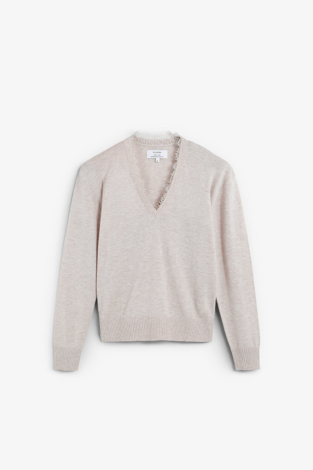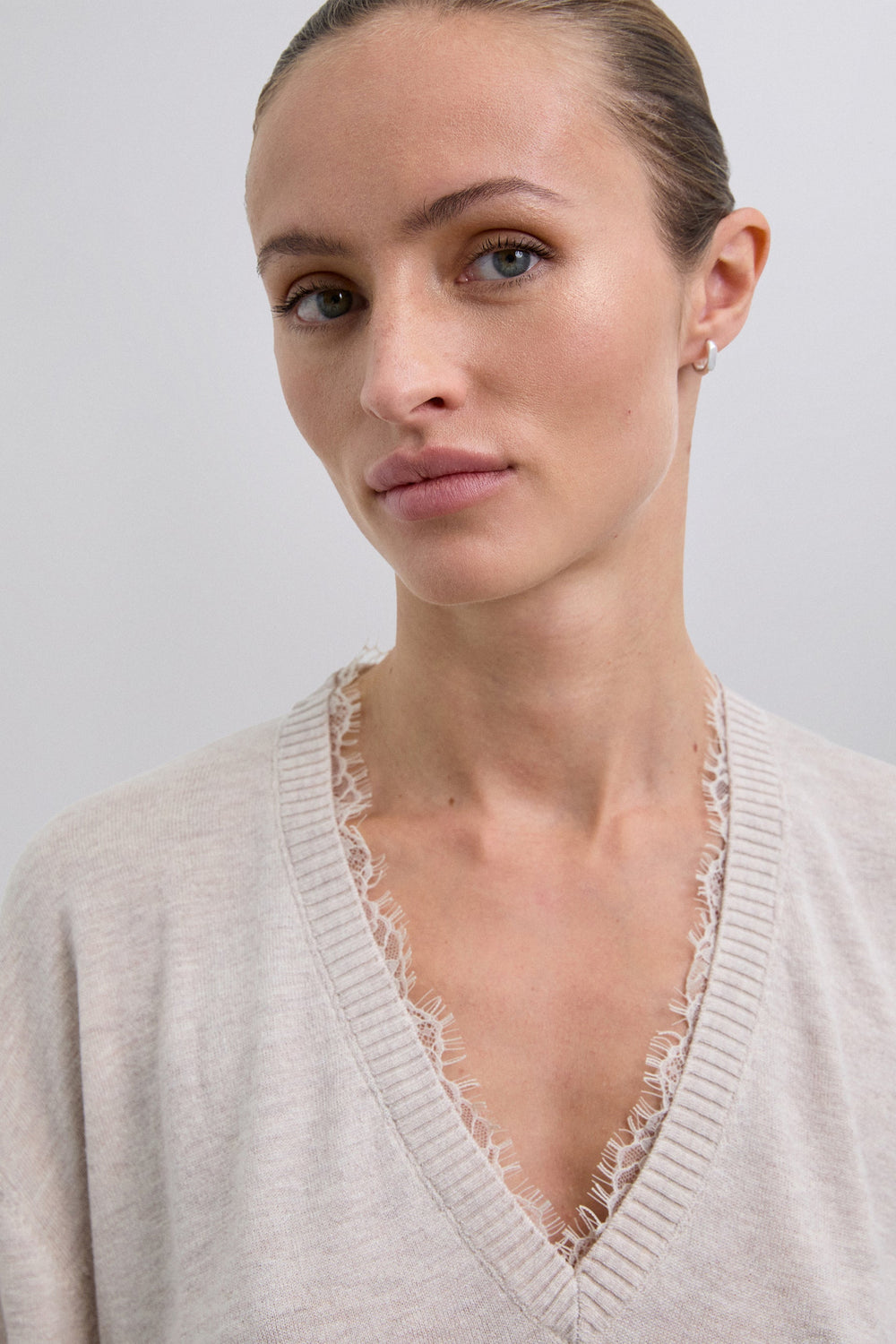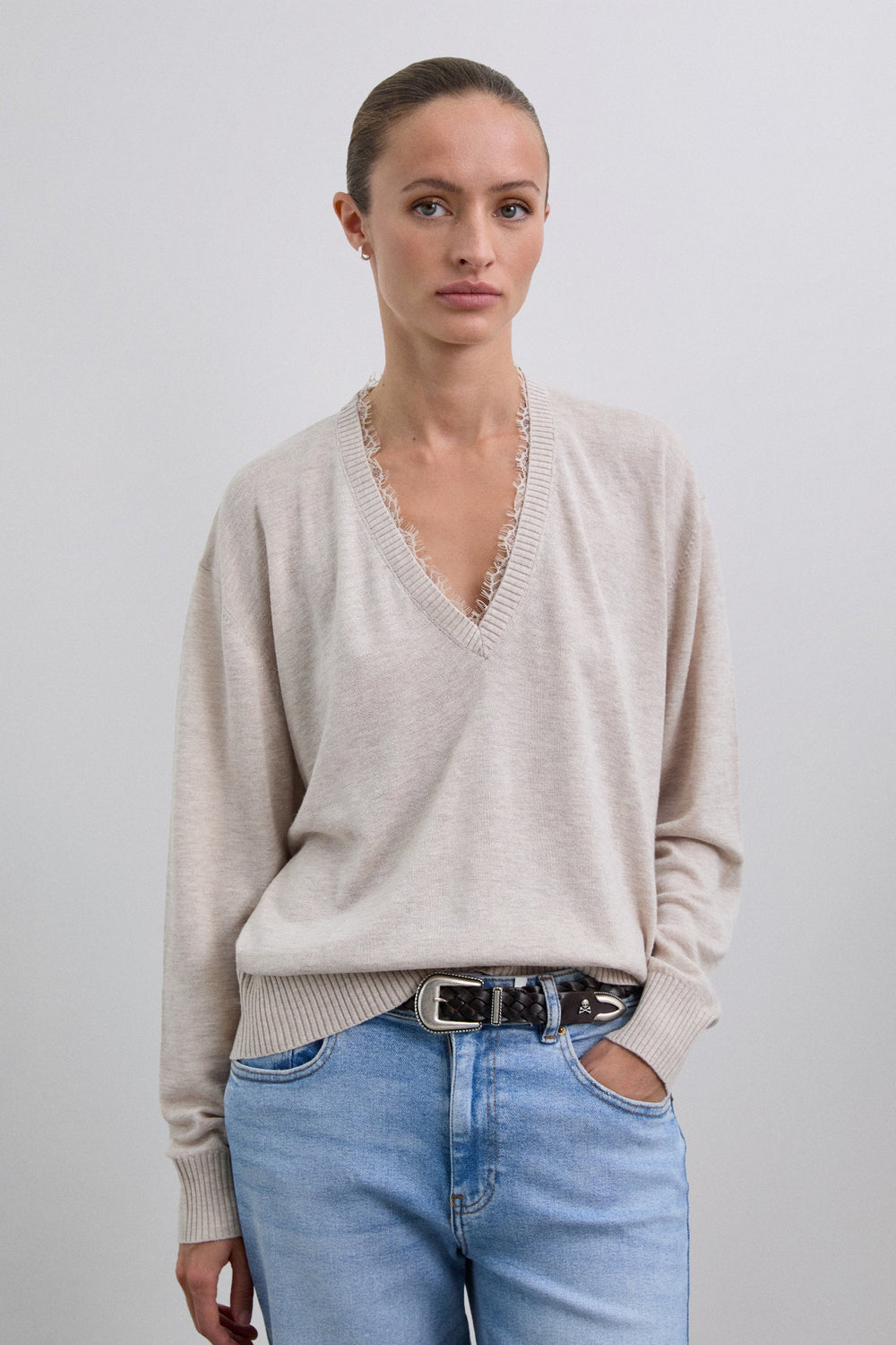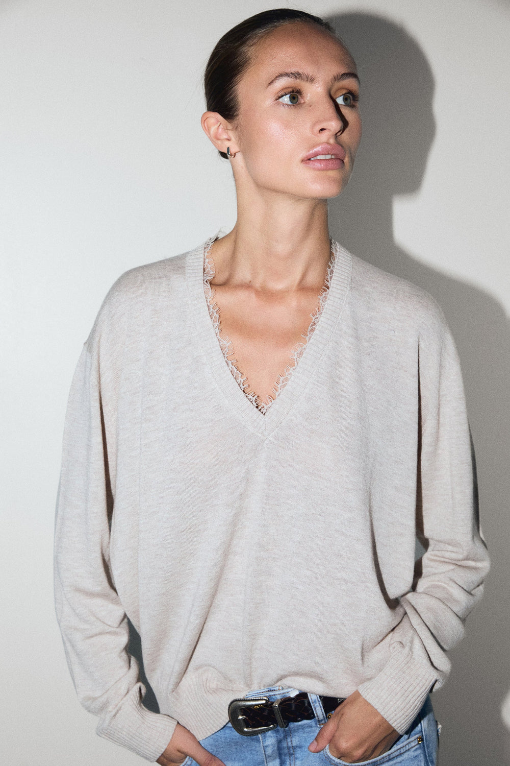 Sweater confecionada em mistura de lã e viscose. Regular fit. Decote em V com pormenores de renda. Manga comprida com punhos e bainha terminados em nervuras.