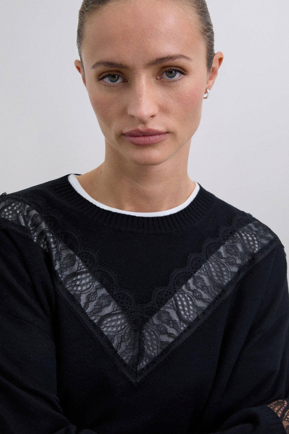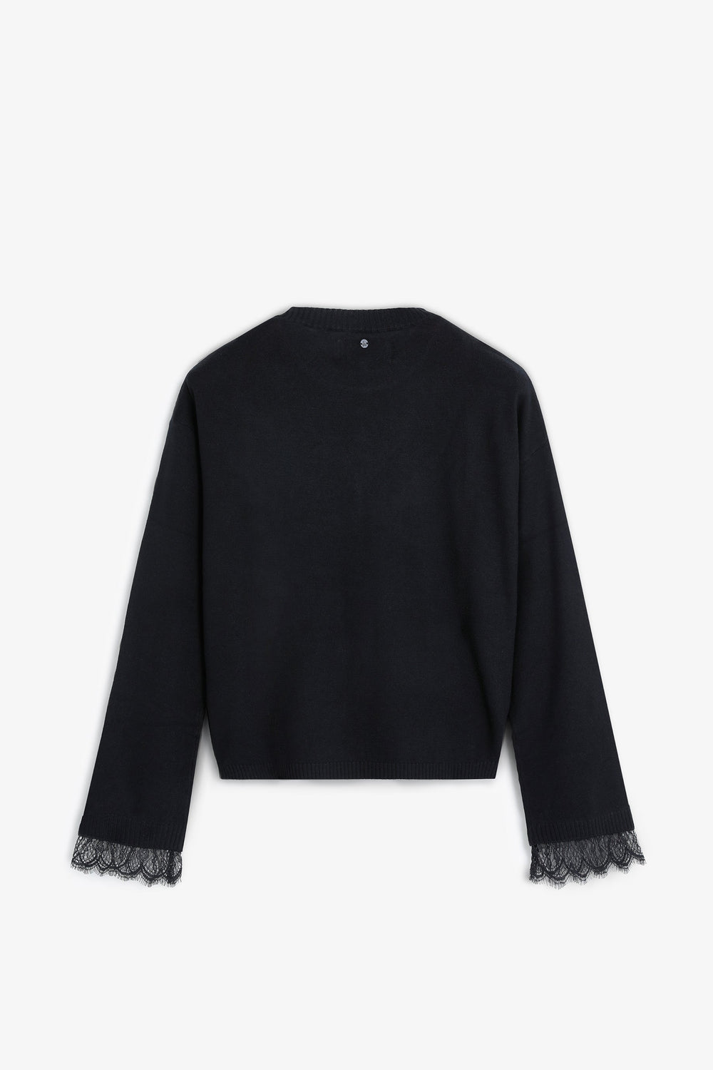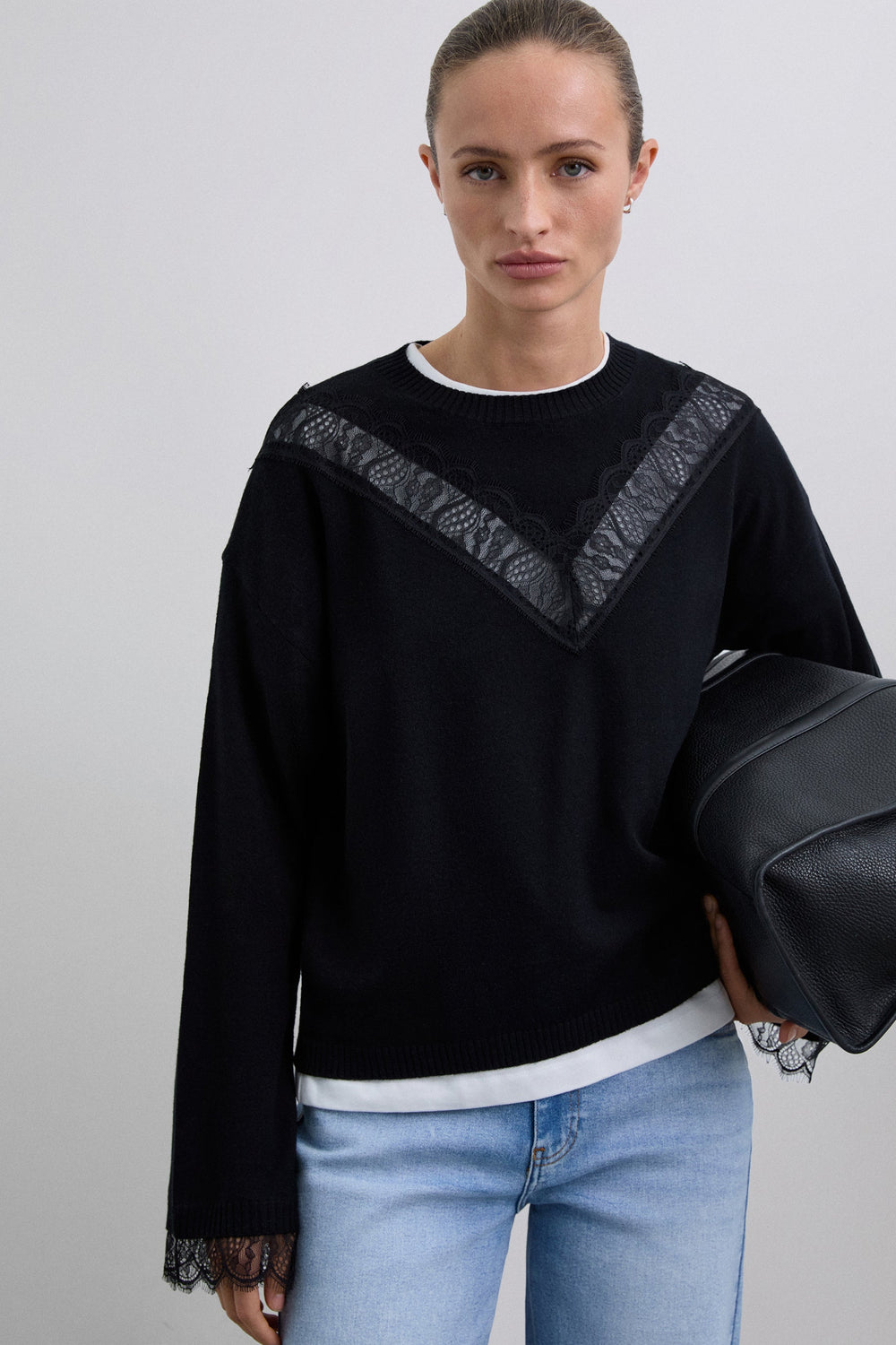 Sweater confecionada em mistura de lã e viscose. Regular fit. Decote redondo e manga comprida com acabamentos em nervuras. Pormenores de renda no peito e na parte inferior das mangas.