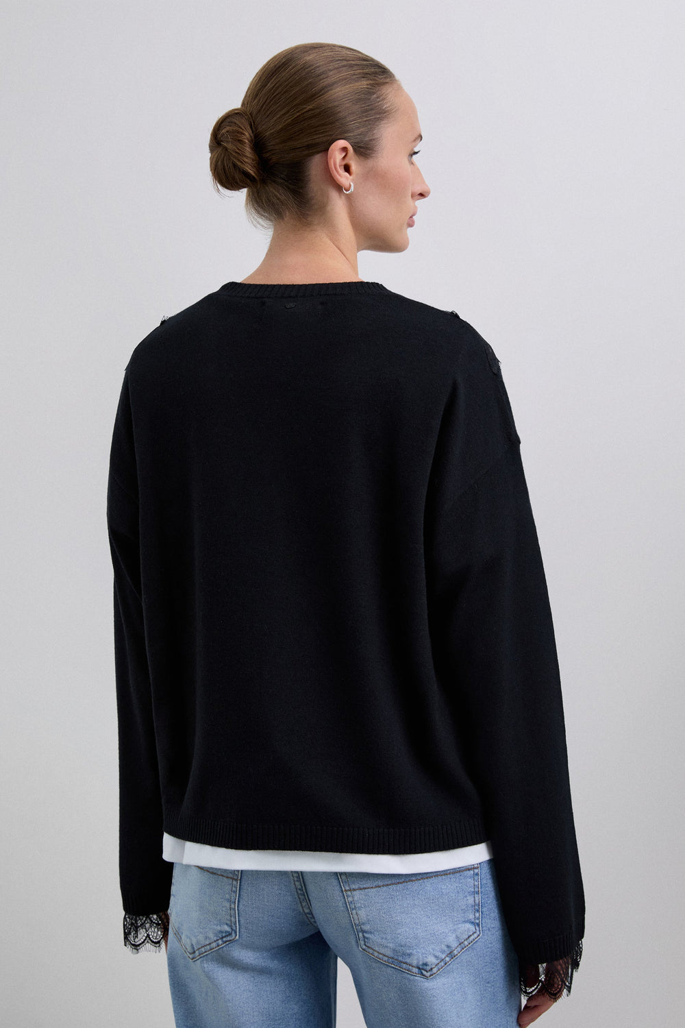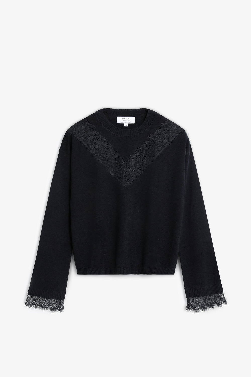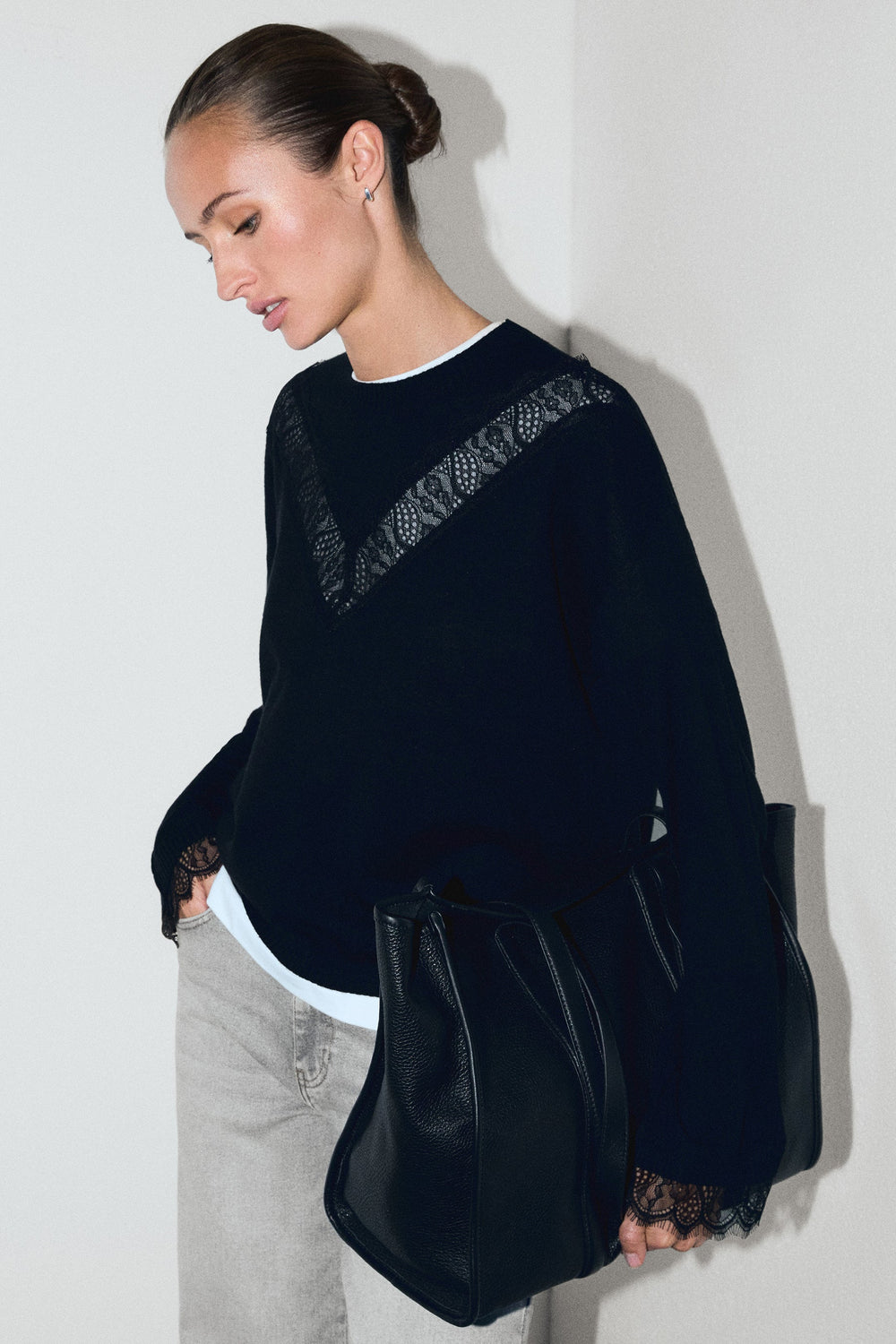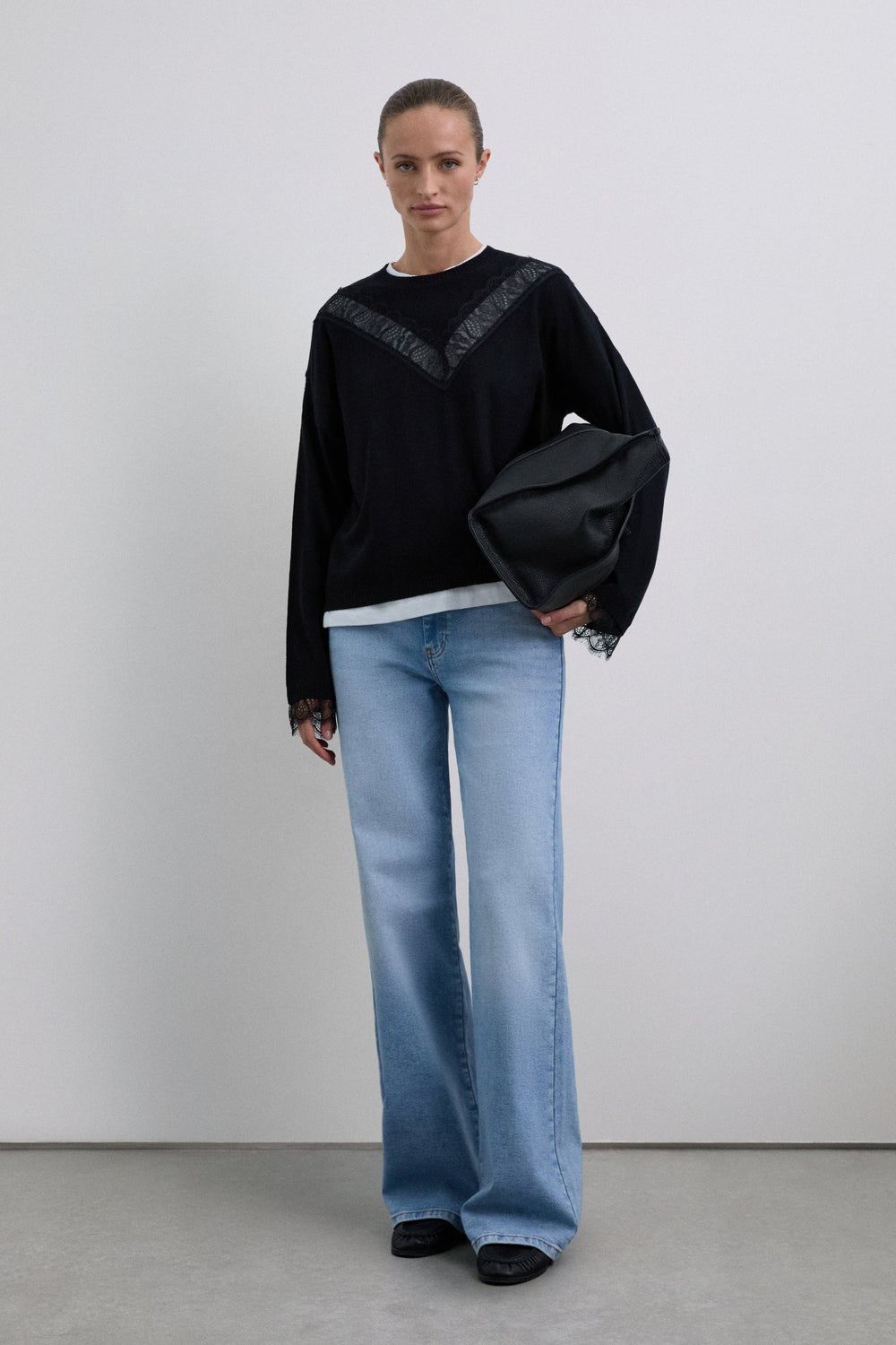 Sweater confecionada em mistura de lã e viscose. Regular fit. Decote redondo e manga comprida com acabamentos em nervuras. Pormenores de renda no peito e na parte inferior das mangas.