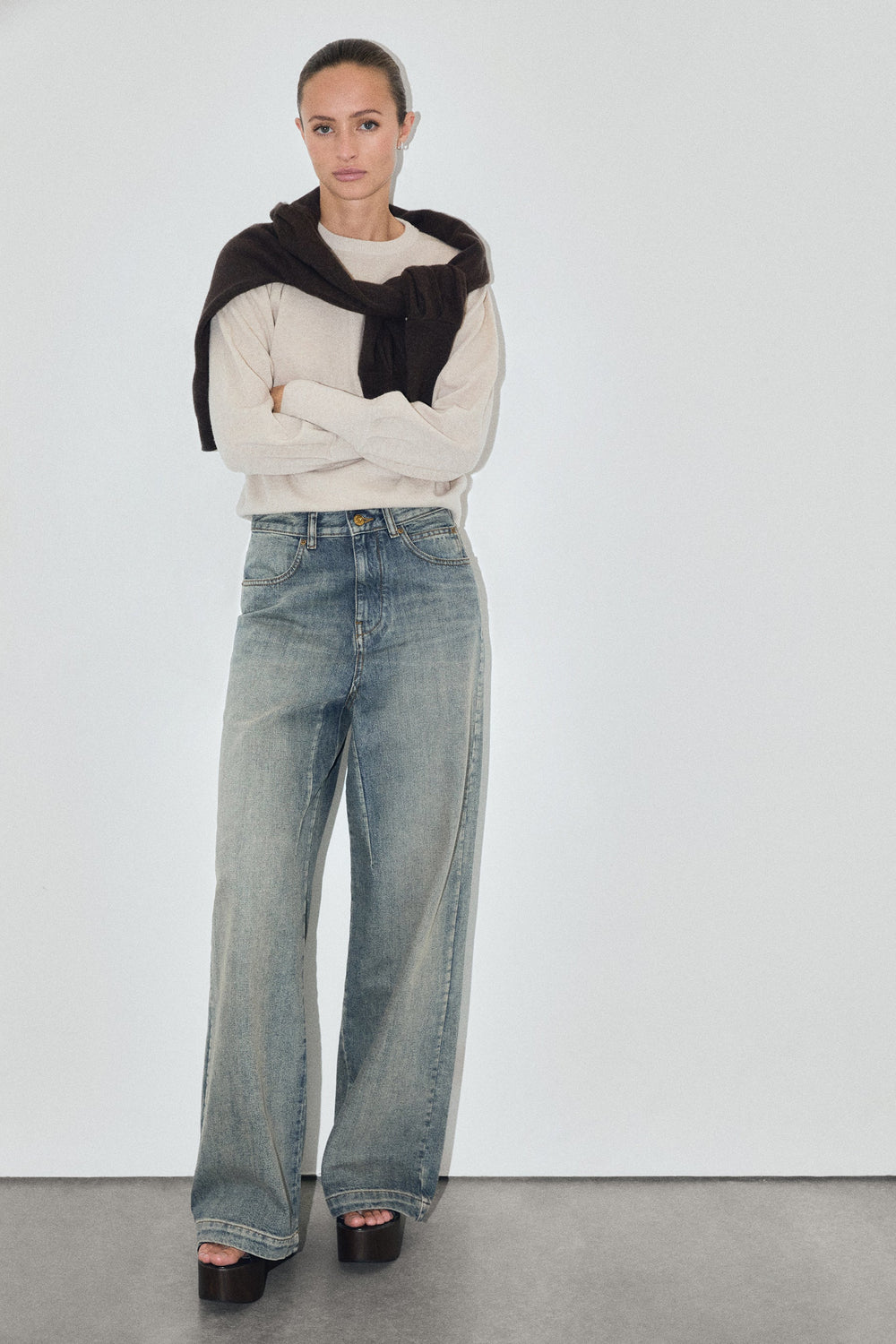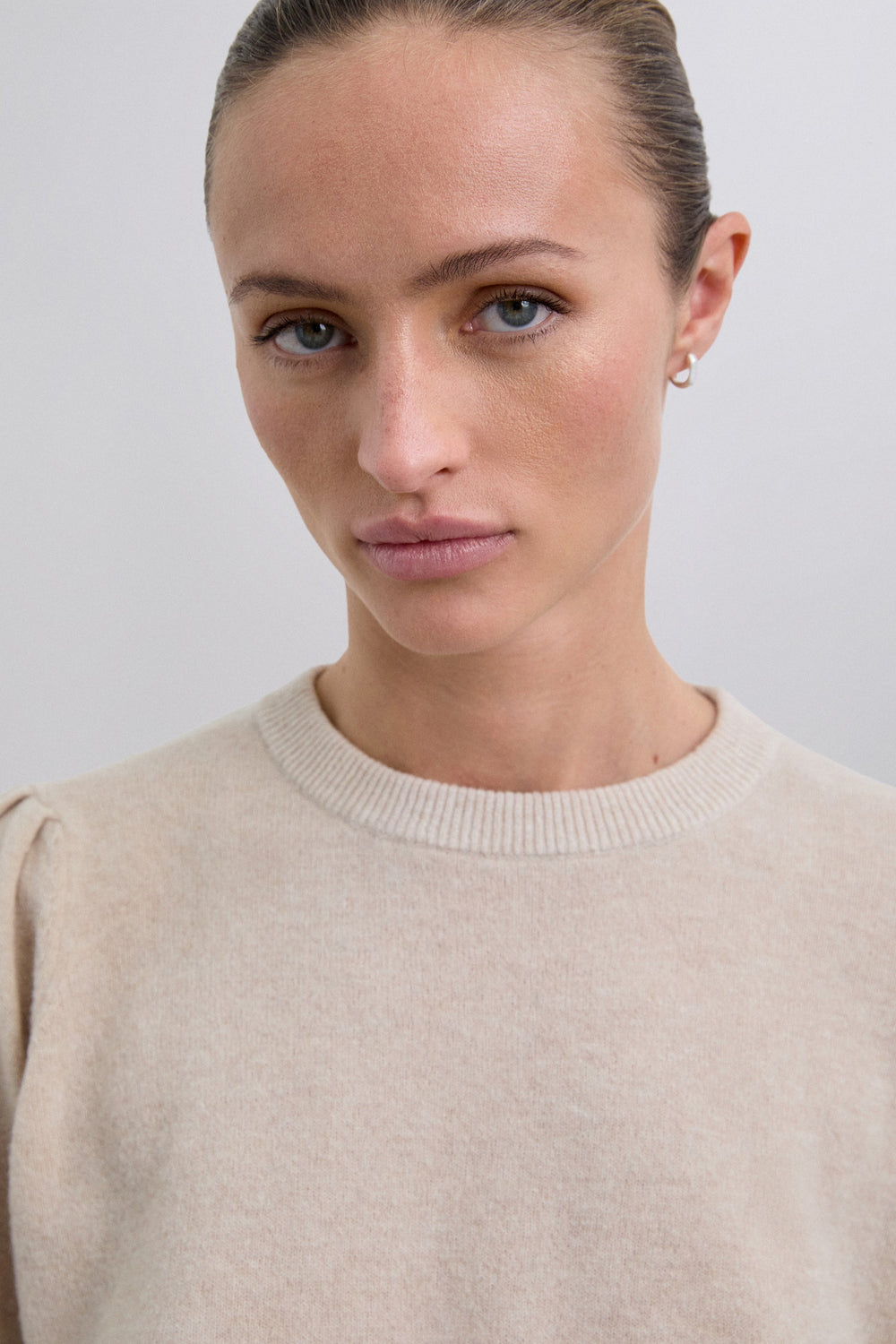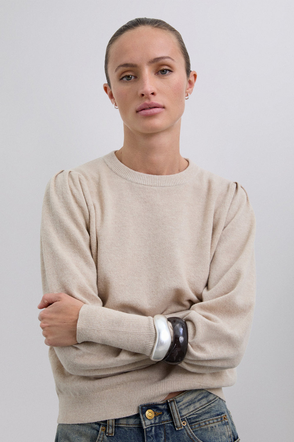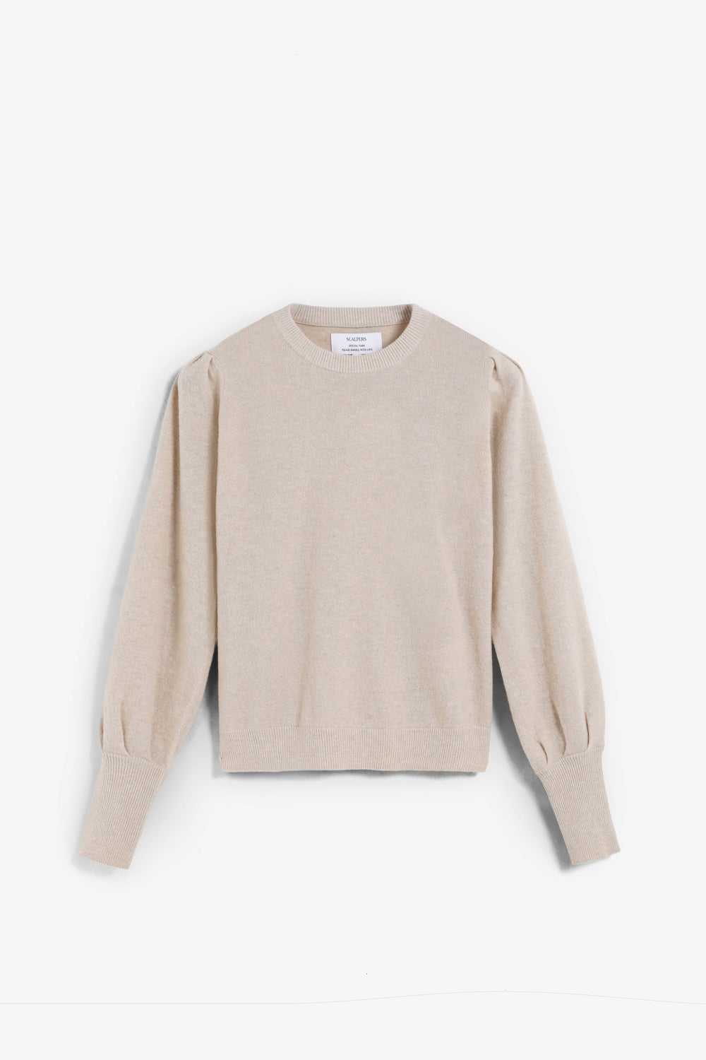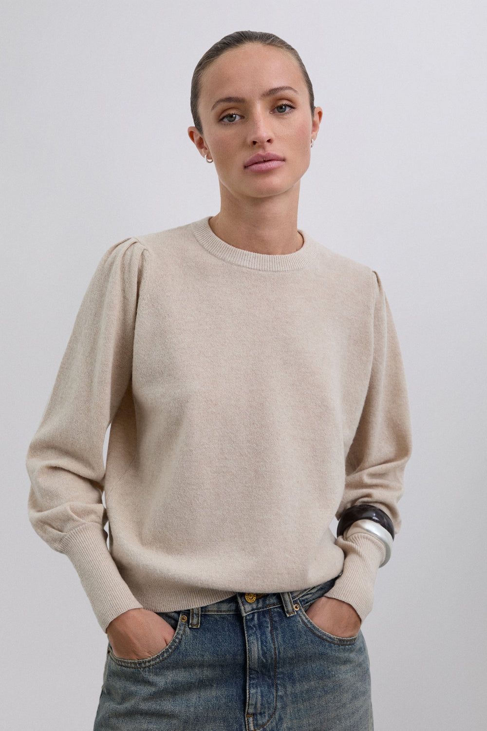 Sweater confecionada em mistura com lã. Regular fit. Decote redondo. Manga comprida ligeiramente abalonada com punhos terminados em nervuras.