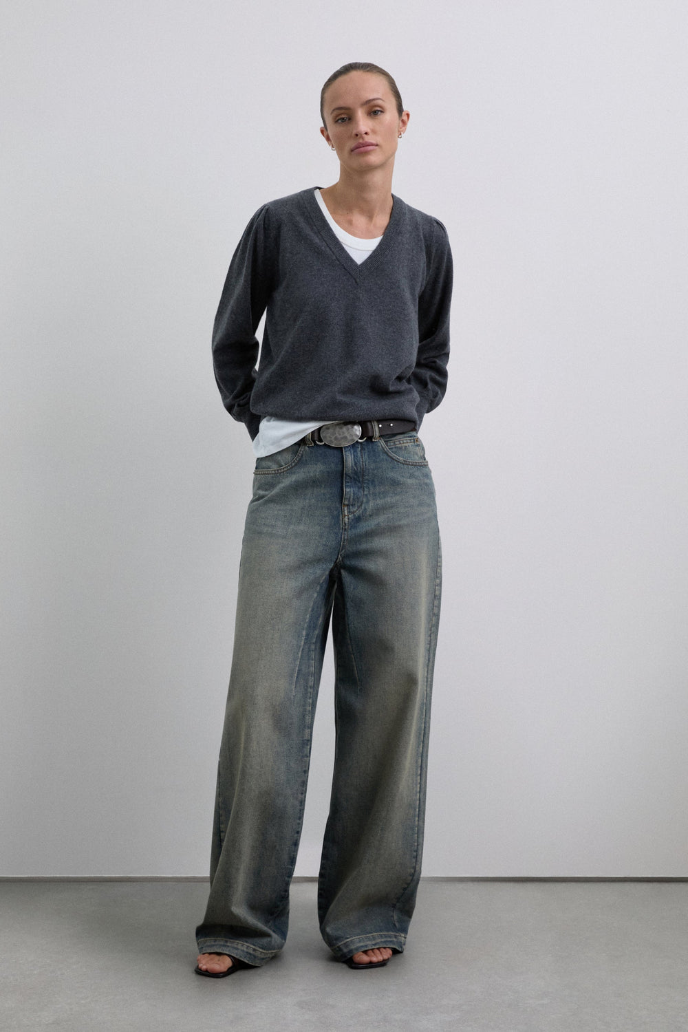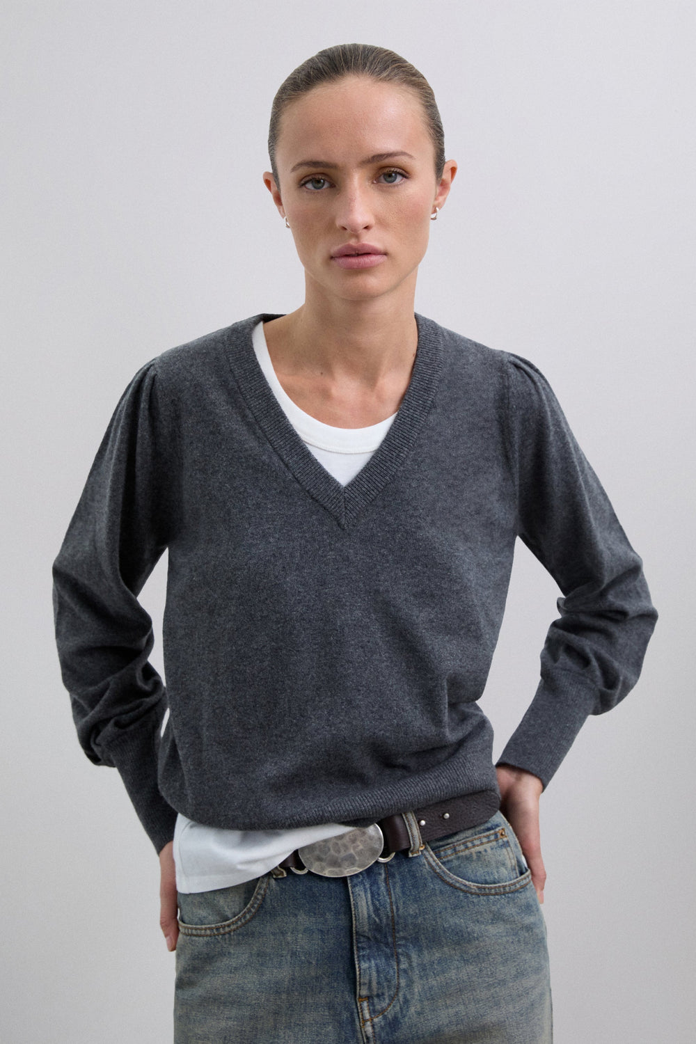 Sweater confecionada em mistura de lã com decote em V. Regular fit. Manga comprida ligeiramente abalonada terminada em punho com nervuras. Pormenor de skull bordada no tom na parte de trás.