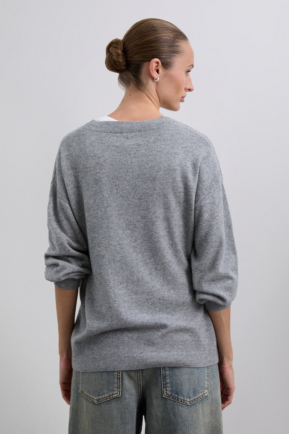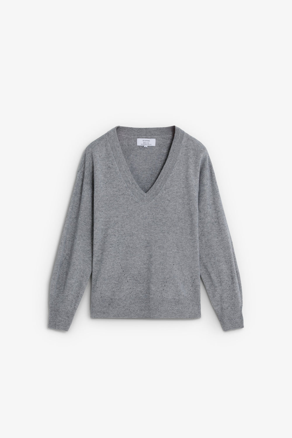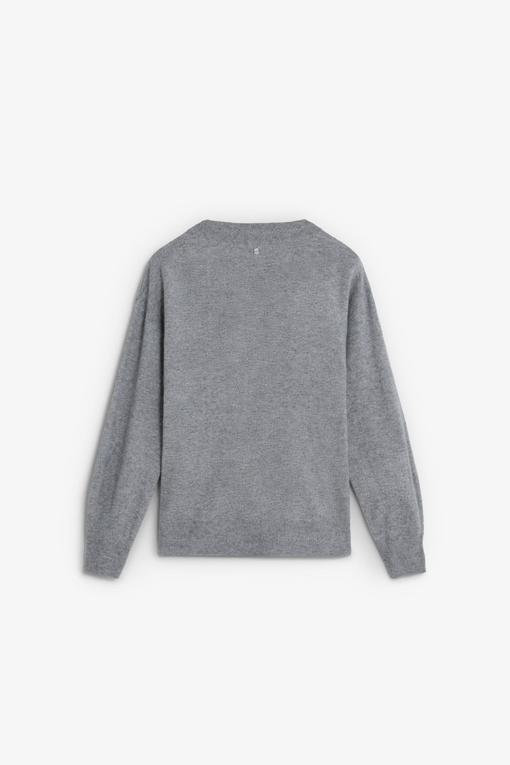 Camisola confecionada em lã. Decote em V com um ajuste ligeiramente folgado. Pormenores de mini furos junto à bainha superior. Acabamentos em nervuras na gola, nos punhos e na cintura. Pormenor do placa metálica com logótipo atrás.