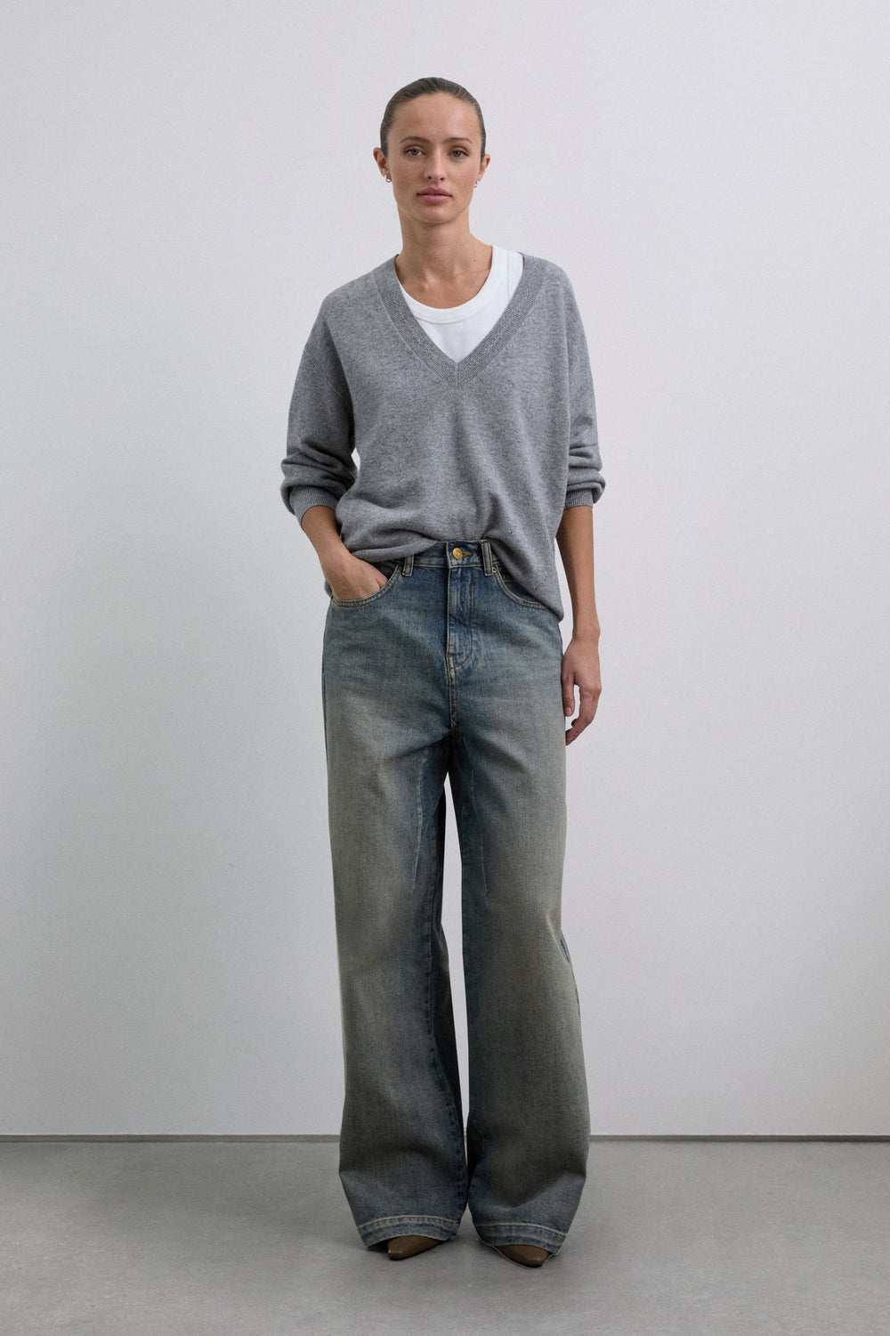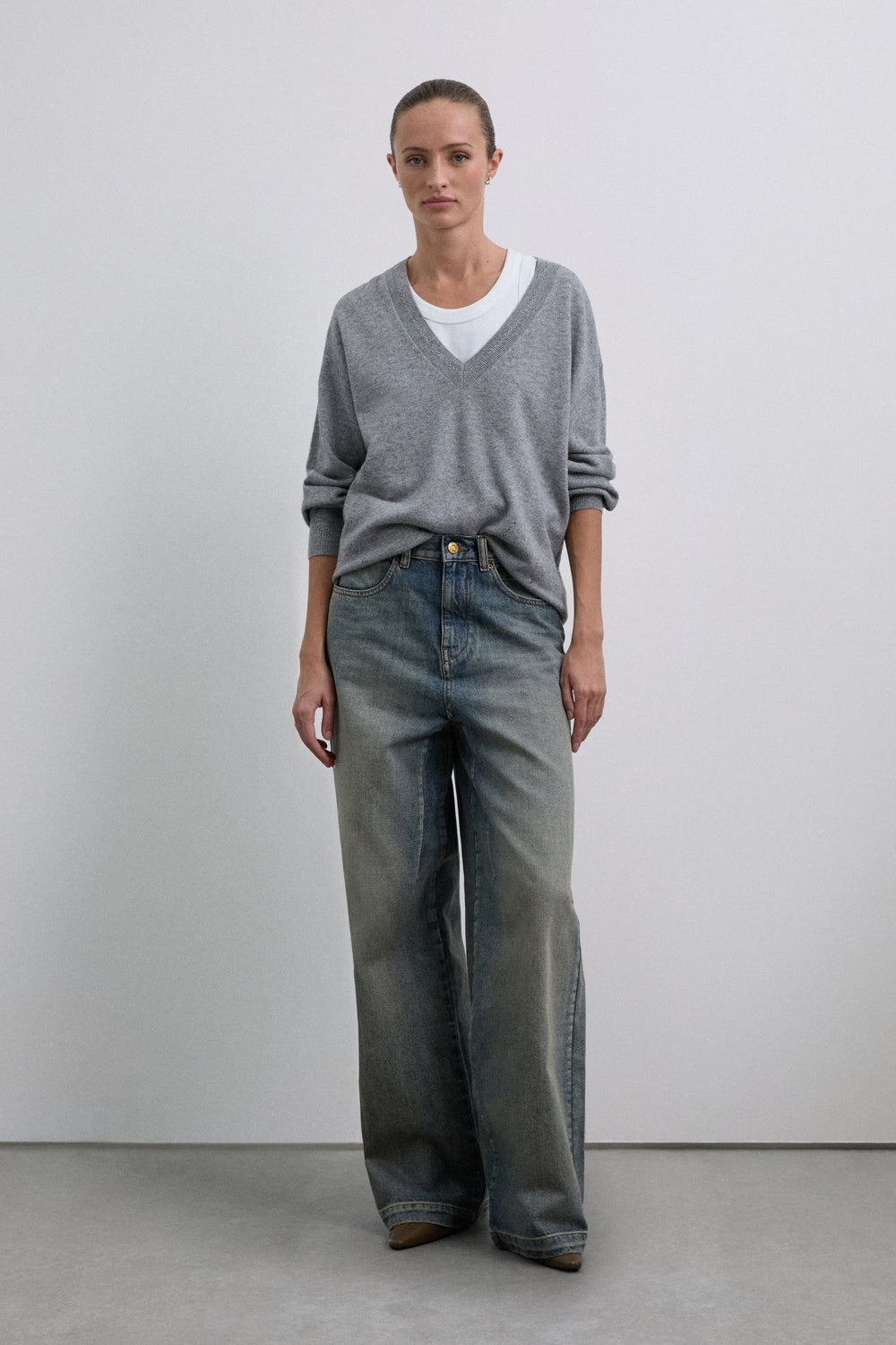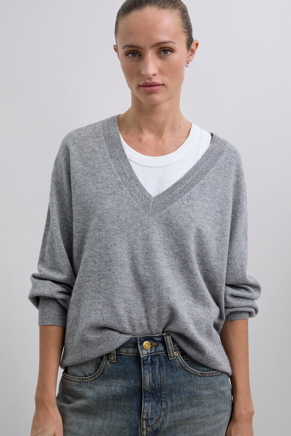 Camisola confecionada em lã. Decote em V com um ajuste ligeiramente folgado. Pormenores de mini furos junto à bainha superior. Acabamentos em nervuras na gola, nos punhos e na cintura. Pormenor do placa metálica com logótipo atrás.