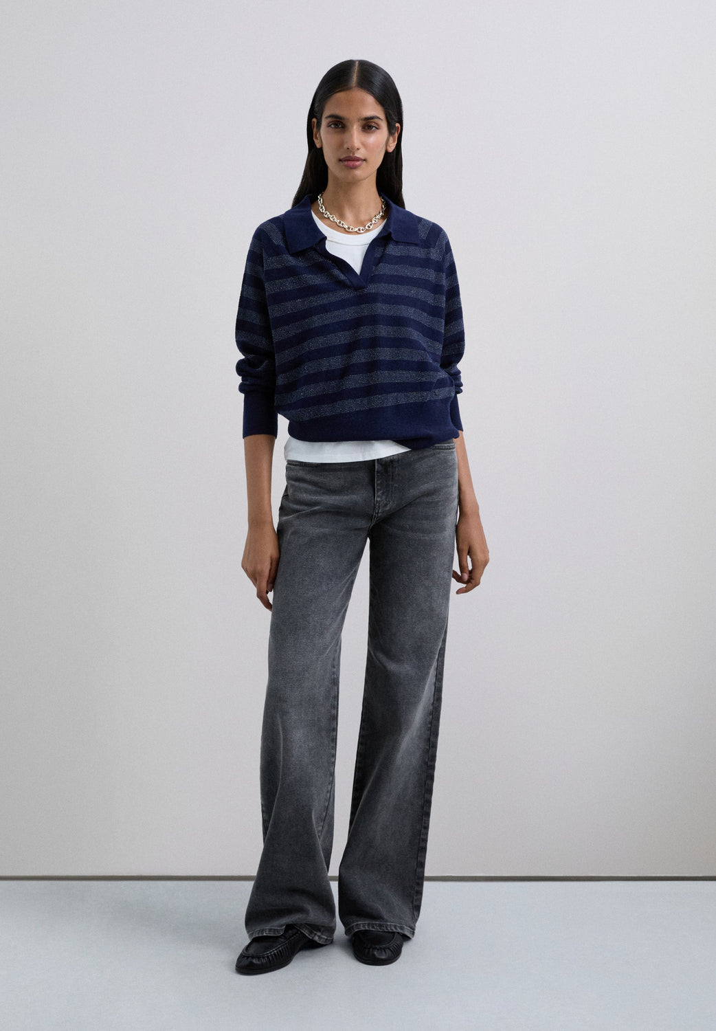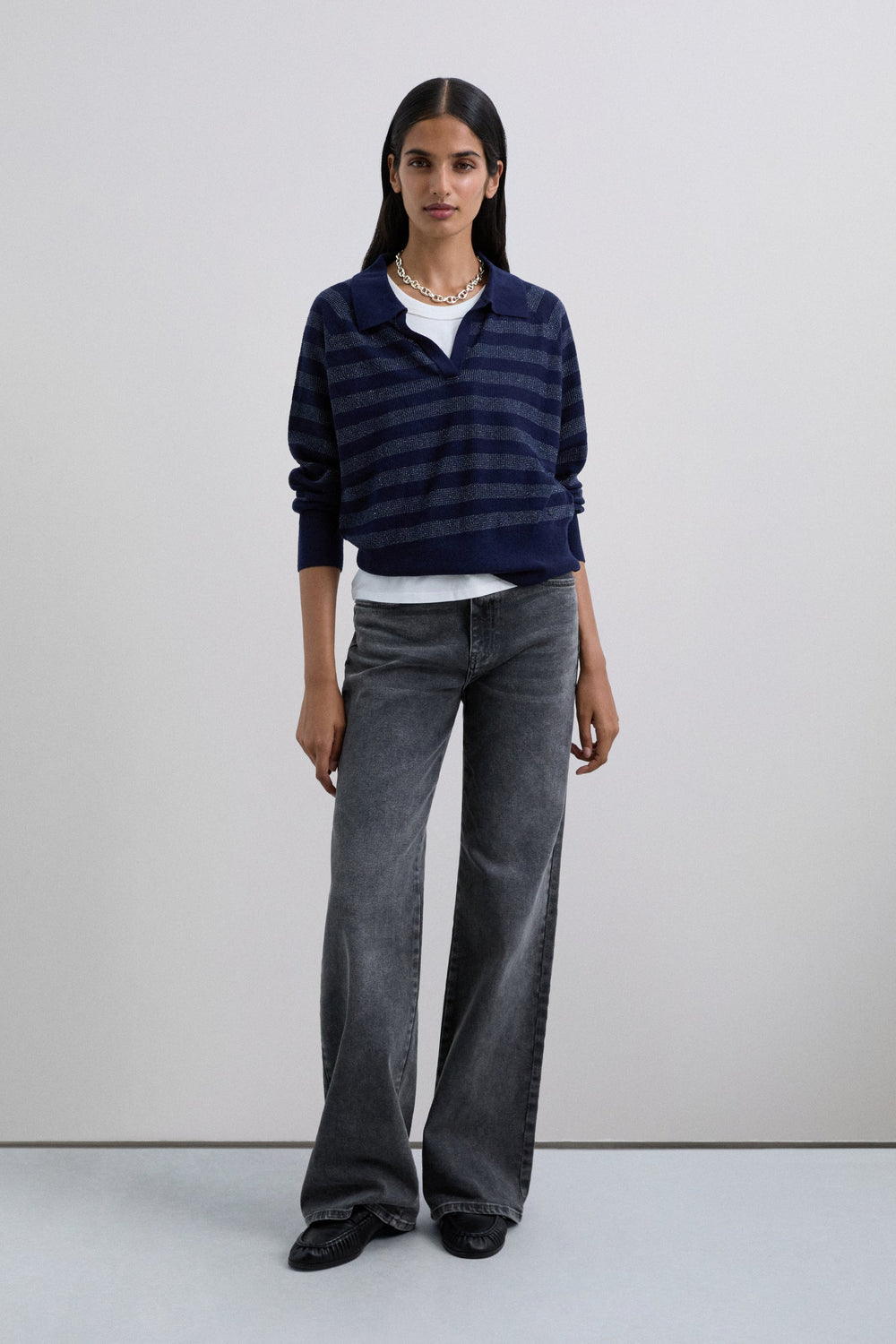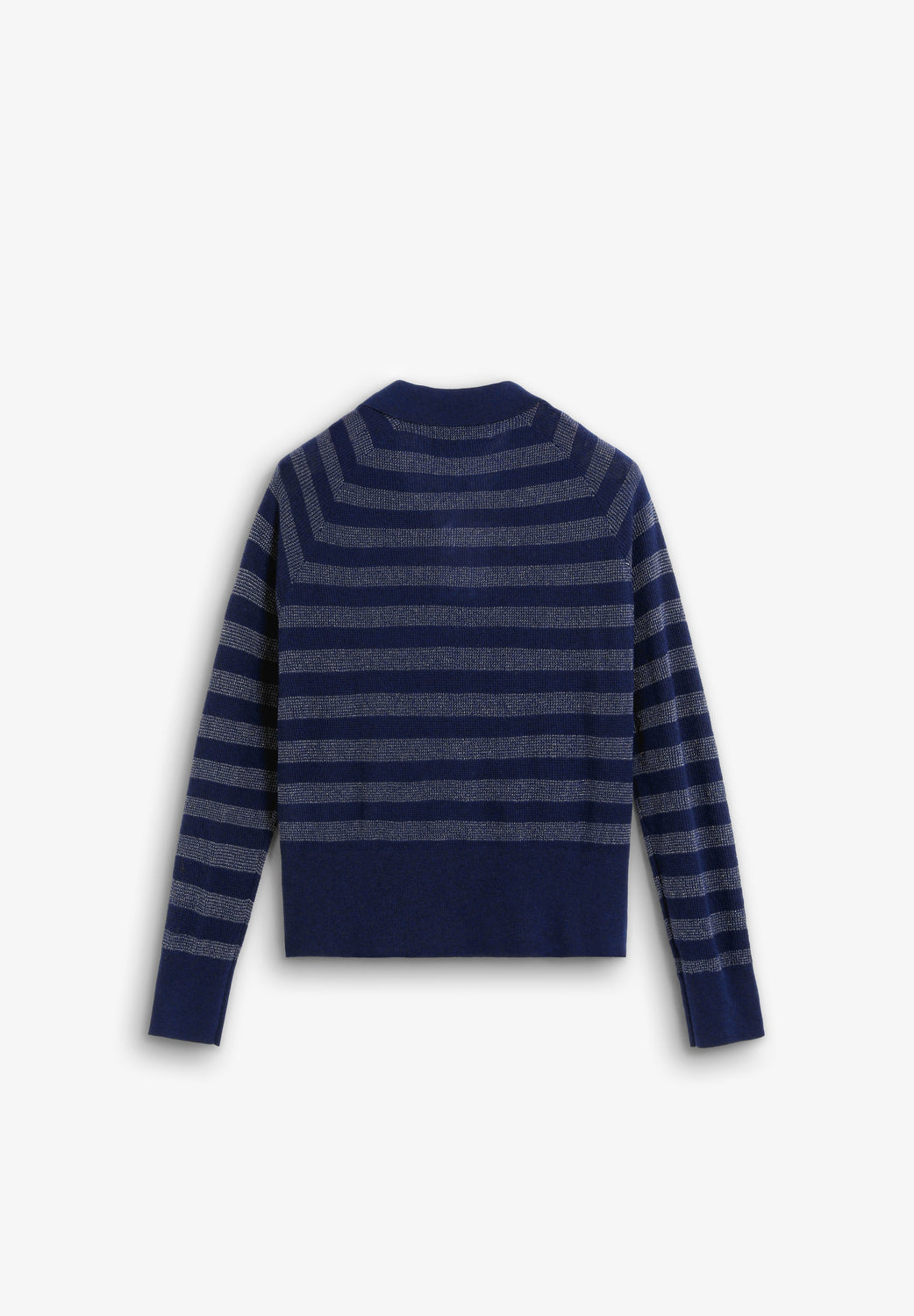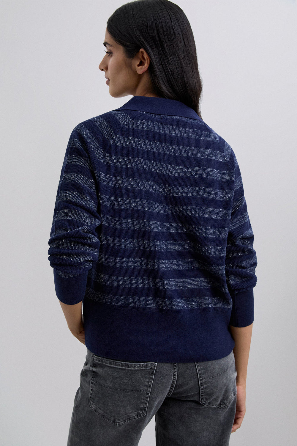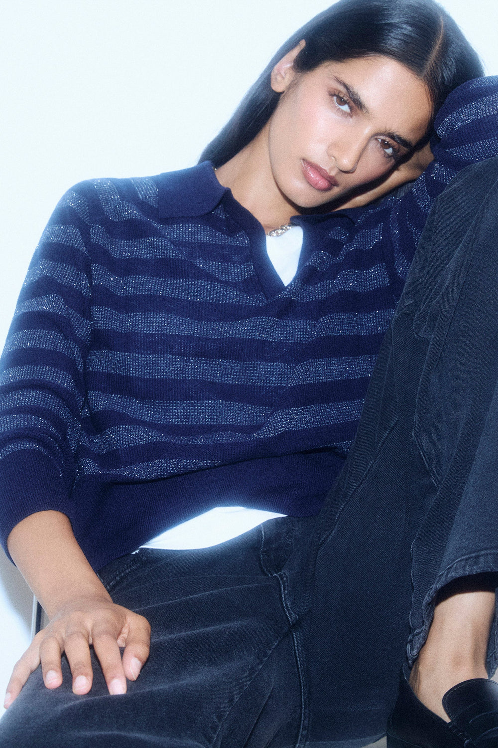 Sweater tipo camisa polo confecionada em mistura com lã. Regular fit. Padrão às riscas com fio metalizado. Gola t-shirt. Manga comprida com punhos terminados em nervuras.